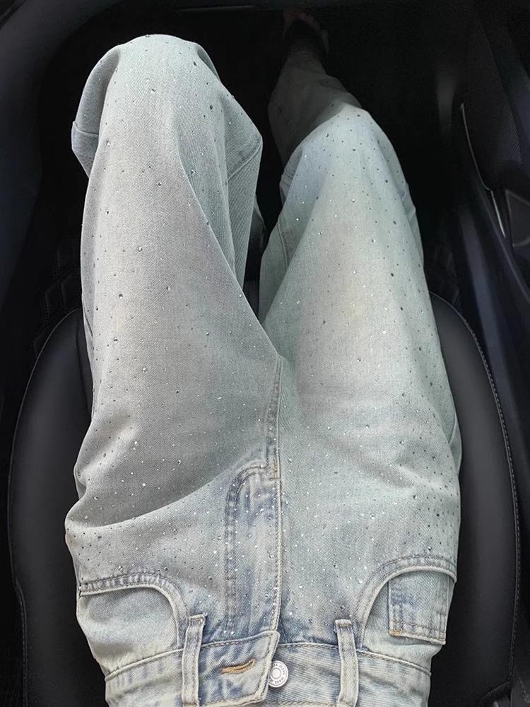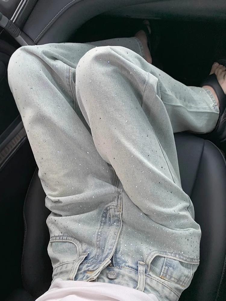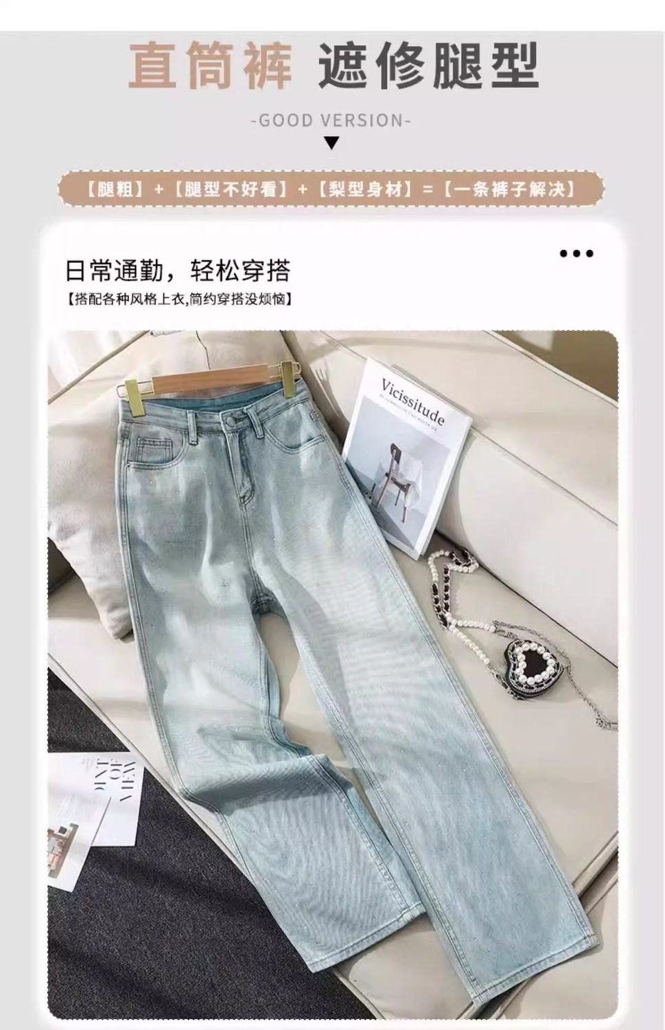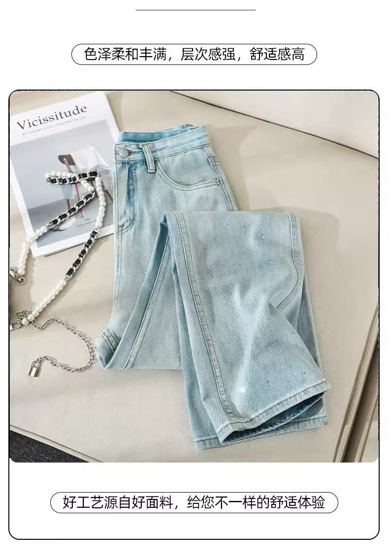 레트로 라이트 컬러 중공업 핫 드릴링 스트레이트 청바지 여성 2025 봄 디자인 센스 높은 허리 슬리밍 캐주얼 와이드 레그 바지