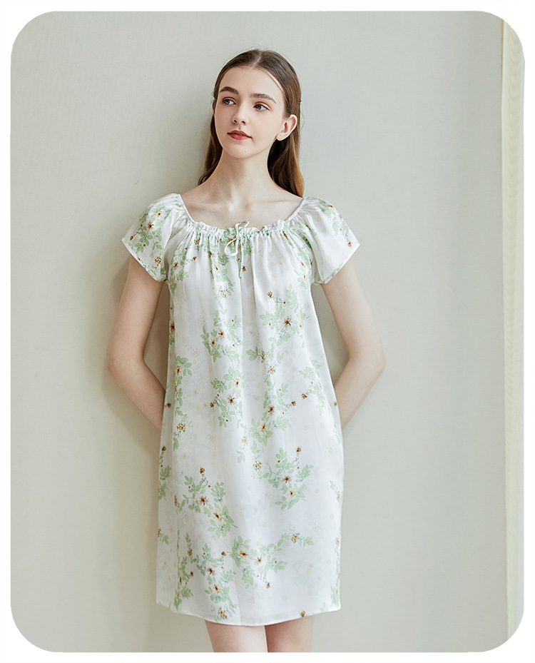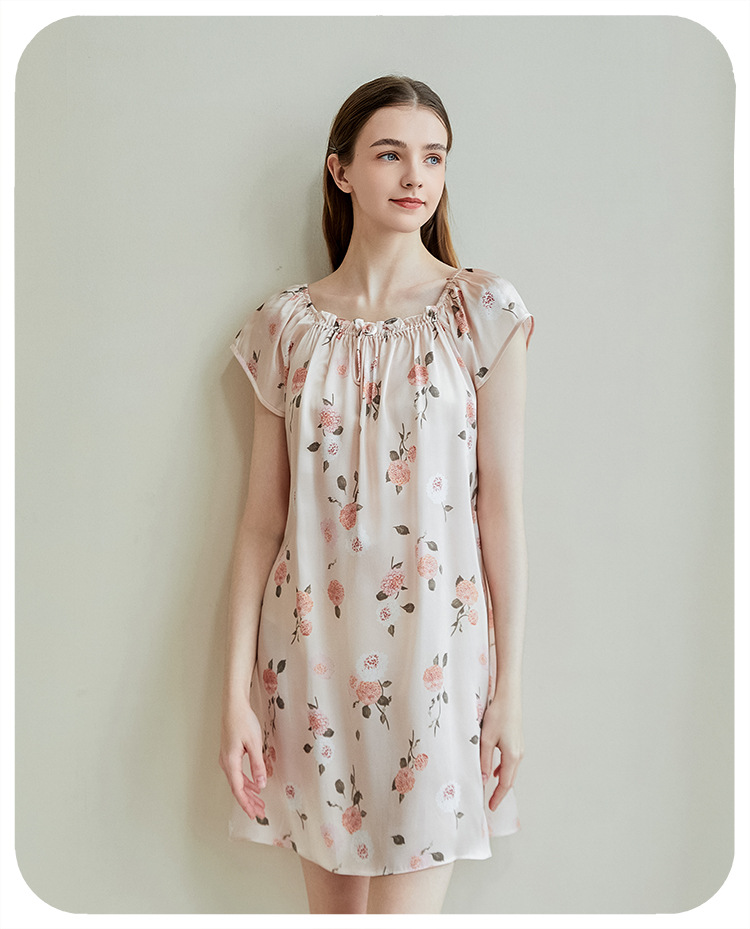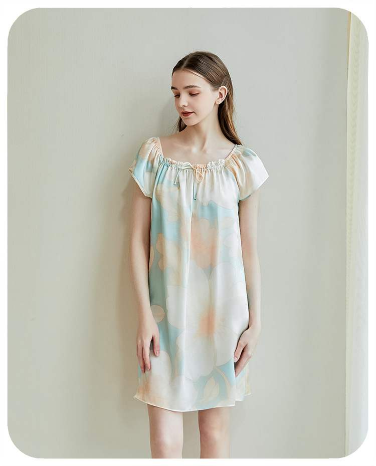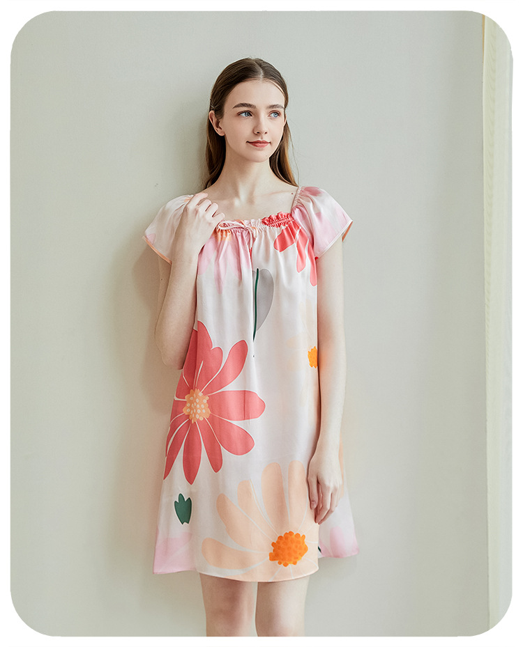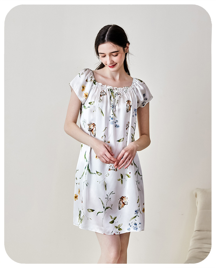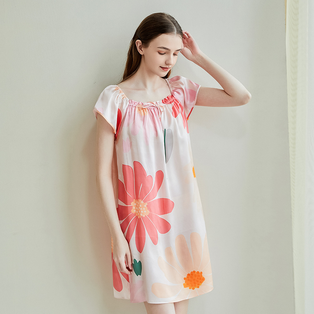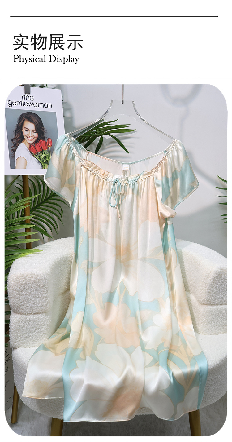 2025夏季新款时尚印花碎花花色真丝睡裙,100%桑蚕丝,16姆米真丝素绉缎,夏天凉爽薄款短袖宽松大码连衣裙娃娃裙公主裙,厂家直销一件代发电商爆款