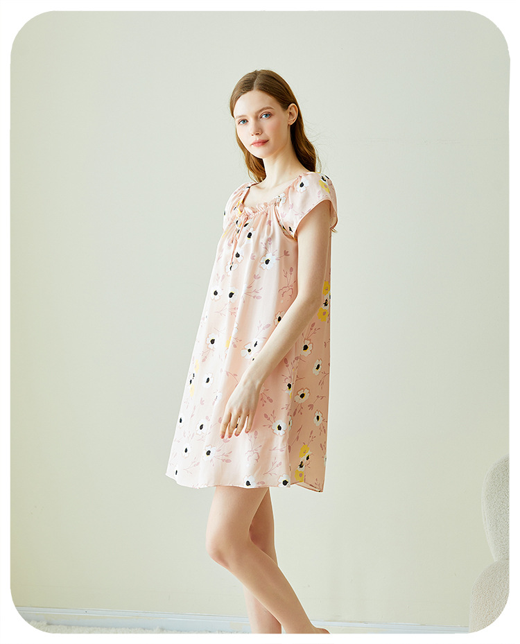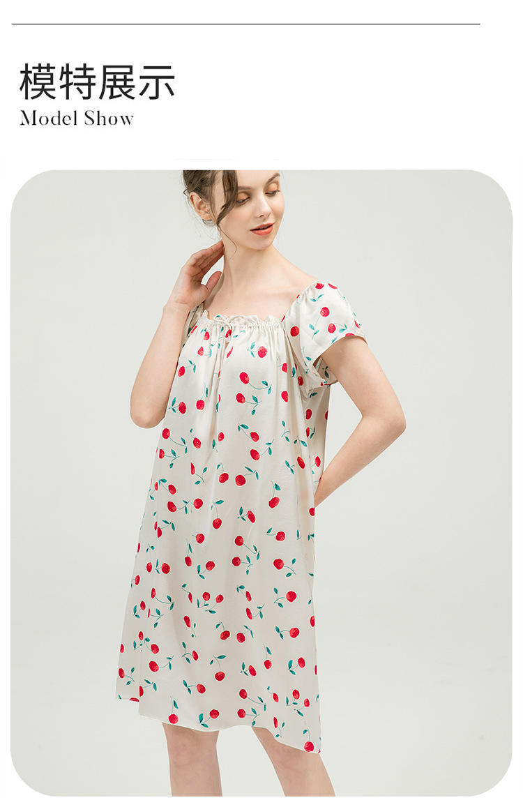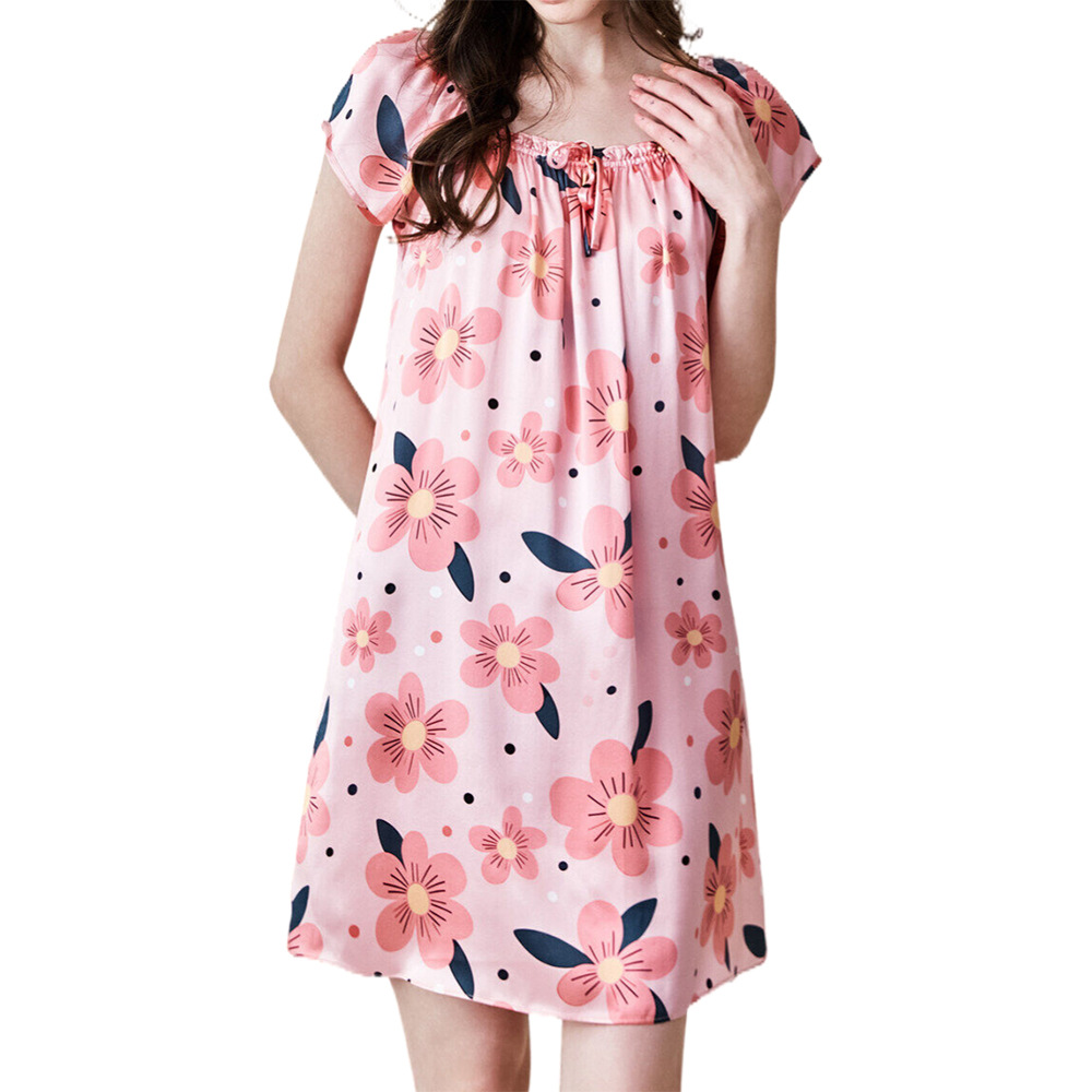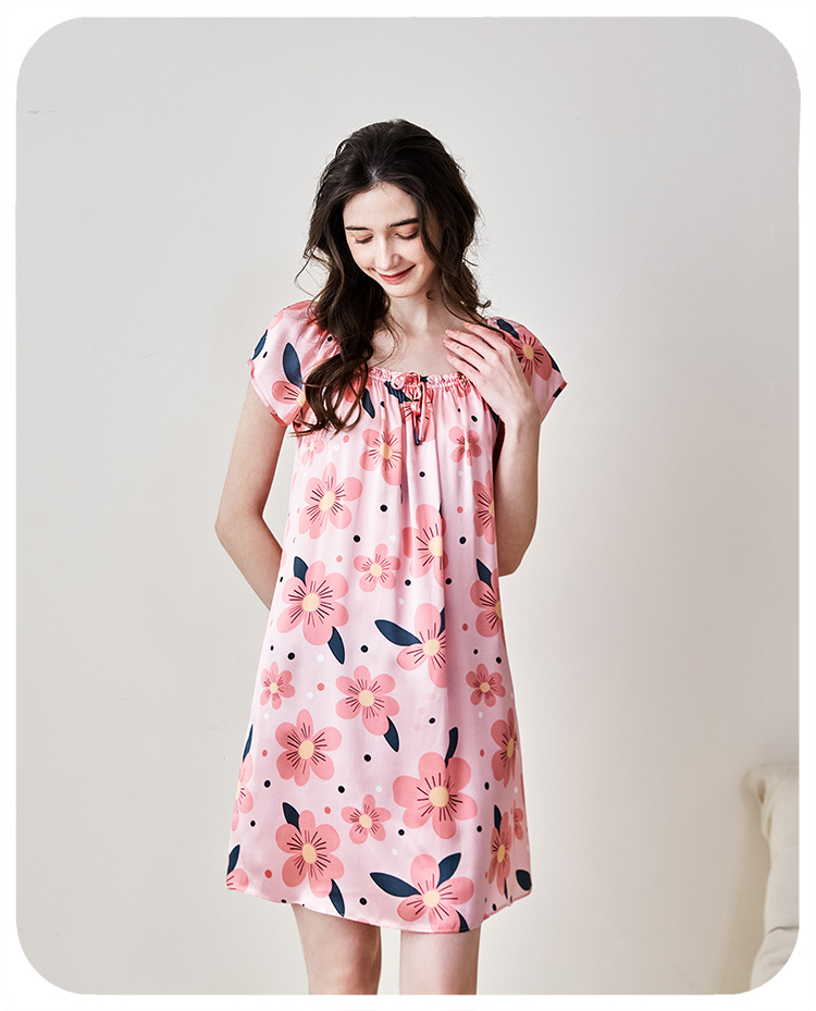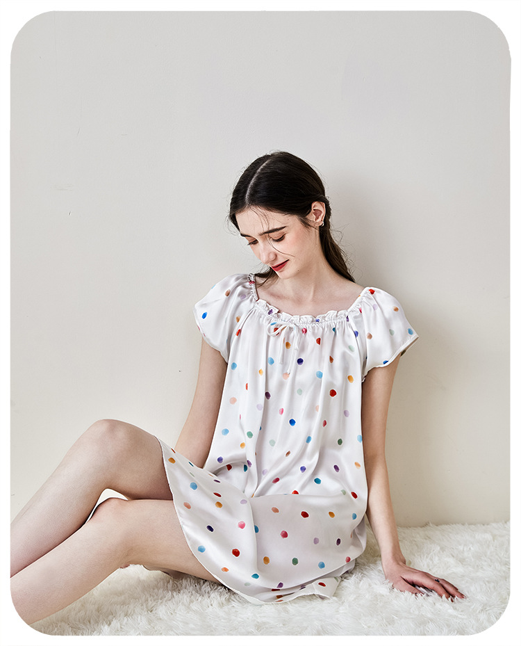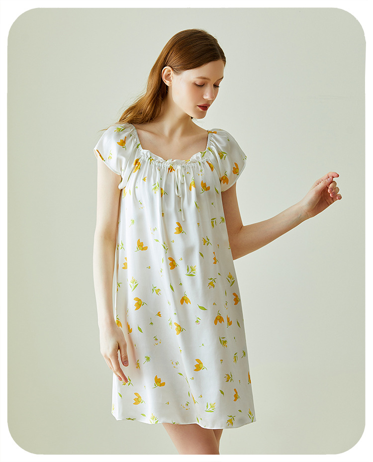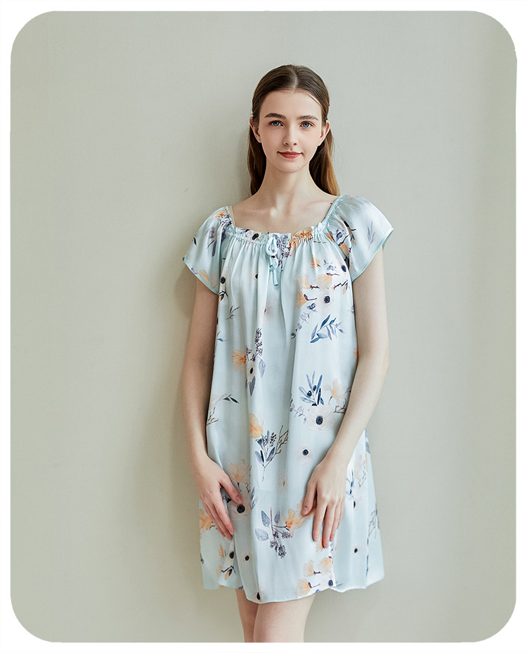 2025夏季新款时尚印花碎花花色真丝睡裙,100%桑蚕丝,16姆米真丝素绉缎,夏天凉爽薄款短袖宽松大码连衣裙娃娃裙公主裙,厂家直销一件代发电商爆款