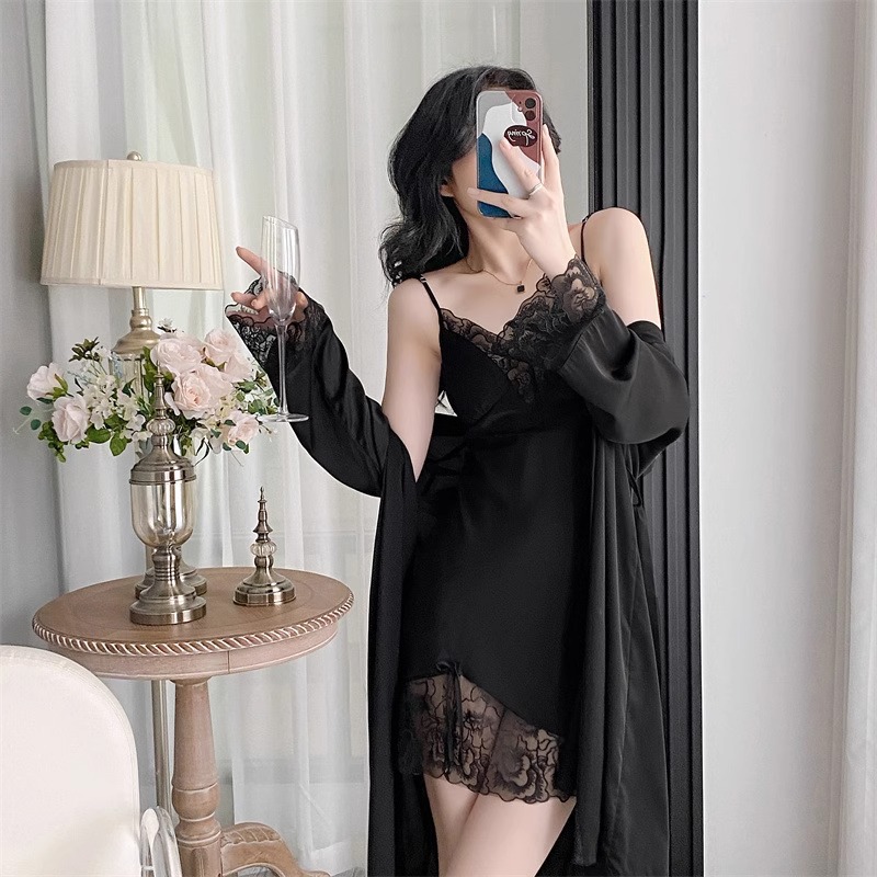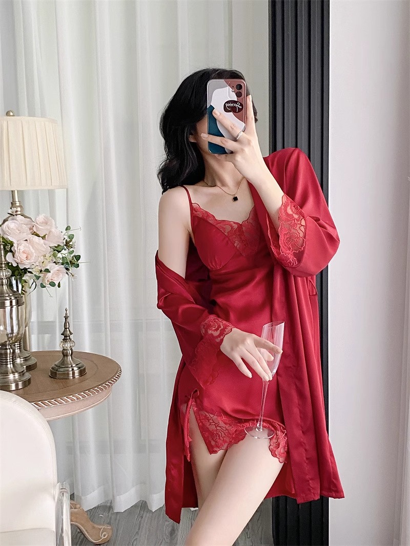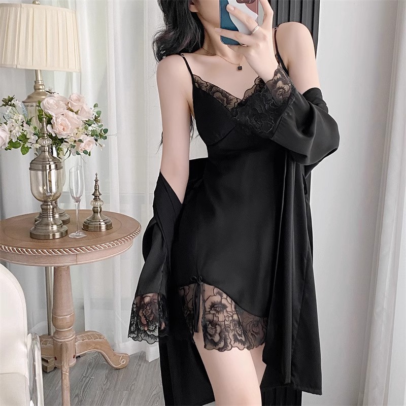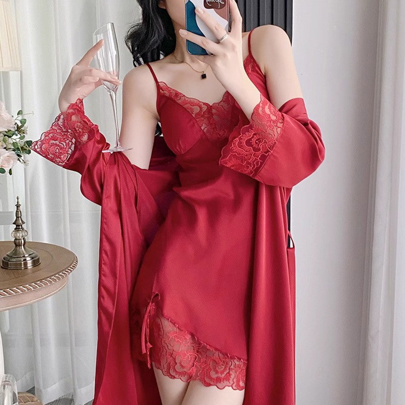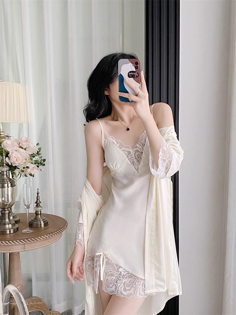 섹시한 잠옷 여성용 아이스 실크 여름 얇은 레이스 가슴 패드 순수 스타일 슬링 나이트 가운 실크 홈 옷