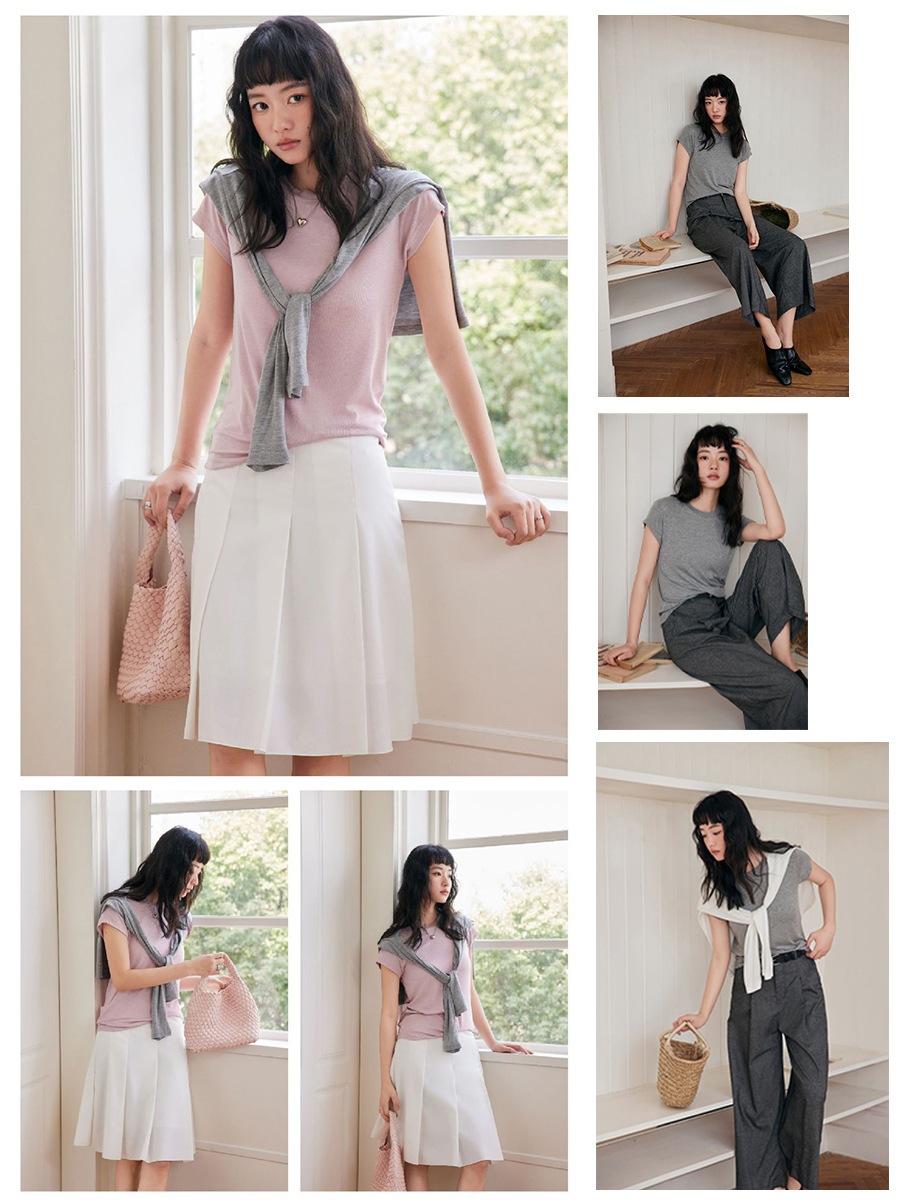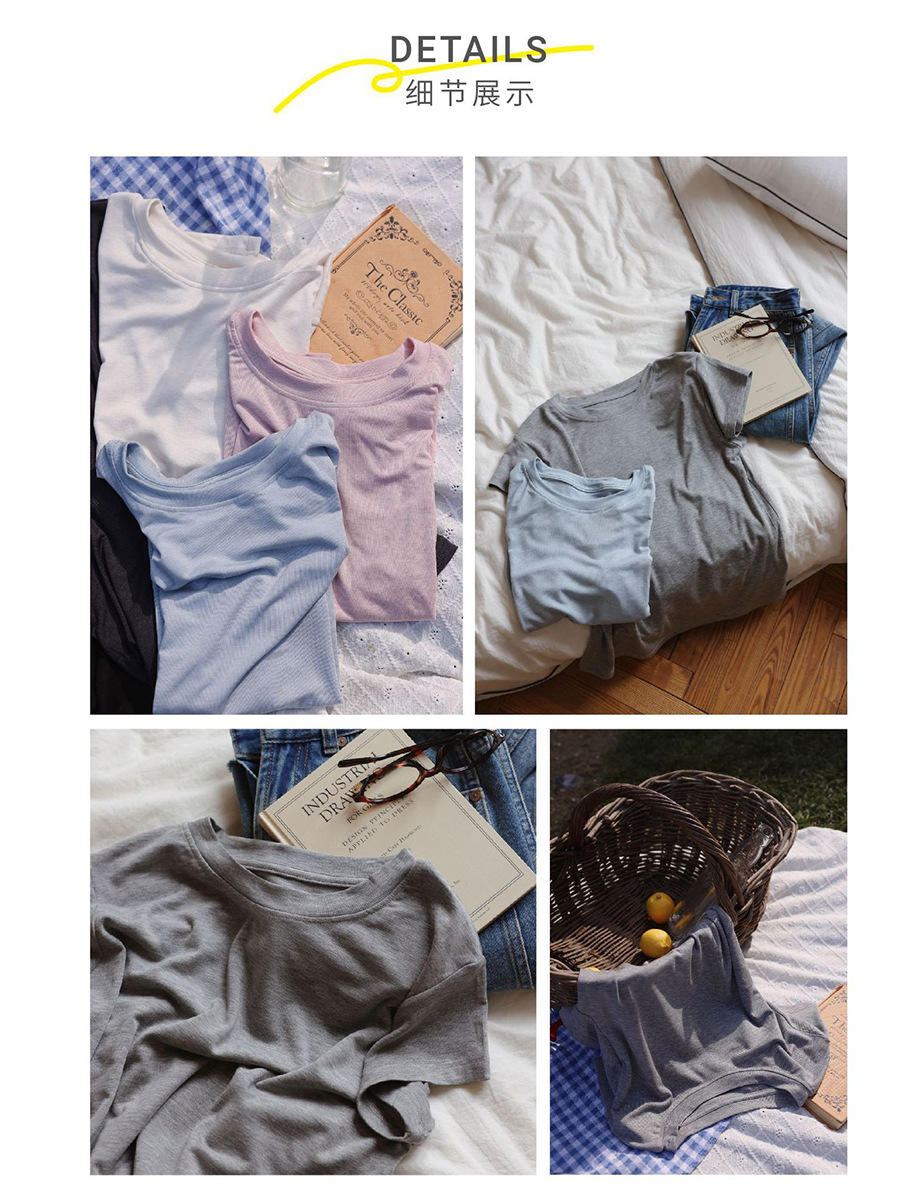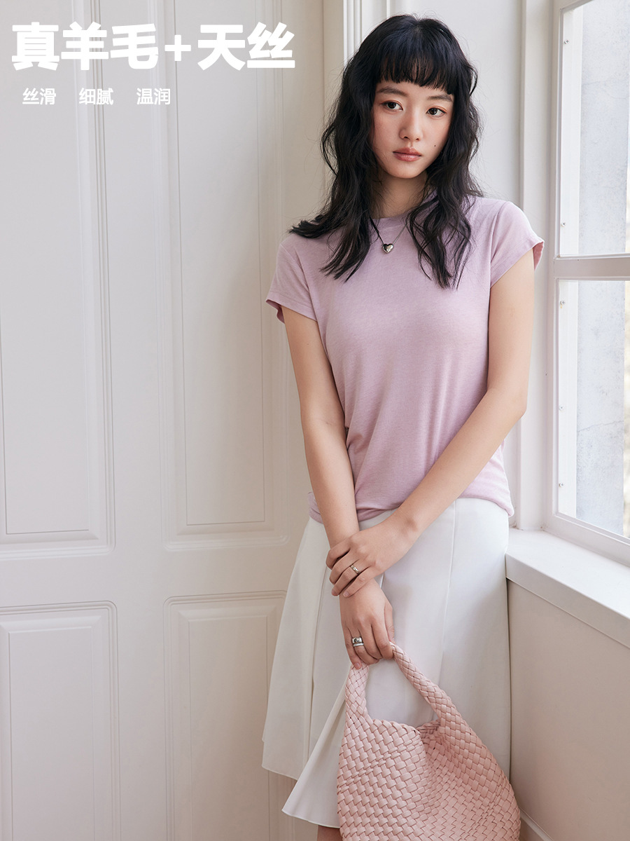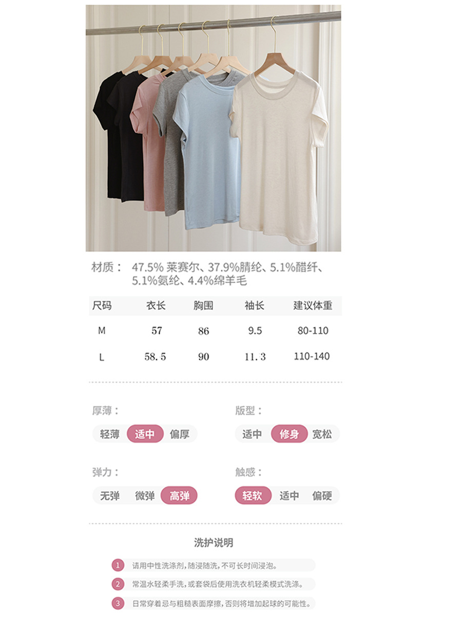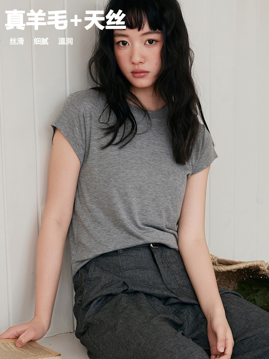 텐셀 울 반팔 티셔츠 여성용 슬림핏 라운드넥 어깨가 드러나는 작은 날개 소매 얇은 탑 예술적인 스타일 반팔 티셔츠