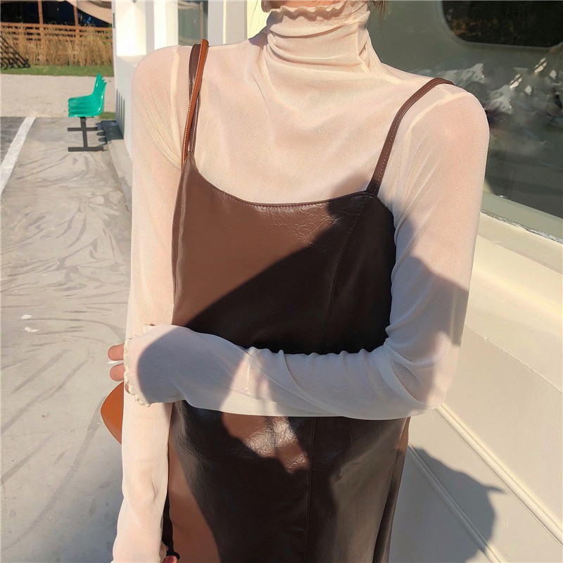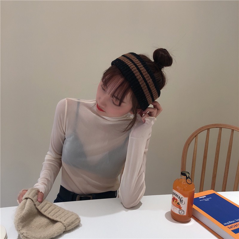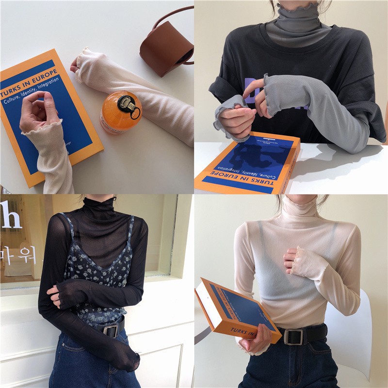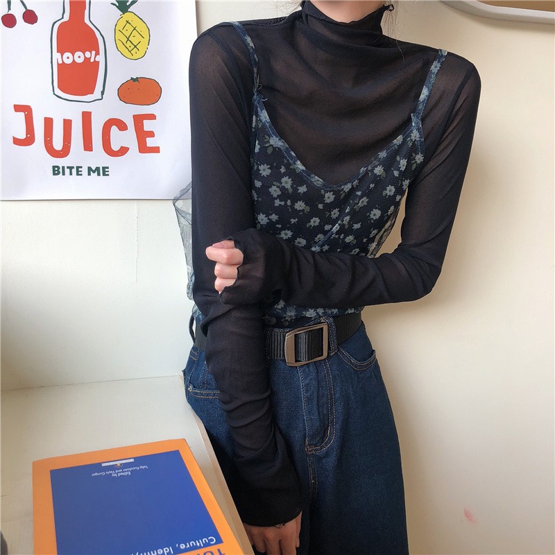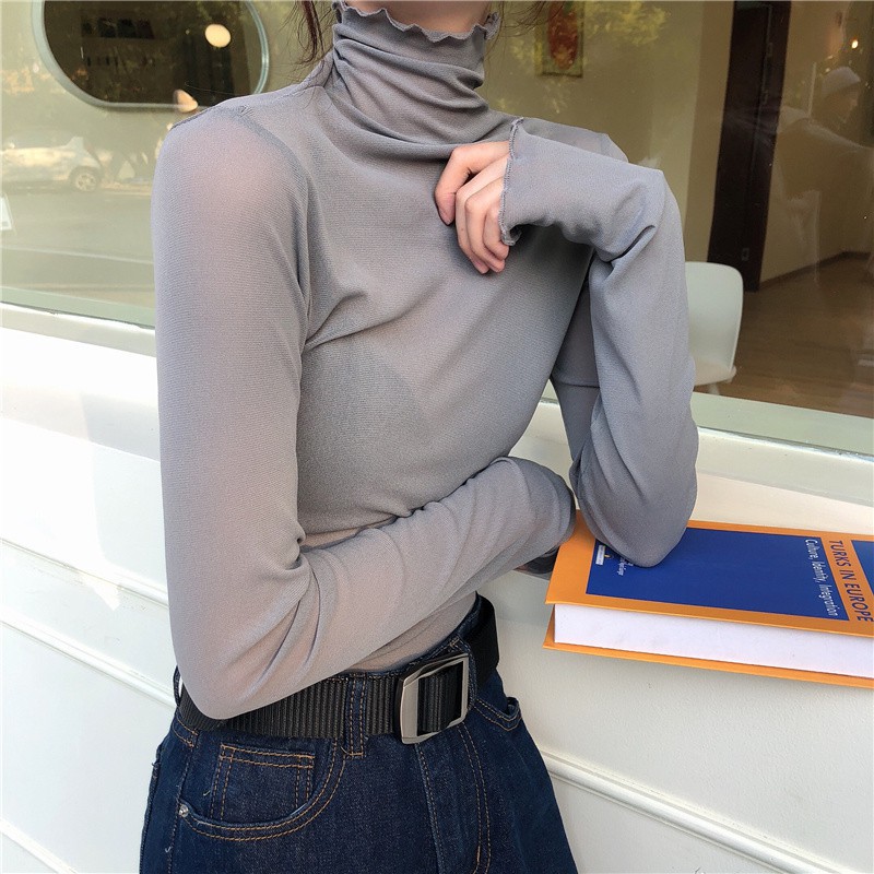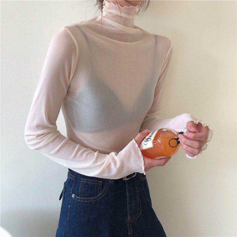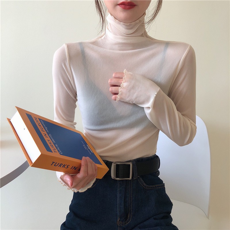 여름용 슬림 하이넥 긴팔 레이스 밑단 셔츠, 얇은 요정 메쉬 탑, 화이트 귀 티셔츠