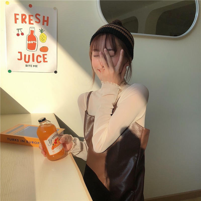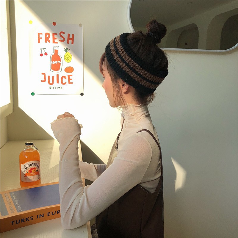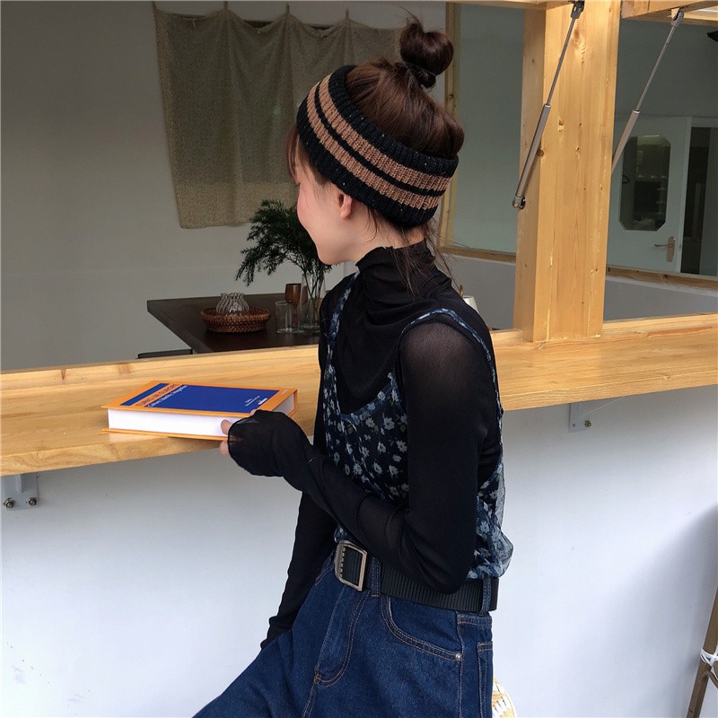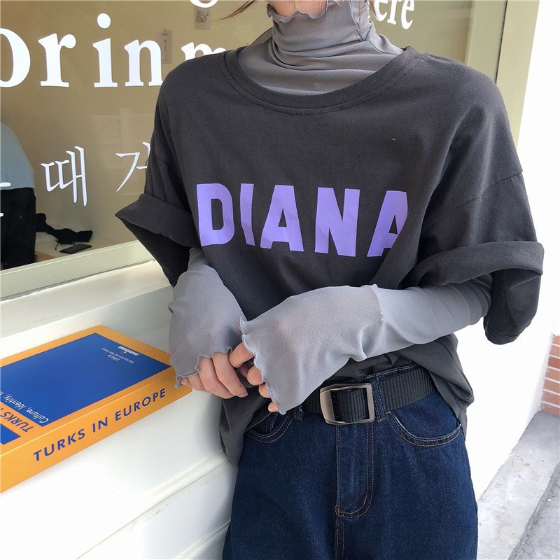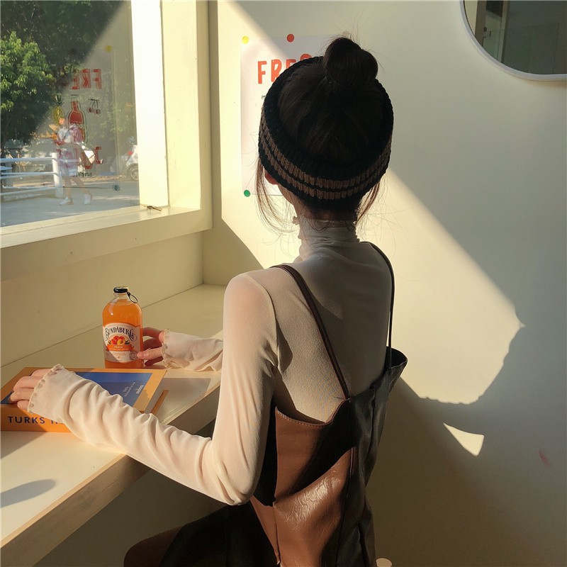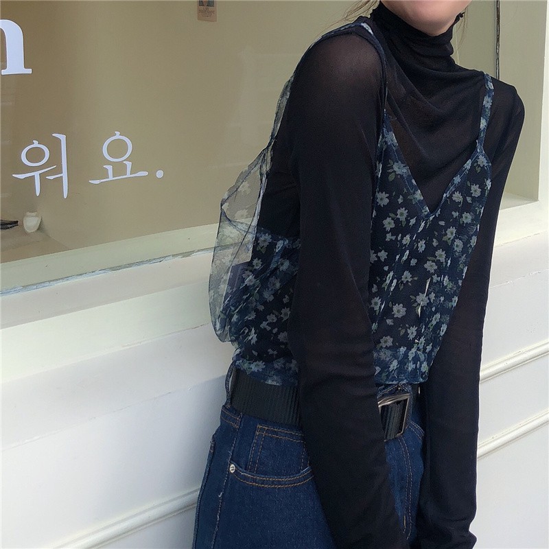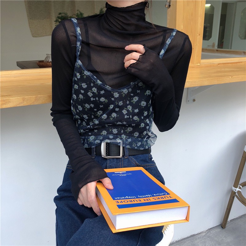 여름용 슬림 하이넥 긴팔 레이스 밑단 셔츠, 얇은 요정 메쉬 탑, 화이트 귀 티셔츠