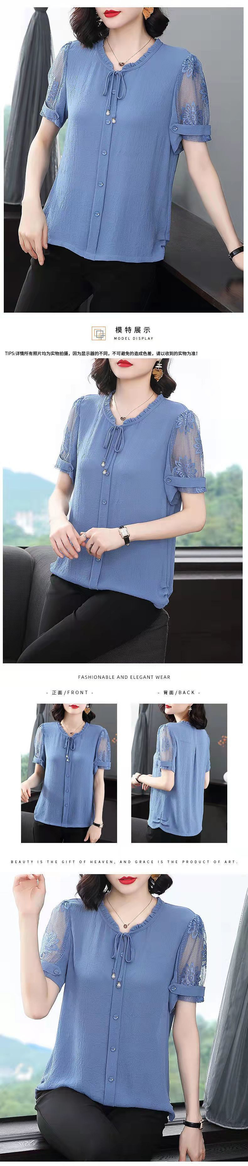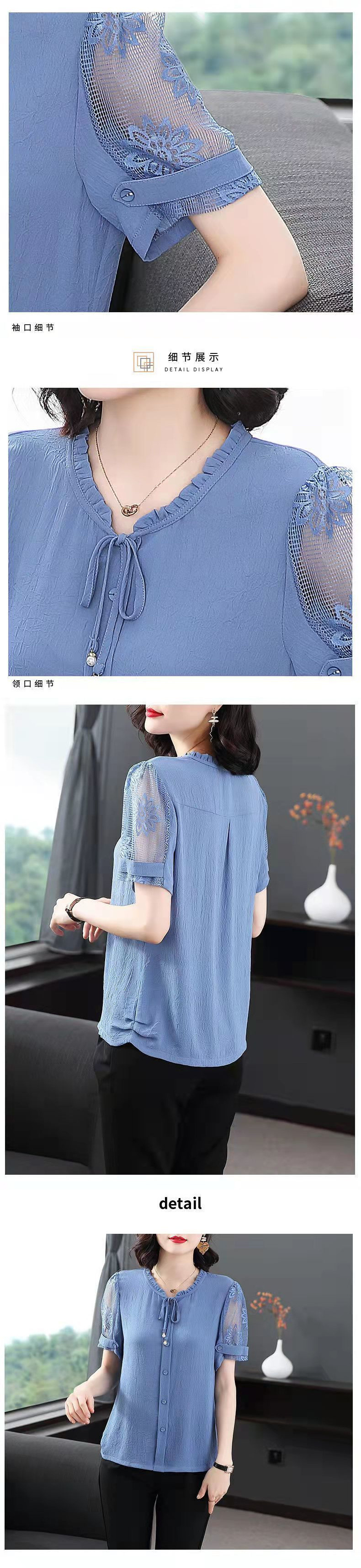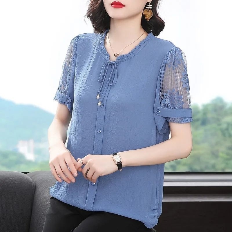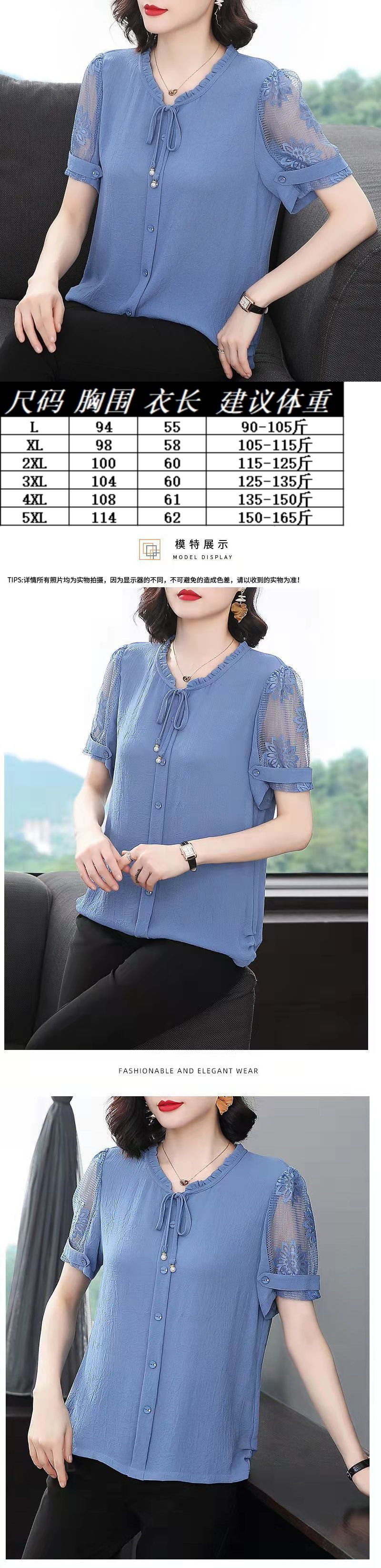 중년 어머니의 쉬폰 셔츠 짧은 소매 여름 2024 여성을위한 외국 스타일 탑을 덮는 새로운 느슨한 플러스 사이즈 배