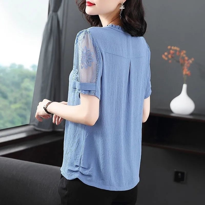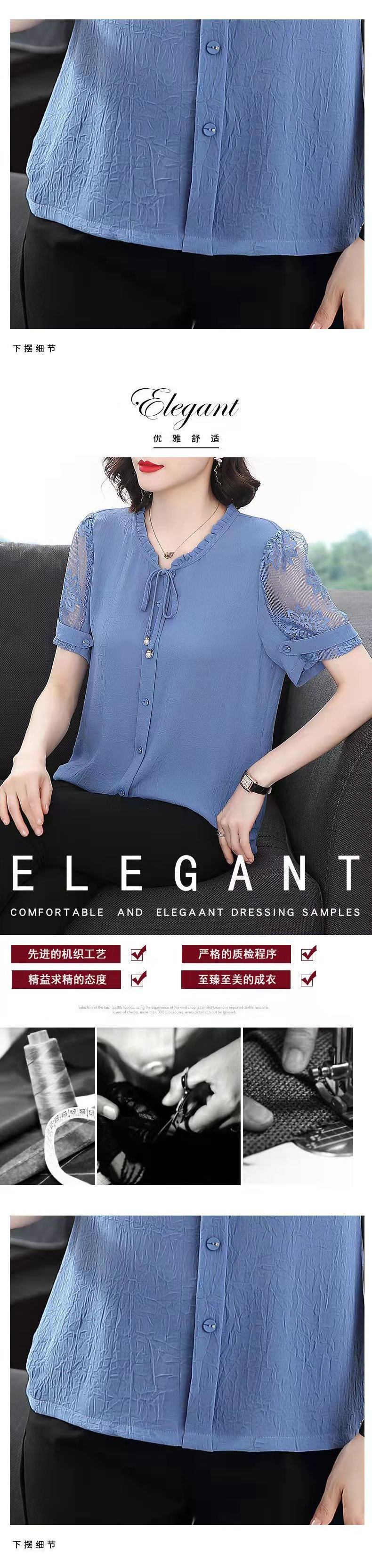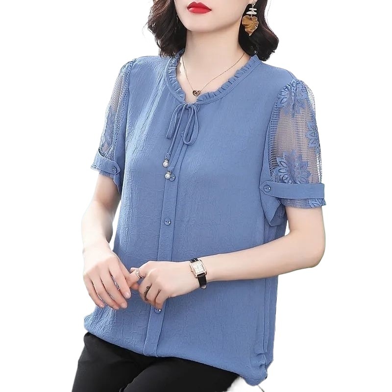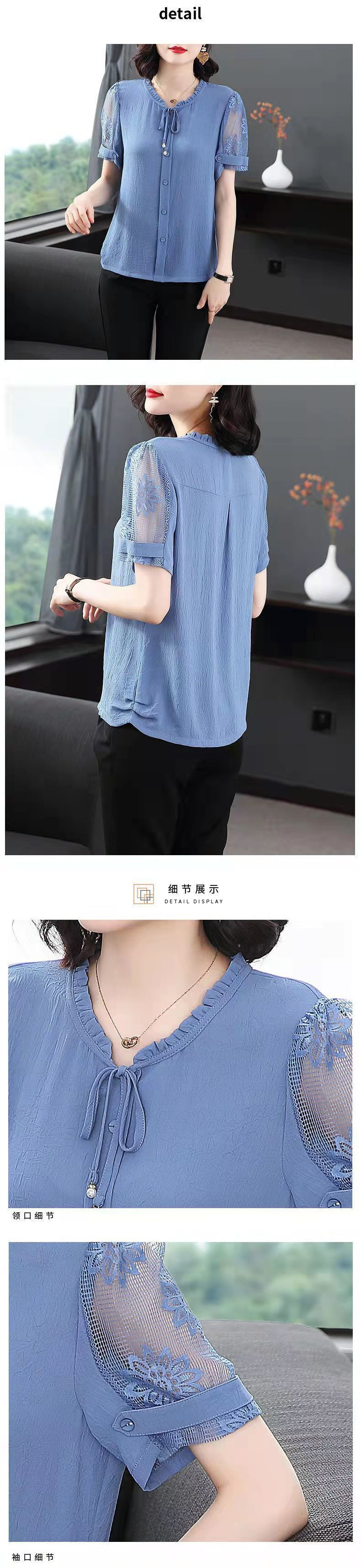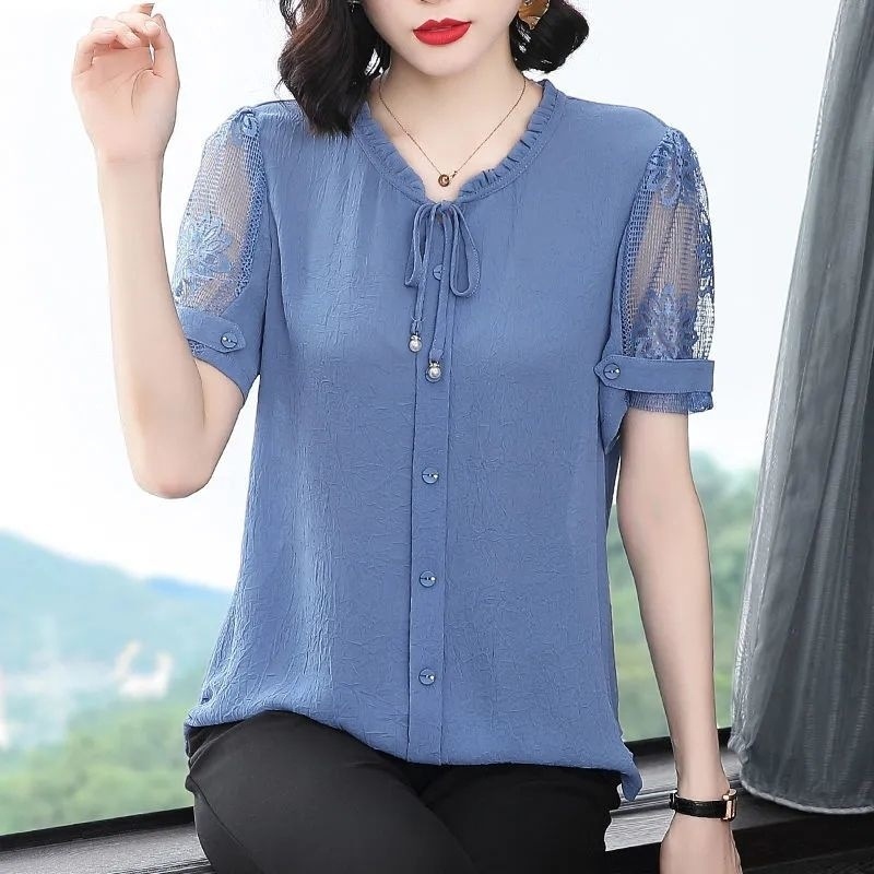 중년 어머니의 쉬폰 셔츠 짧은 소매 여름 2024 여성을위한 외국 스타일 탑을 덮는 새로운 느슨한 플러스 사이즈 배