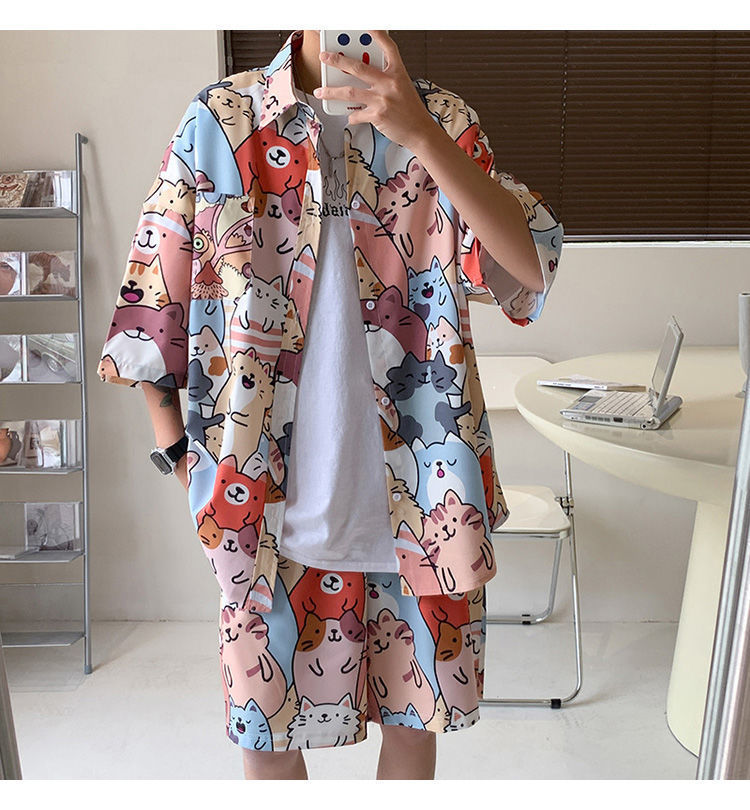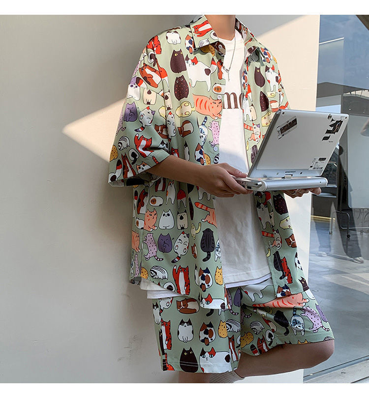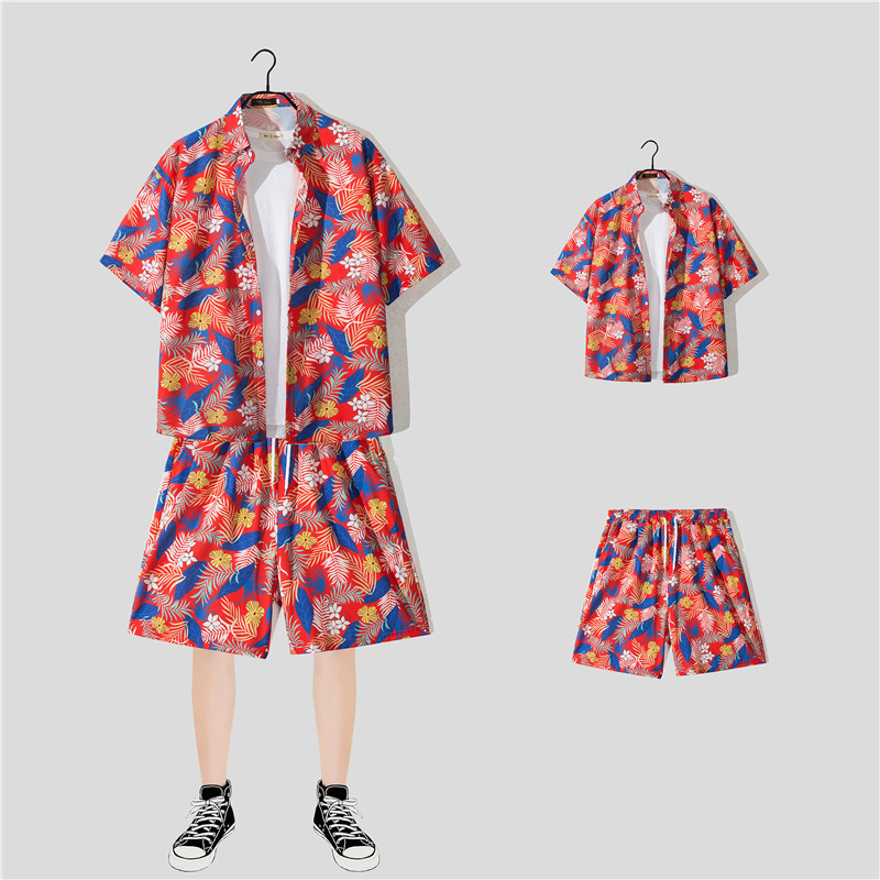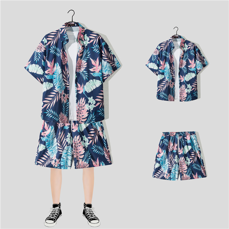 캐주얼 비치 슈트 남성 여름 얇은 느슨한 잘 생긴 해변 옷 하와이 반바지 꽃 셔츠 투피스