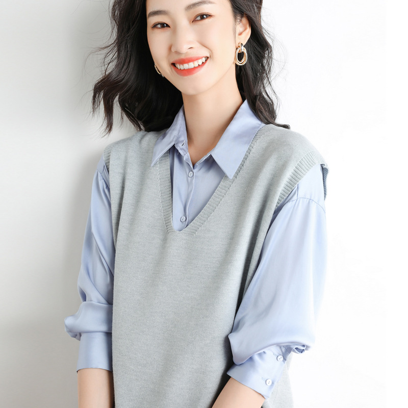 울 혼합 2024 가을, 겨울 신사 숙녀 느슨한 v 넥 솔리드 컬러 짧은 풀오버 양복 조끼 니트 조끼