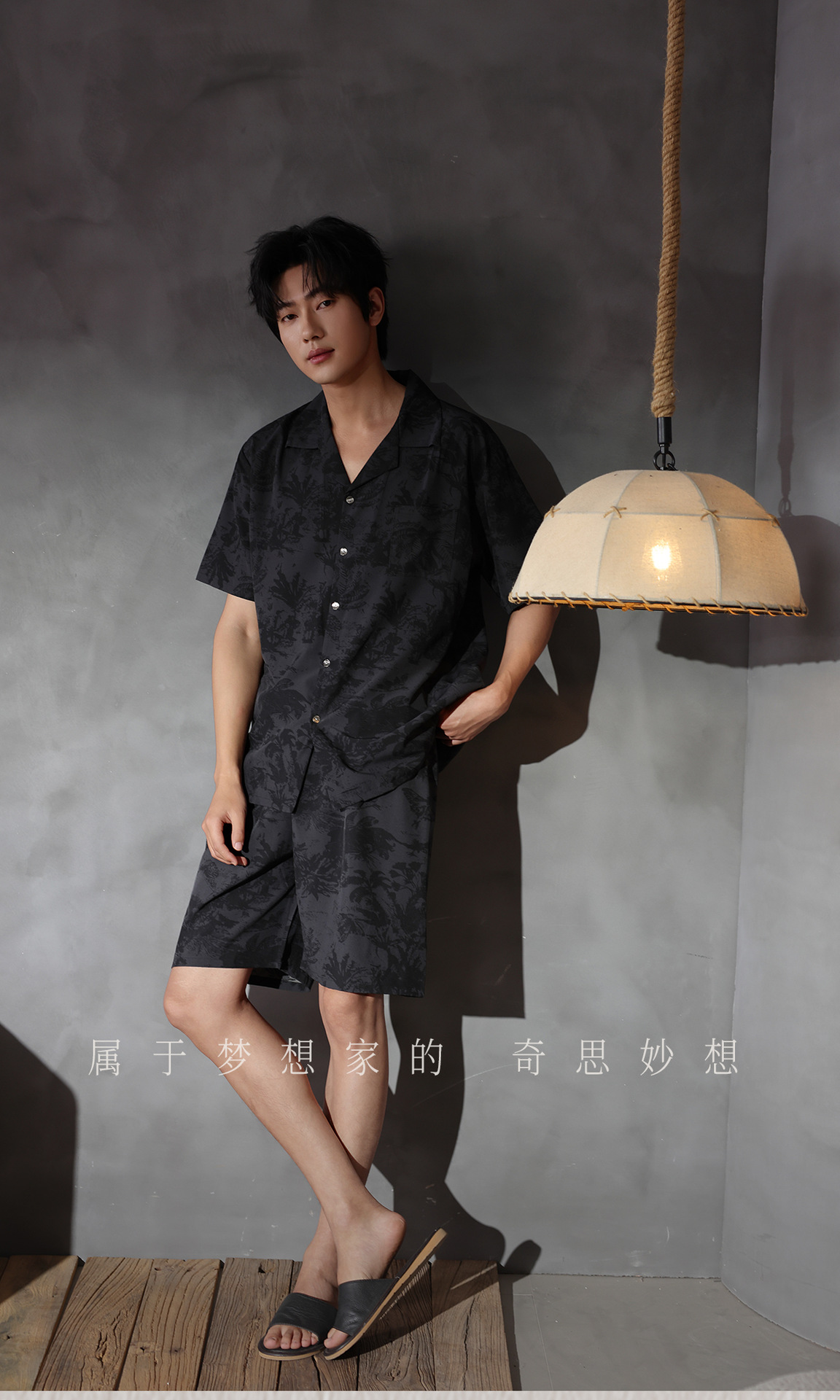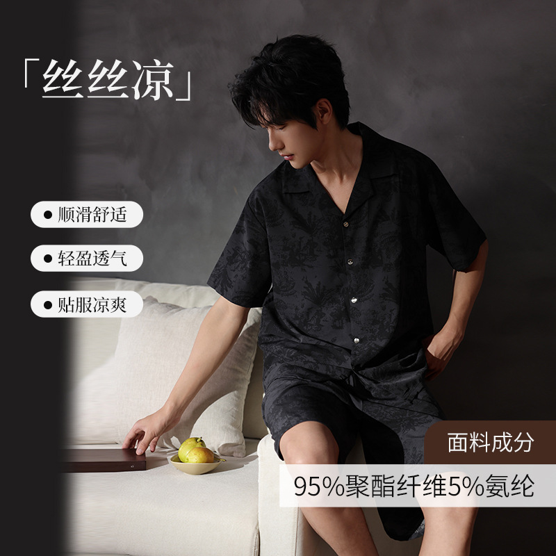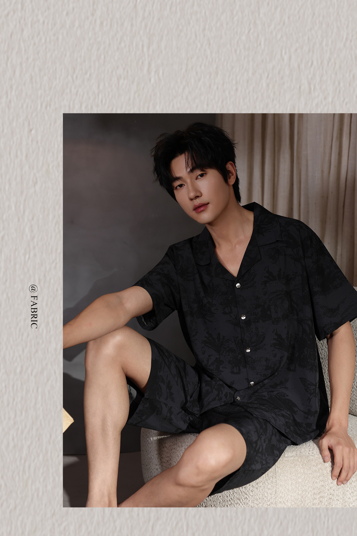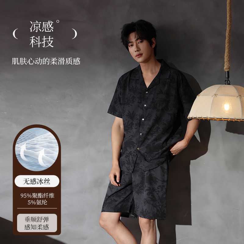 [시원한 느낌] 아이스 실크 파자마 남성 여름 인쇄 느슨한 짧은 소매 반바지 소년 홈 의류 세트 한국판