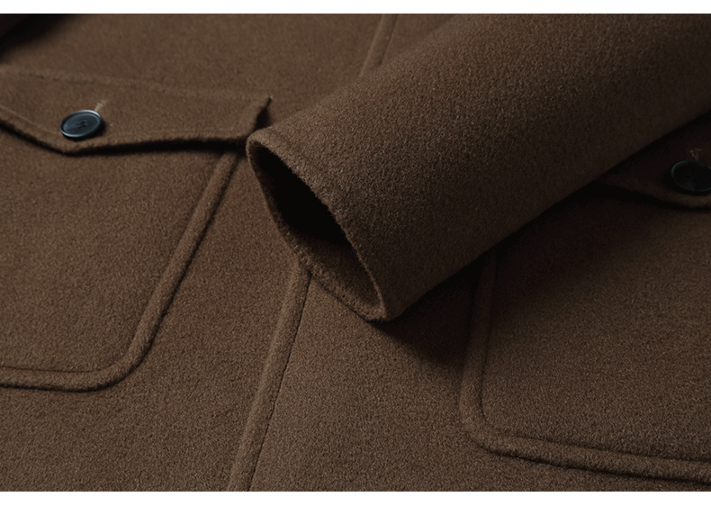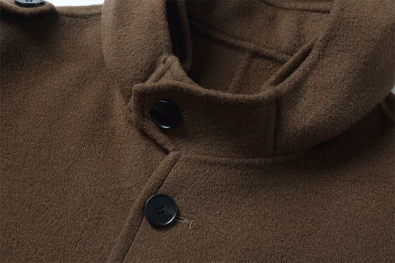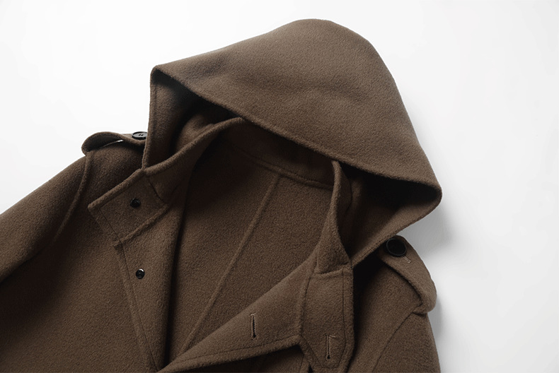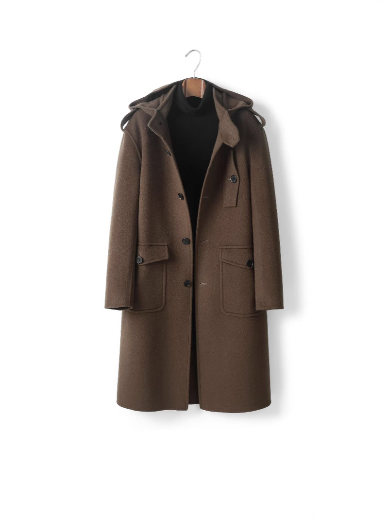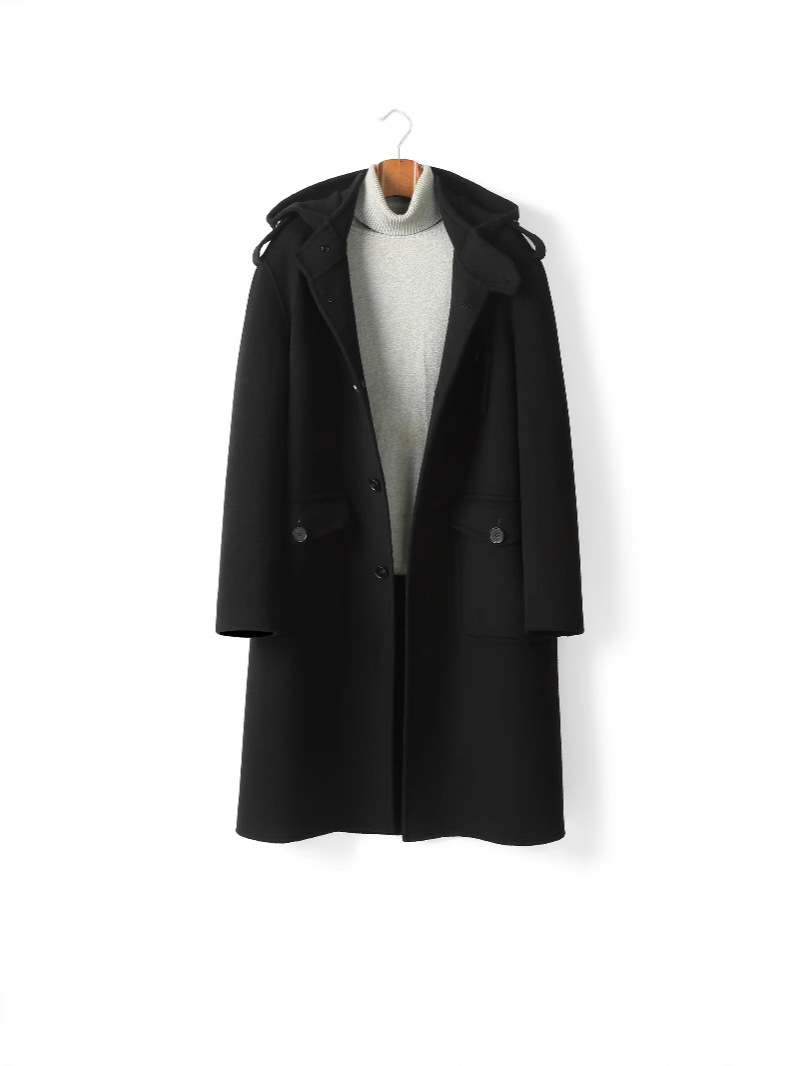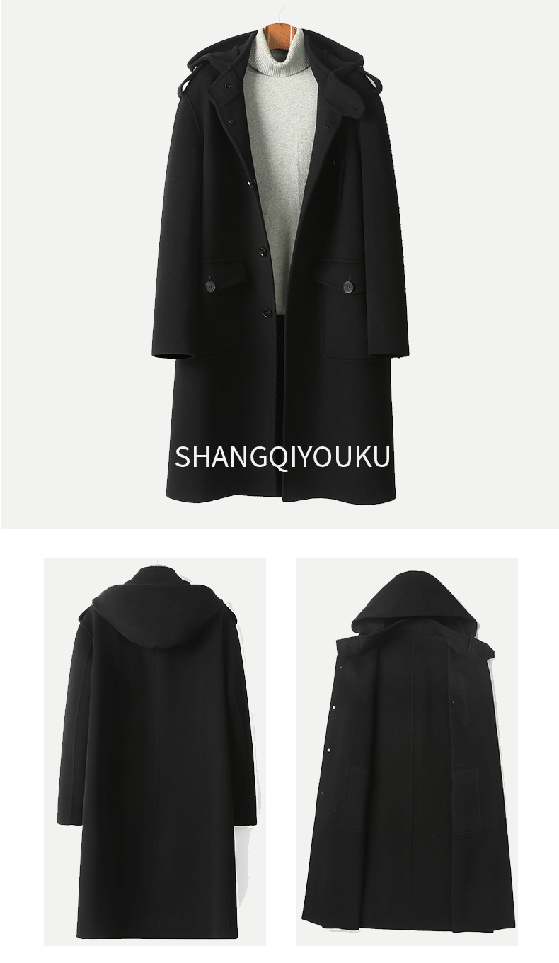 100% 순모 양면 모직 코트 남성용 롱 후드 한국 스타일 캐시미어 없는 모직 코트 트렌디한 중간 길이