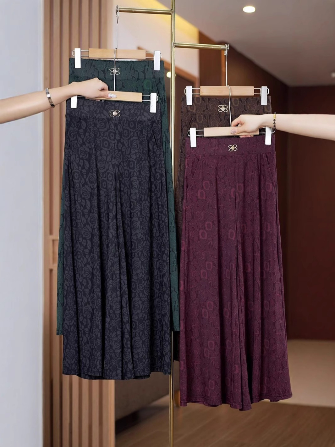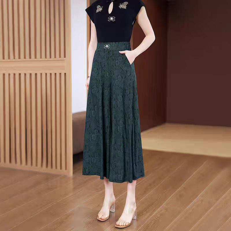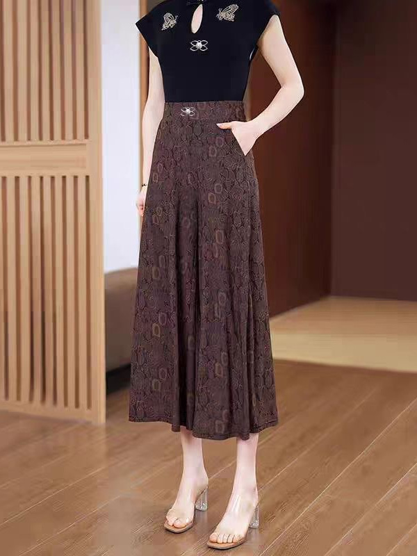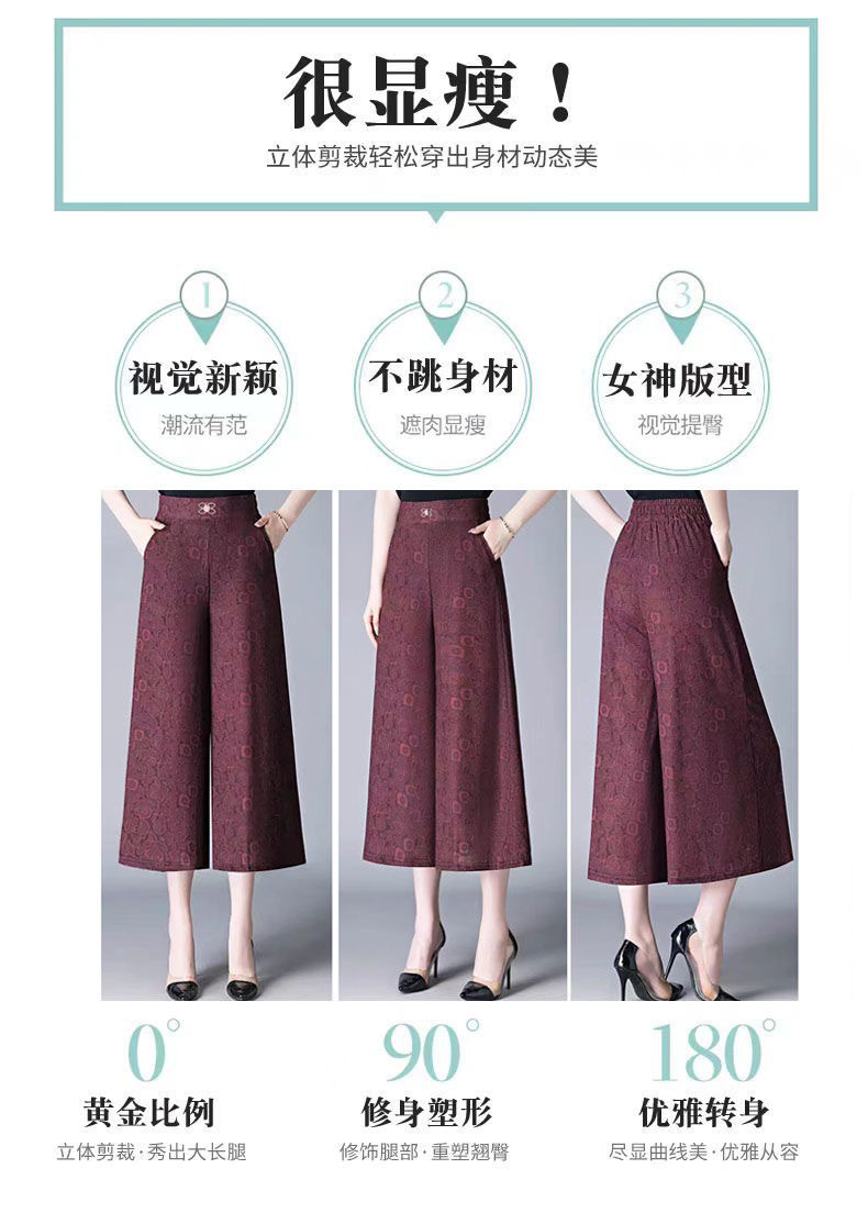 중국풍 8부 와이드 스커트 팬츠 여성용 2026 봄 여름 얇은 루즈핏 하이웨이스트 중년 프린트 캐주얼 스커트 팬츠