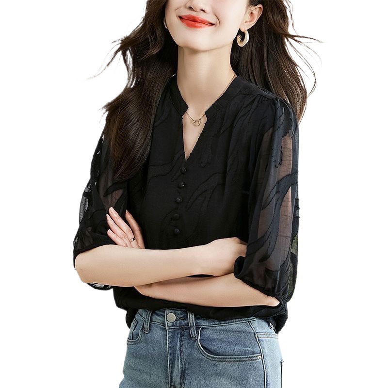 여성용 얇은 블랙 반팔 쉬폰 셔츠 2026 여름 신상 패셔너블하고 세련된 레이스 셔츠 루즈핏 배 가리개 탑