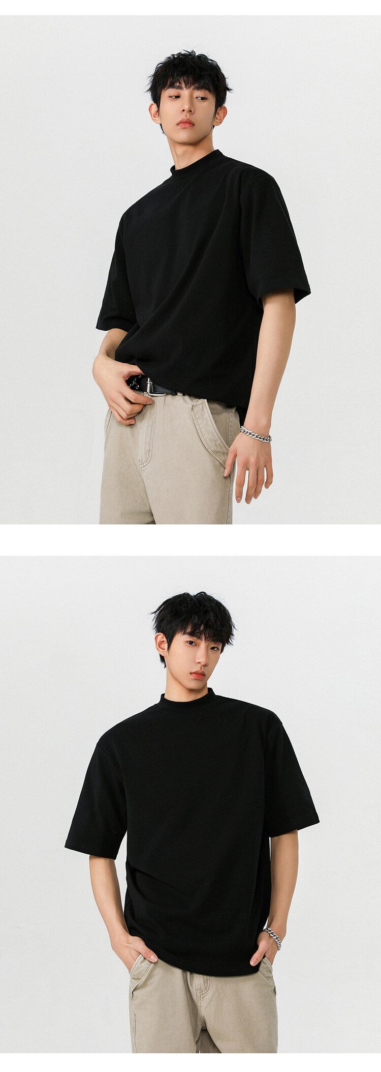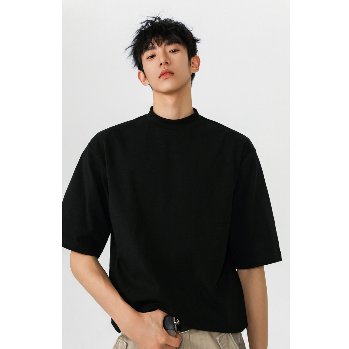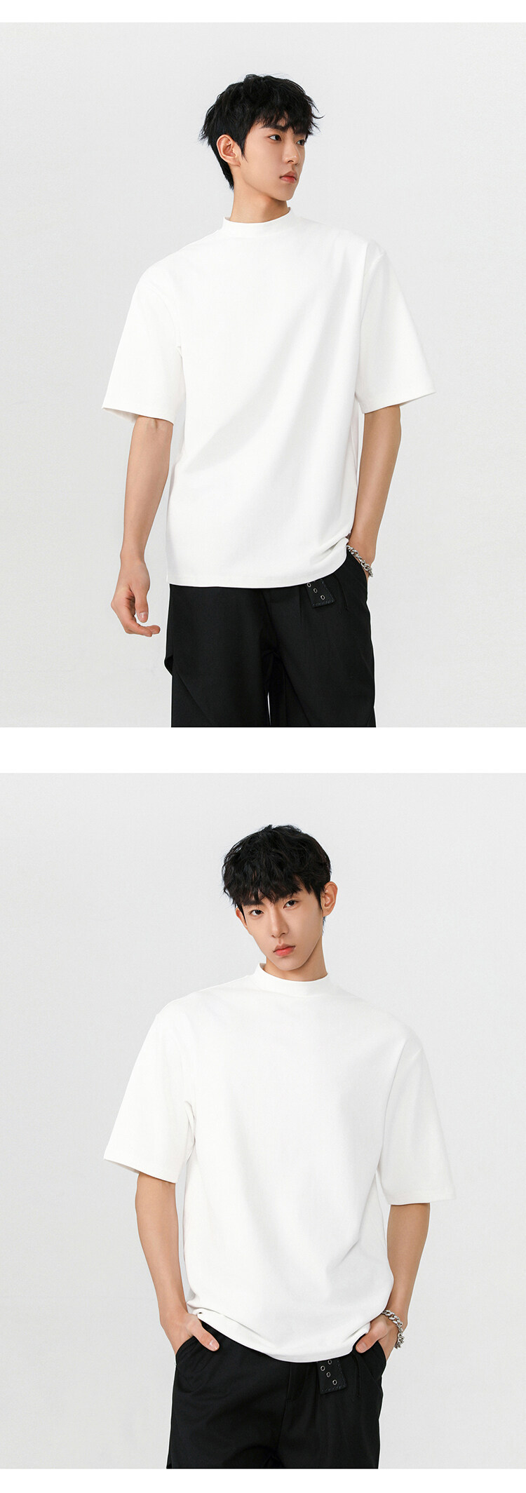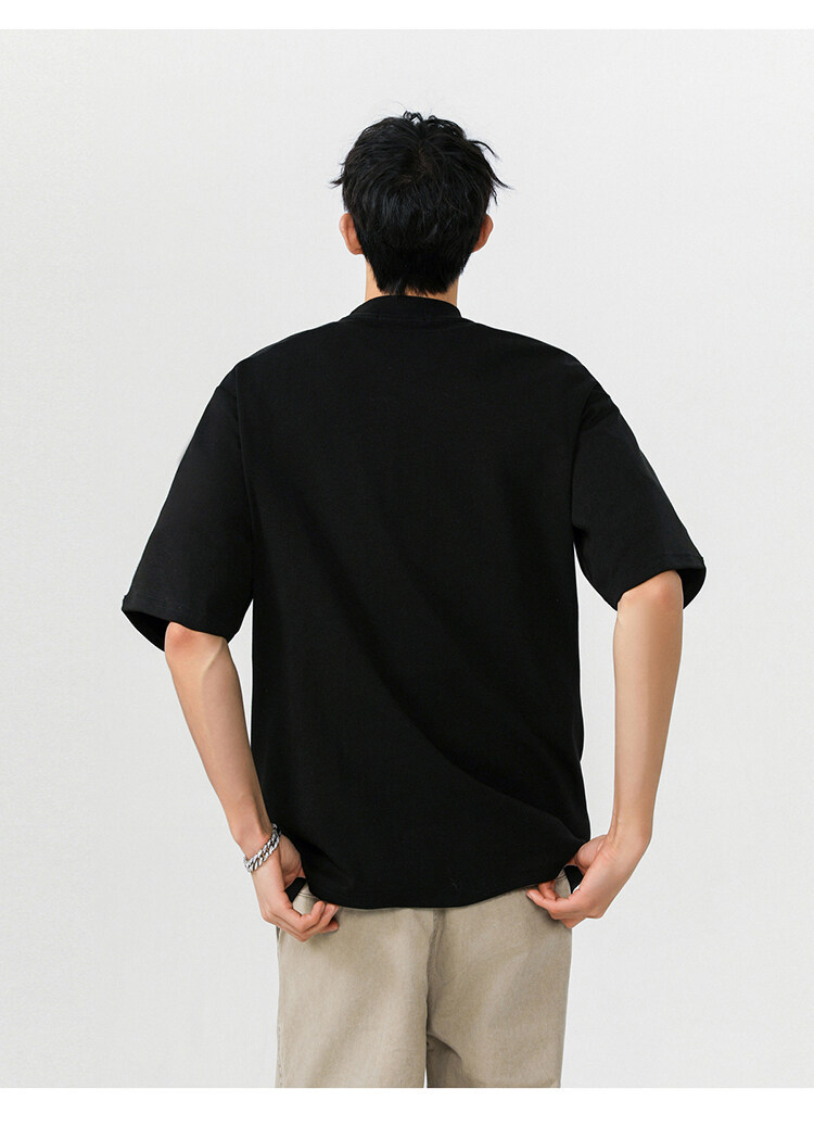 헤비 반팔 티셔츠 간단한 기본 남성 여름 260G 세미 하이 칼라 티셔츠 느슨한 스트레치 조커 티