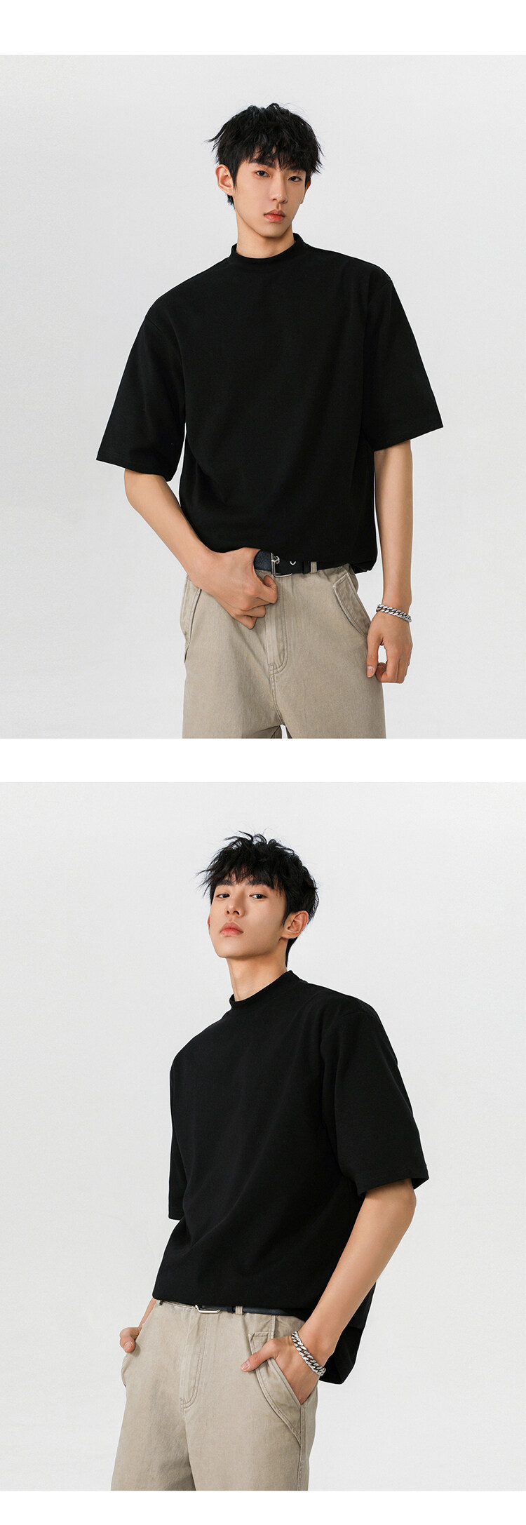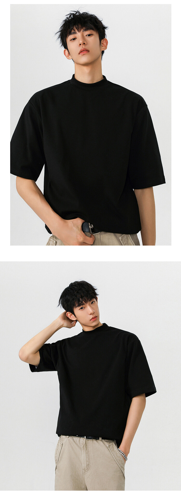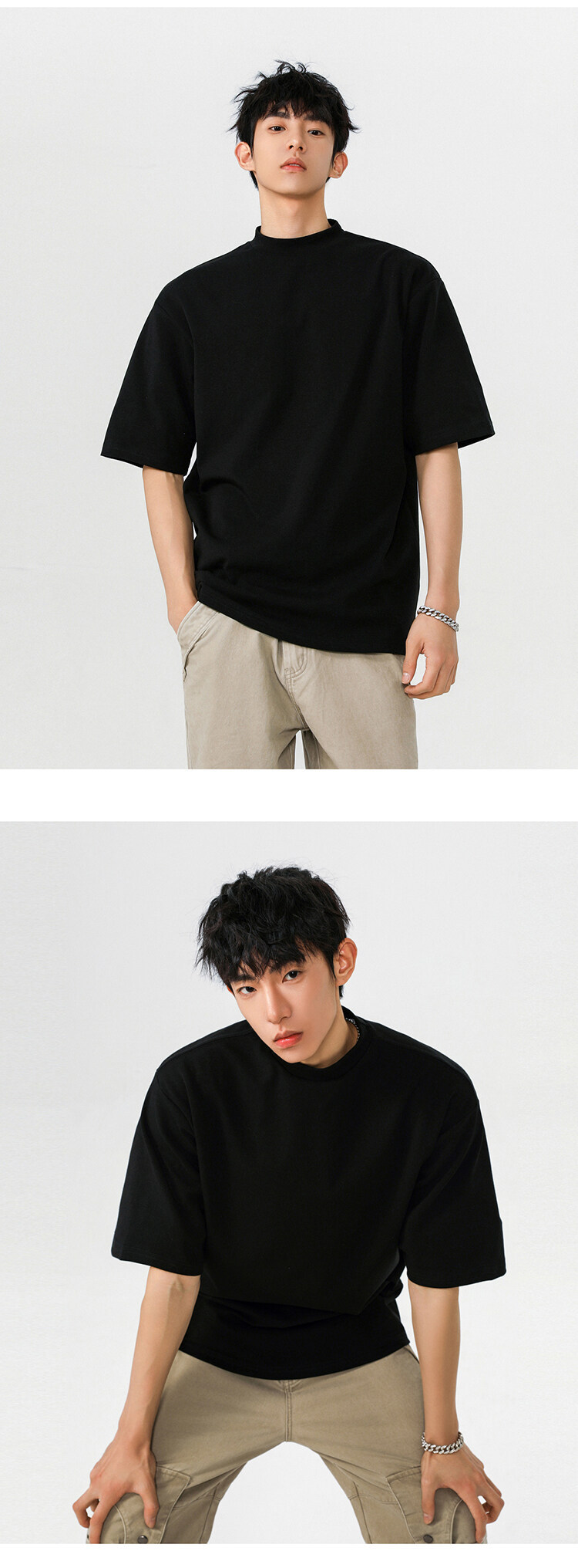 헤비 반팔 티셔츠 간단한 기본 남성 여름 260G 세미 하이 칼라 티셔츠 느슨한 스트레치 조커 티