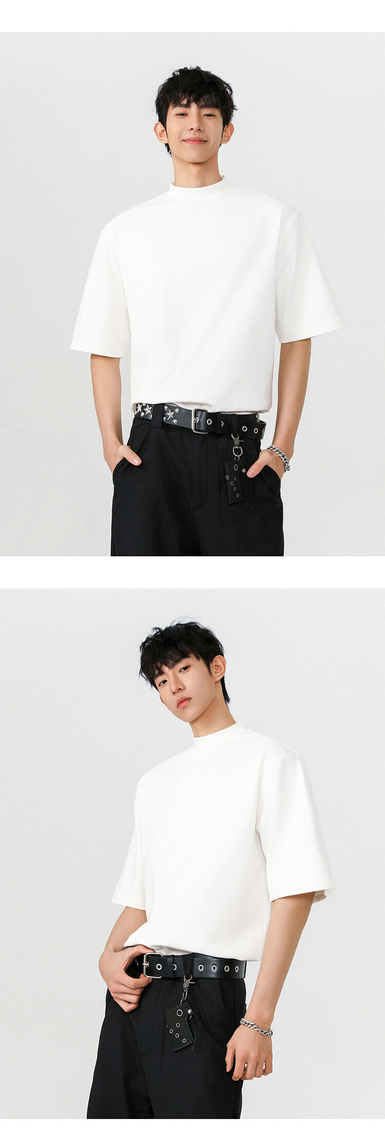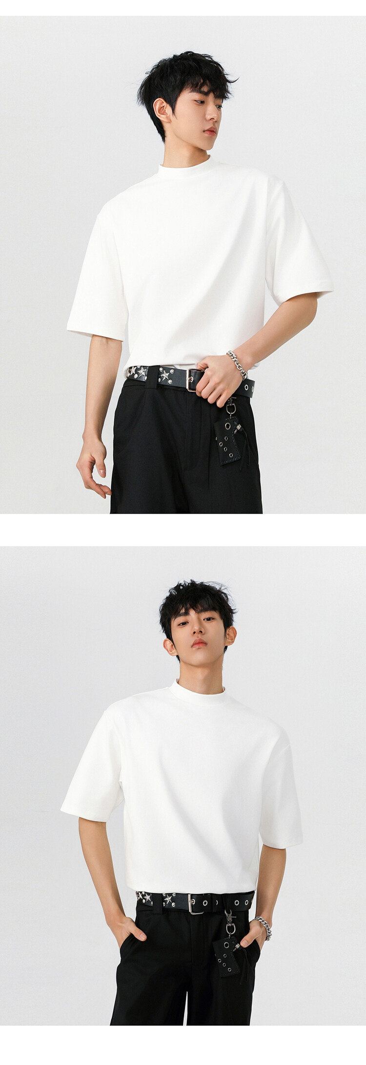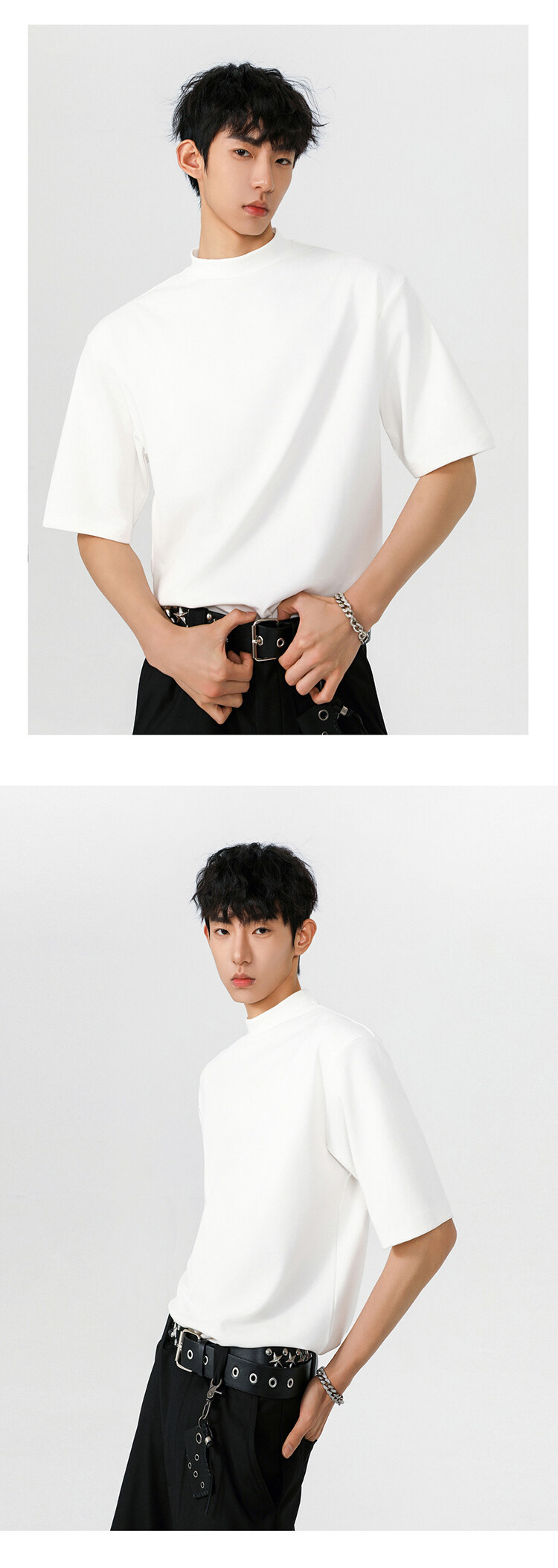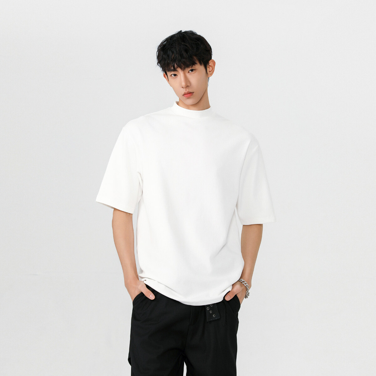 헤비 반팔 티셔츠 간단한 기본 남성 여름 260G 세미 하이 칼라 티셔츠 느슨한 스트레치 조커 티