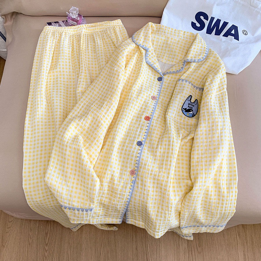 여성을위한 더블 레이어 면화 거즈 잠옷 100% 면 가을 긴팔 바지 여름 귀여운 소녀 홈웨어 세트 도매