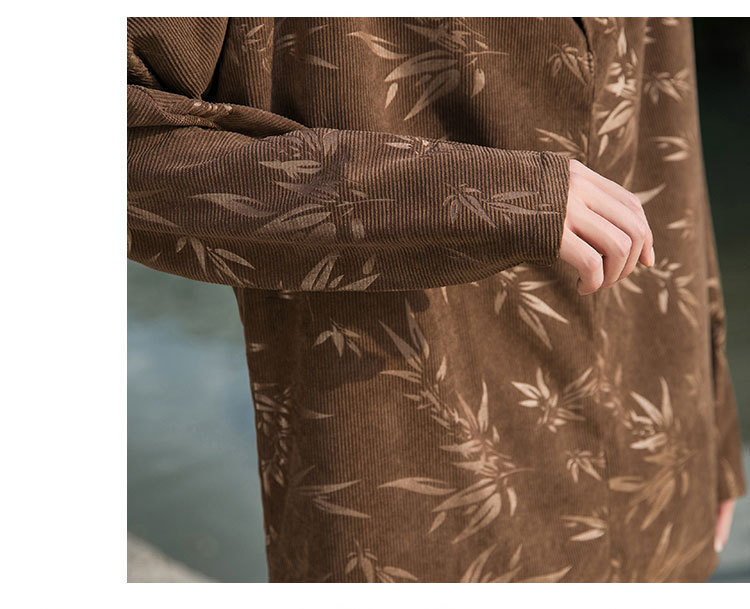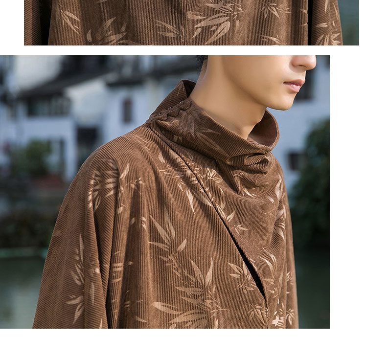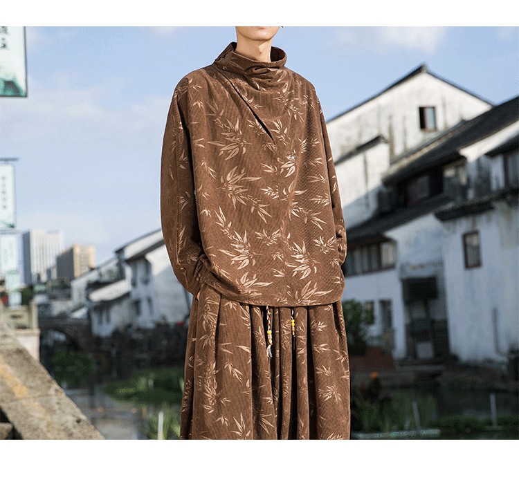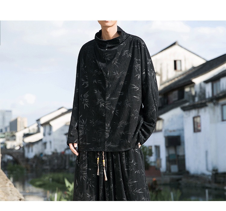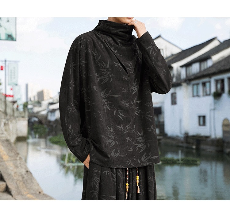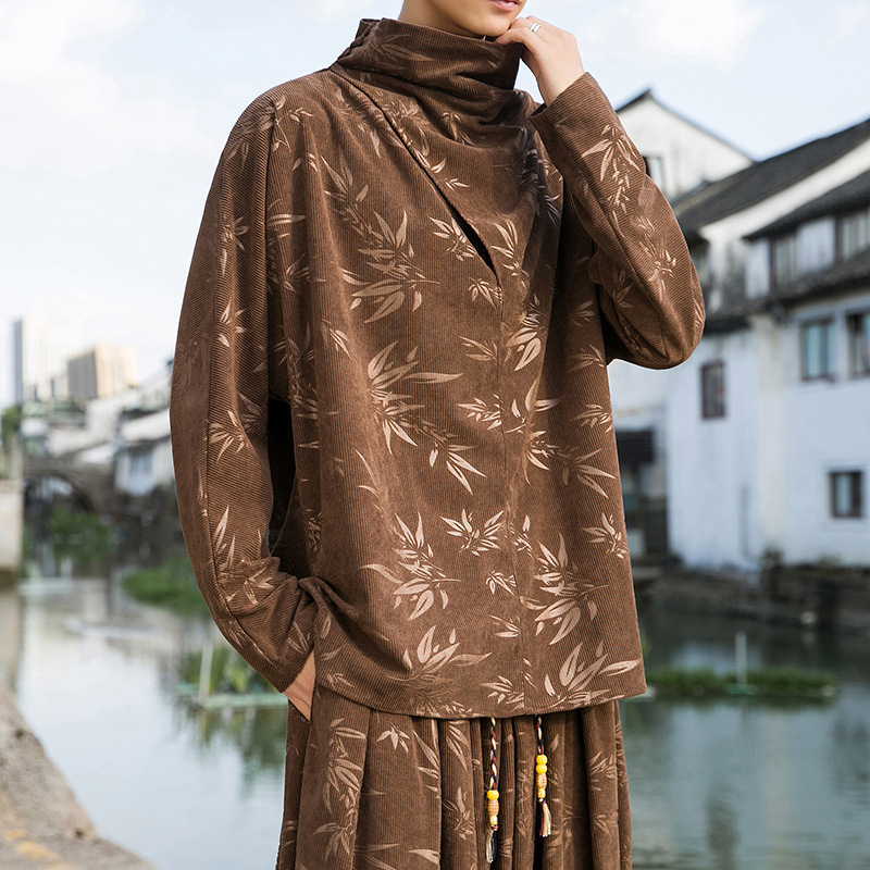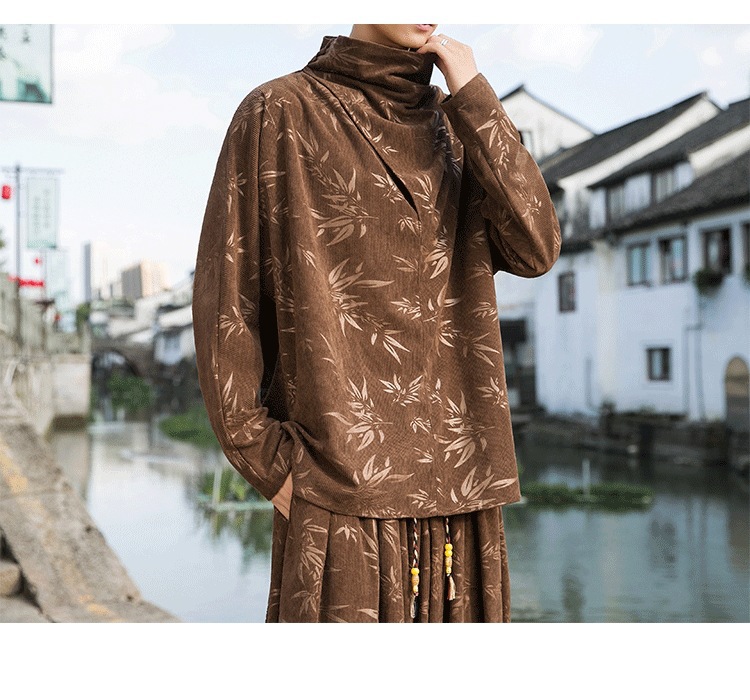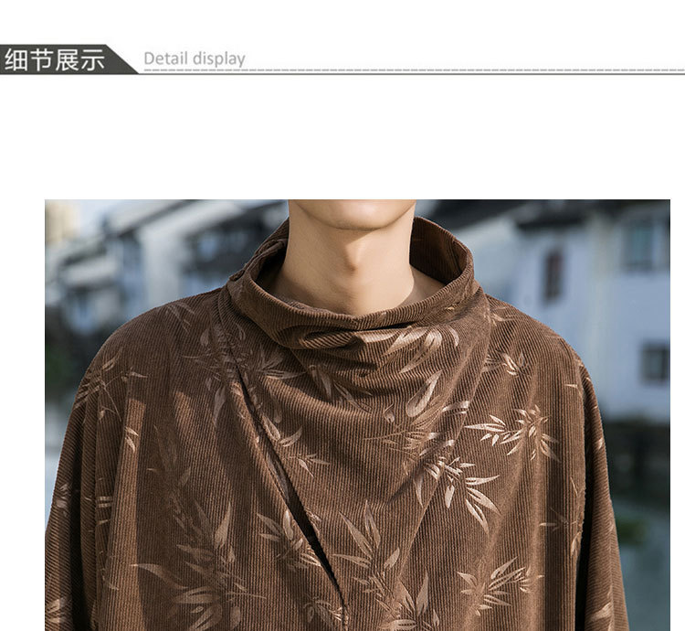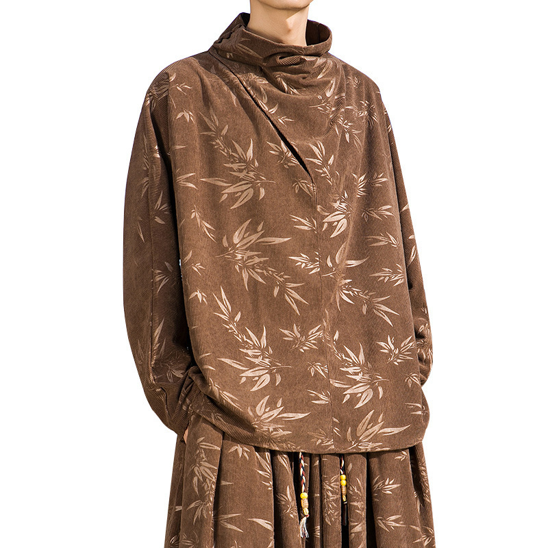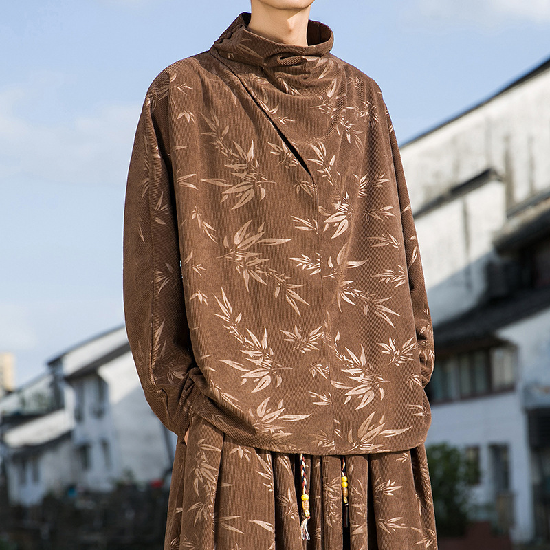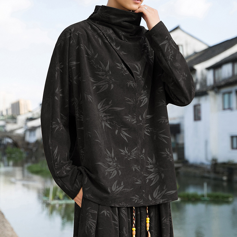 2025 새로운 가을, 겨울 중국 스타일 남성 트렌디 리프 코듀로이 틈새 푸시 칼라 터틀넥 티셔츠 바닥 셔츠