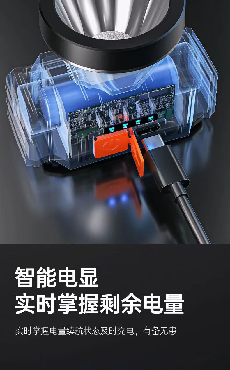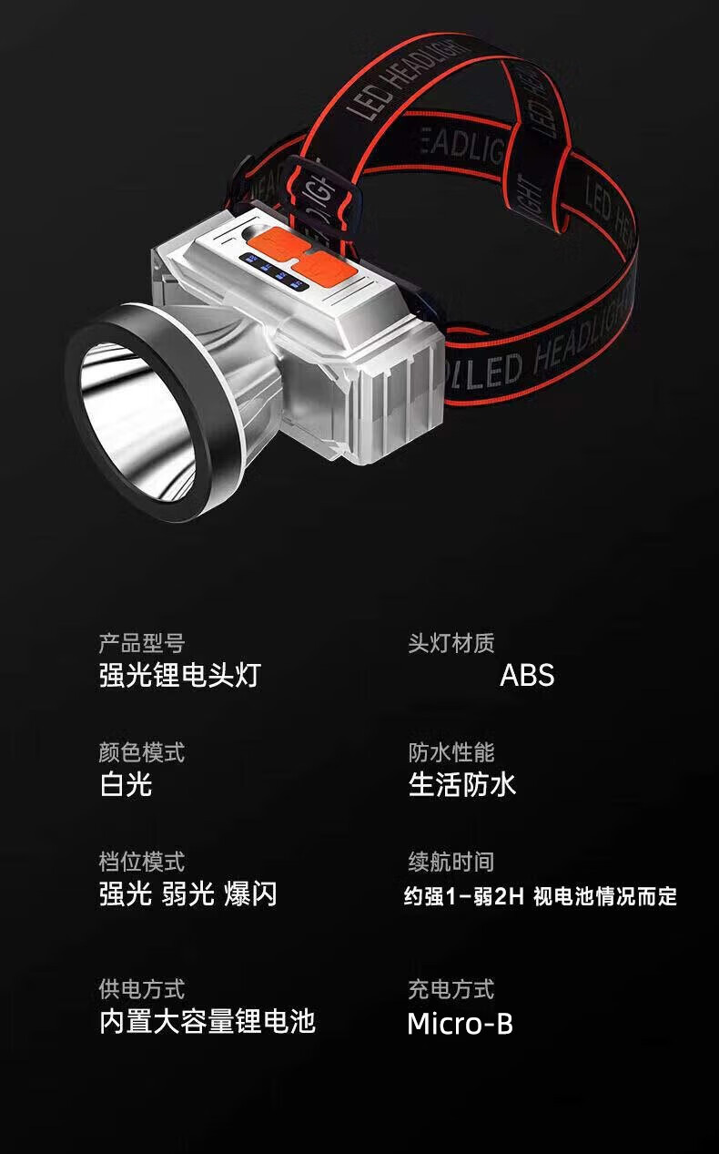 고정 초점 장거리 소형 헤드라이트 600mah 전자 디스플레이 + 데이터 케이블 박스형 검정색