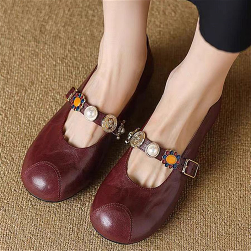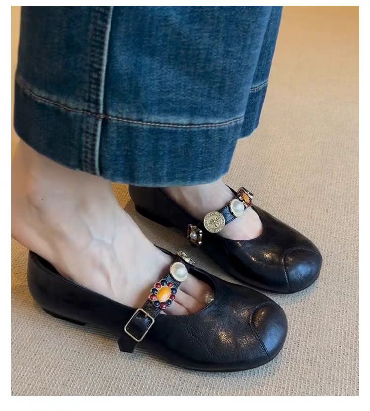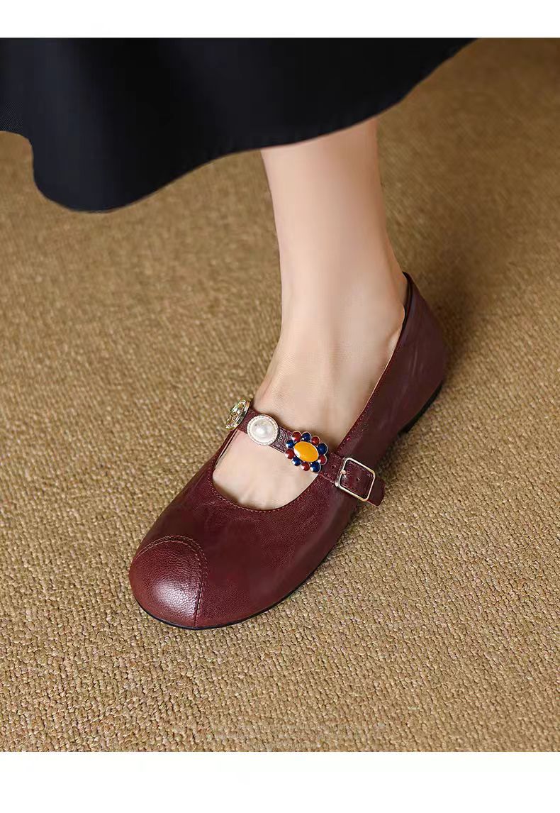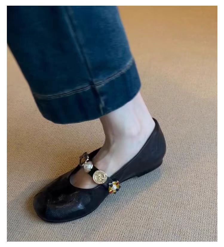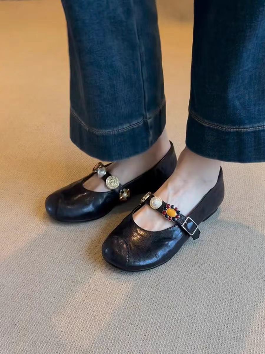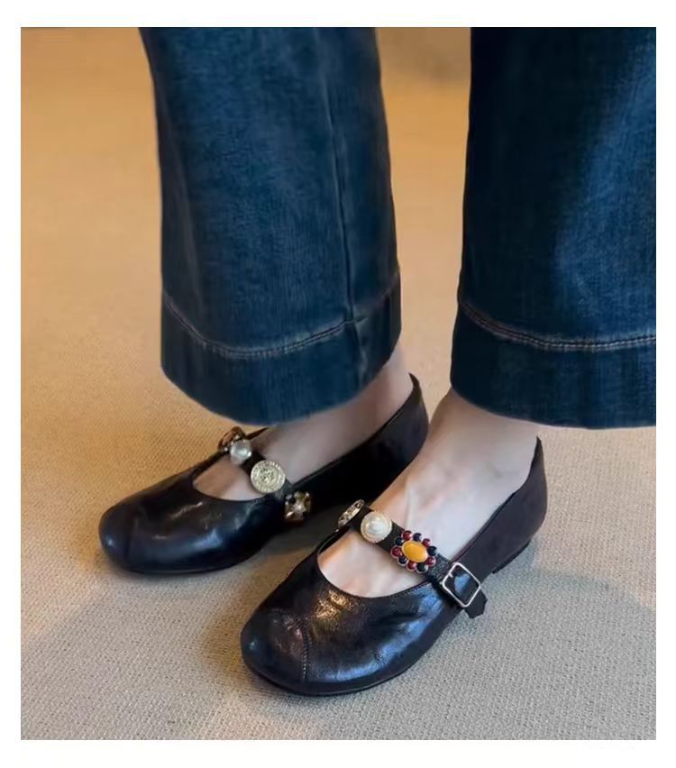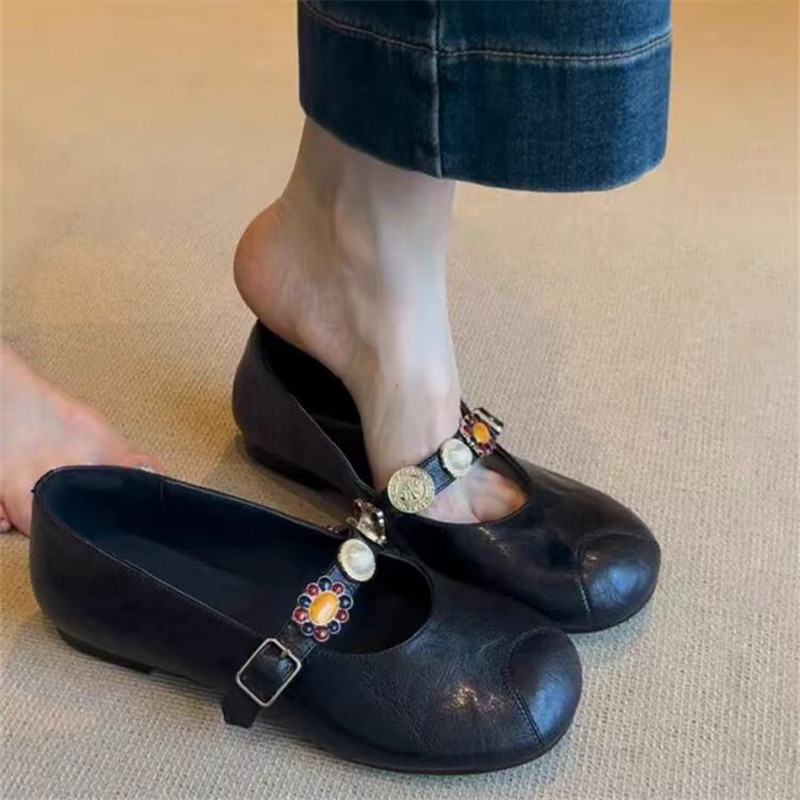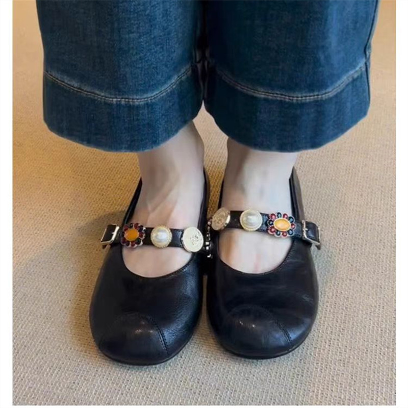 메리 제인과 함께 둥근 발가락 금속 버클 신발 여성용 얕은 입 발레 신발 빈티지 올매치 플랫 펄 신발