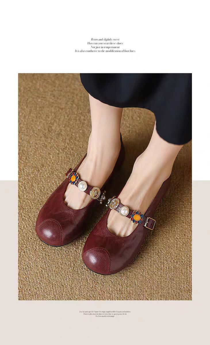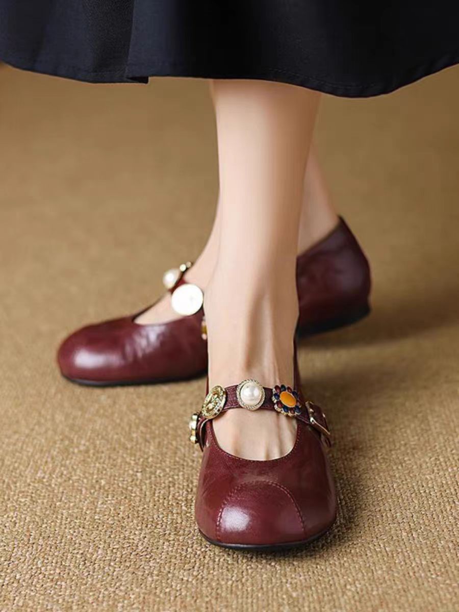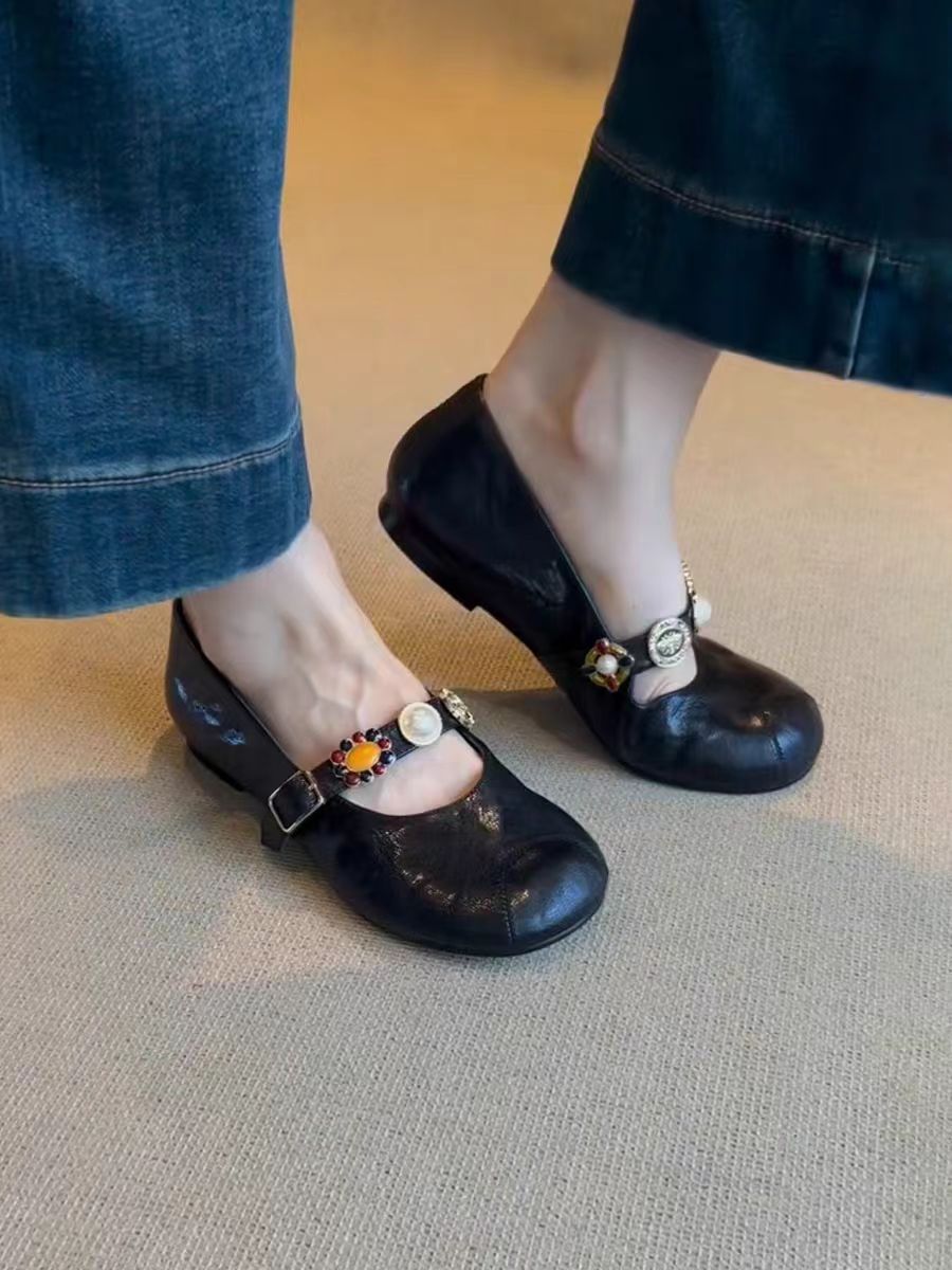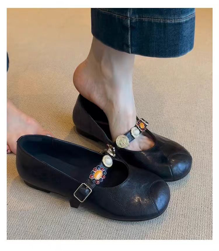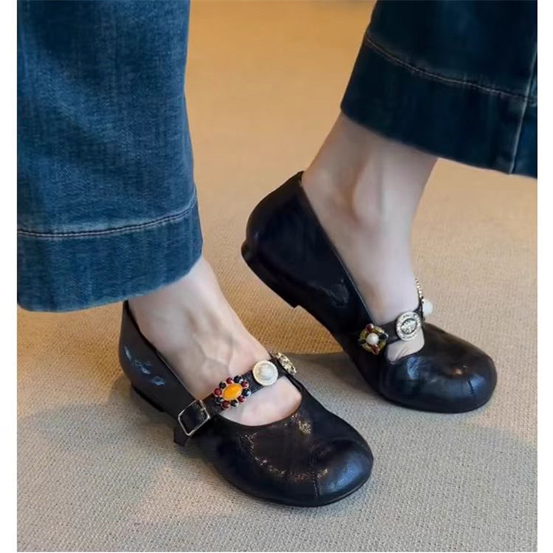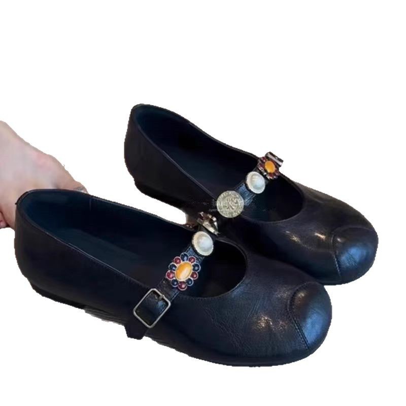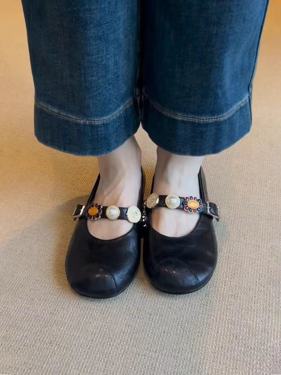 메리 제인과 함께 둥근 발가락 금속 버클 신발 여성용 얕은 입 발레 신발 빈티지 올매치 플랫 펄 신발