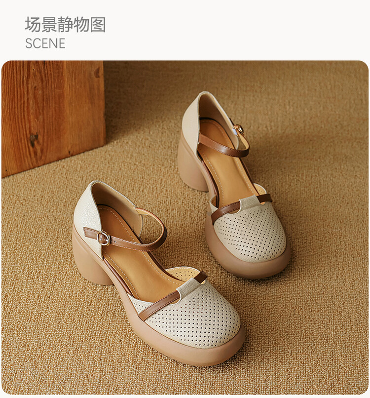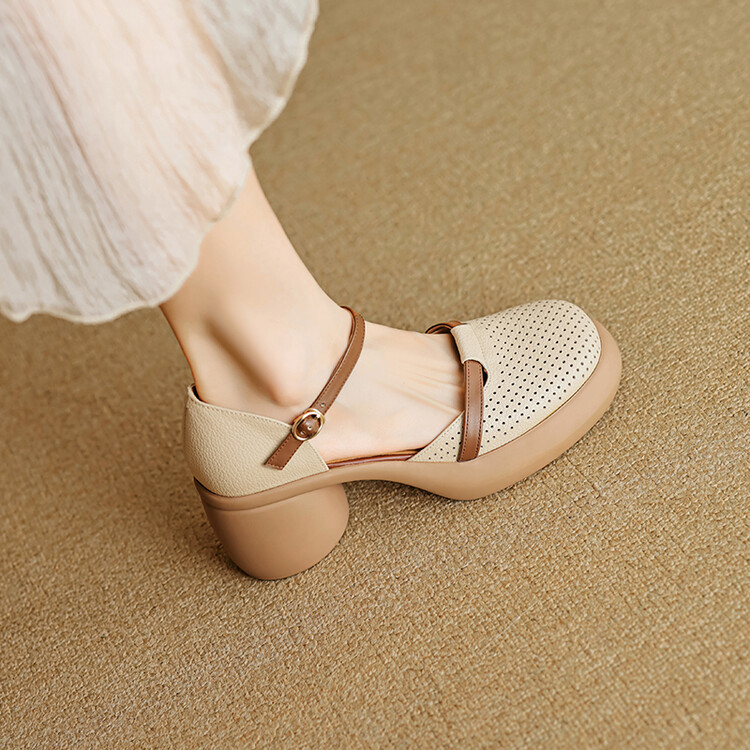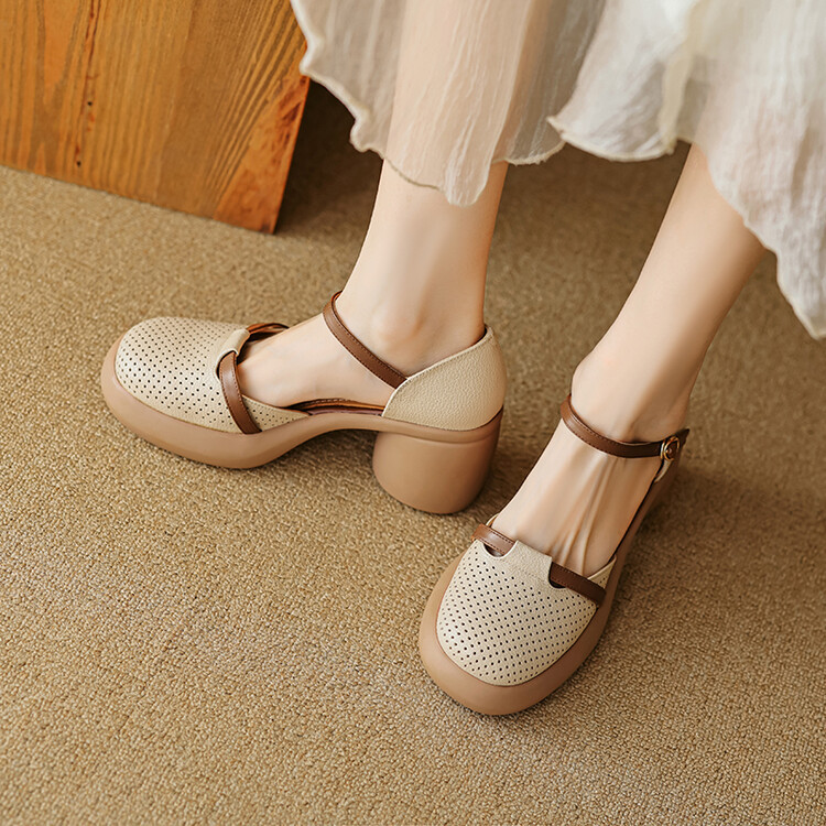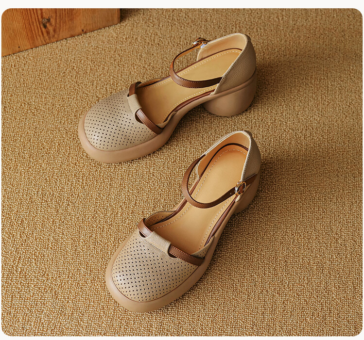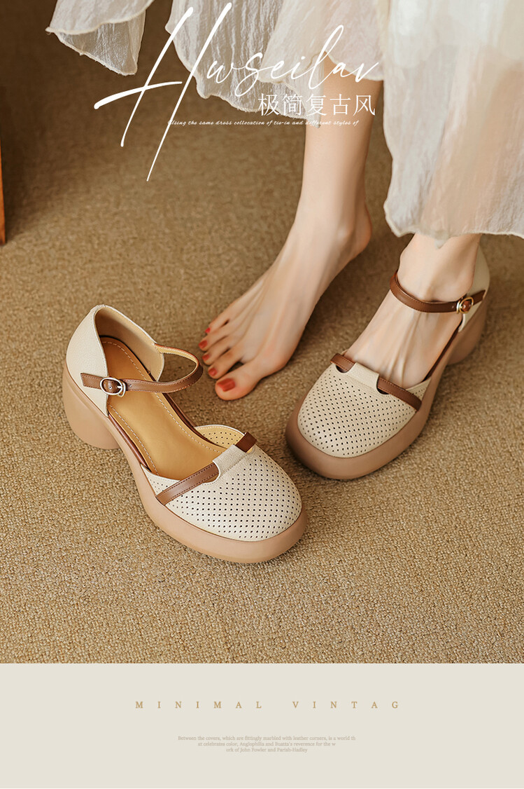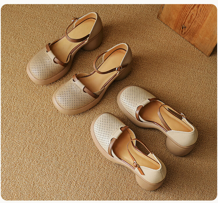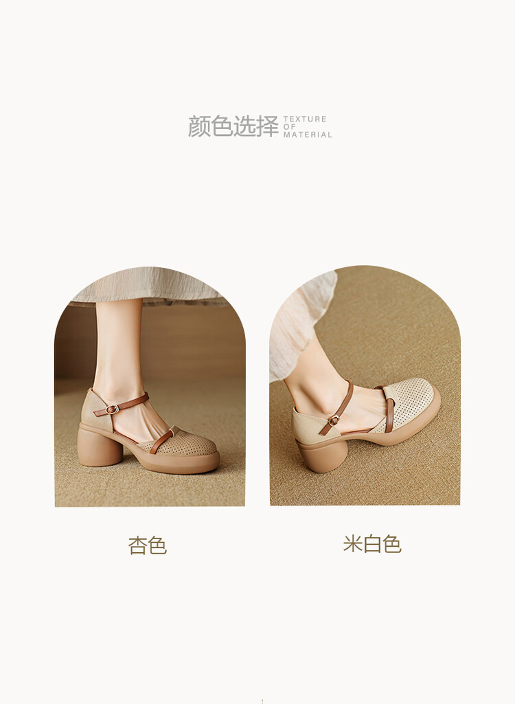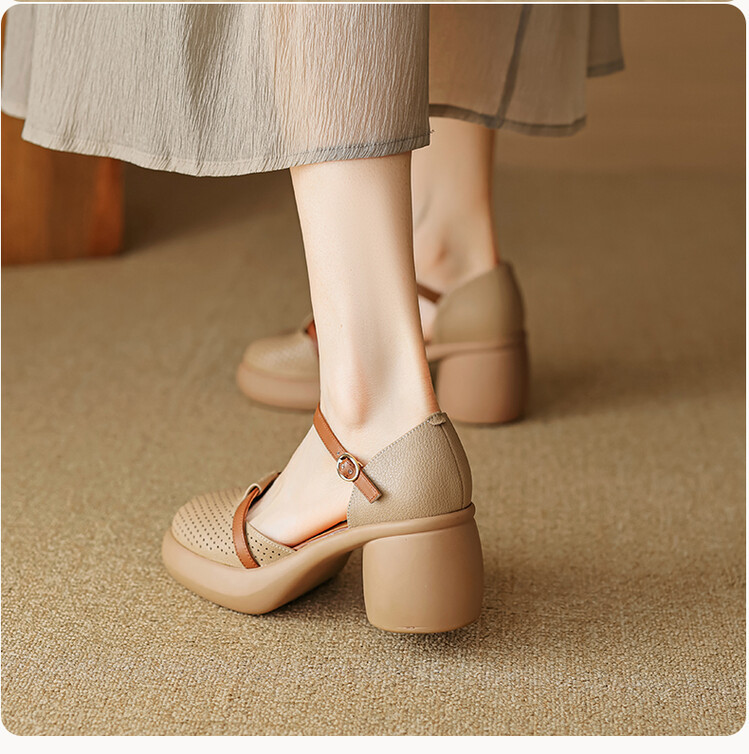 정품 가죽 발가락 두꺼운 단독 스트랩 로마 샌들 여성의 새로운 여름 중공 구멍 신발 프렌치 블록 힐 하이힐