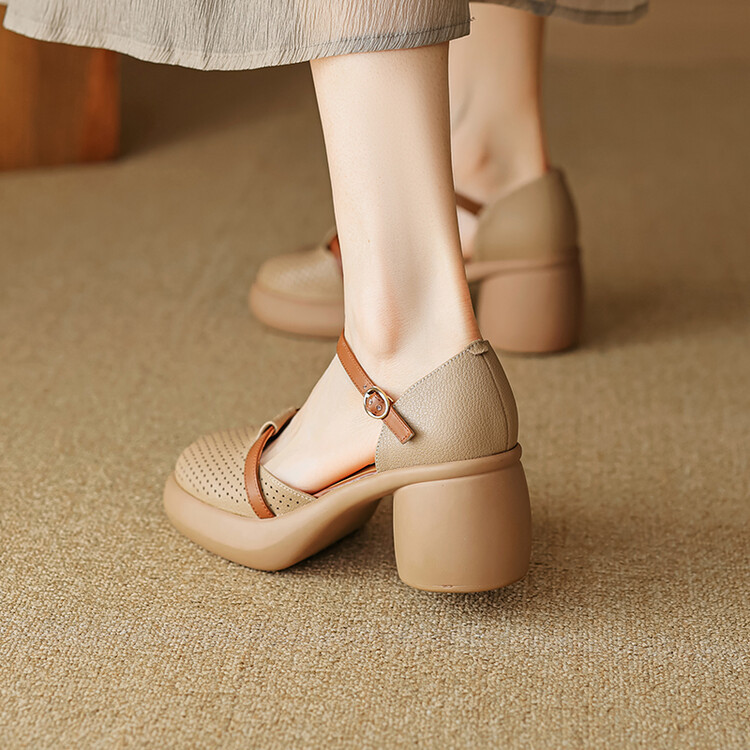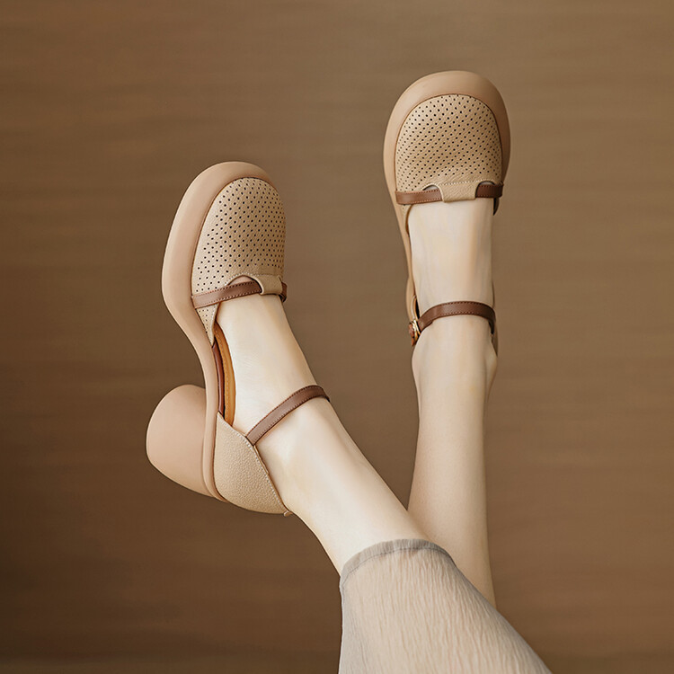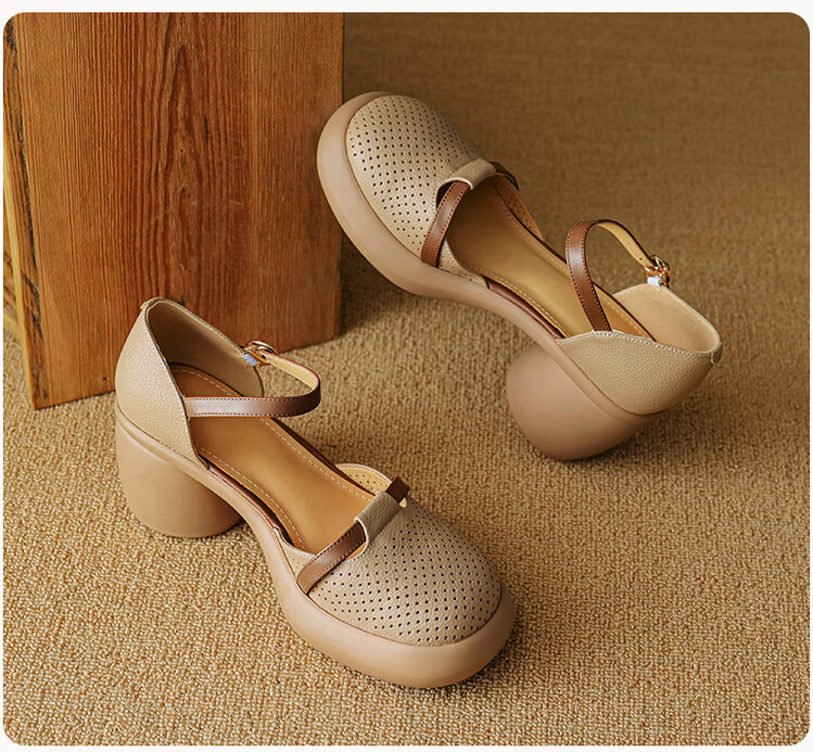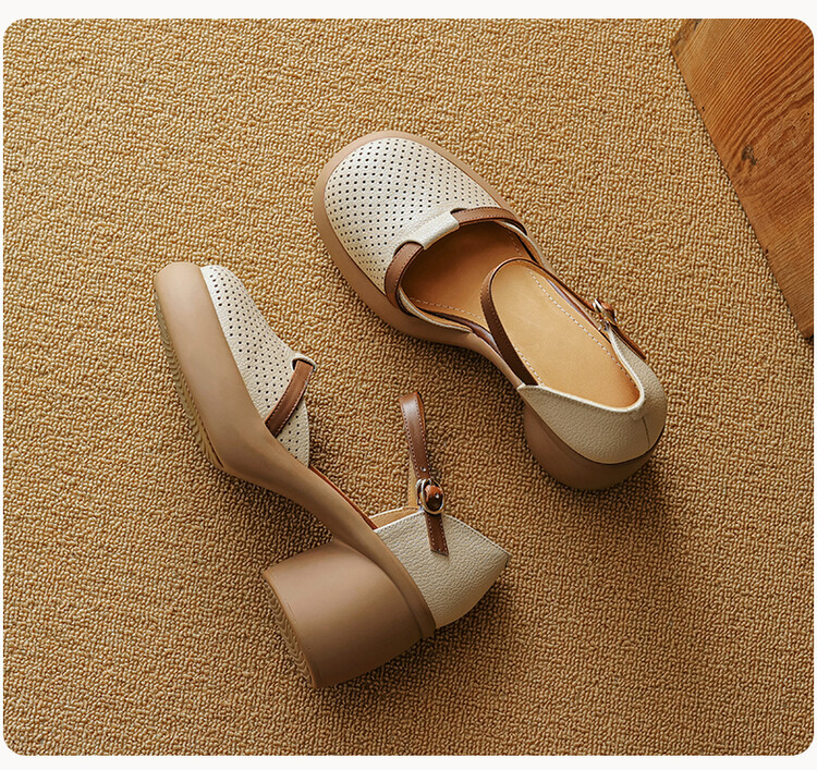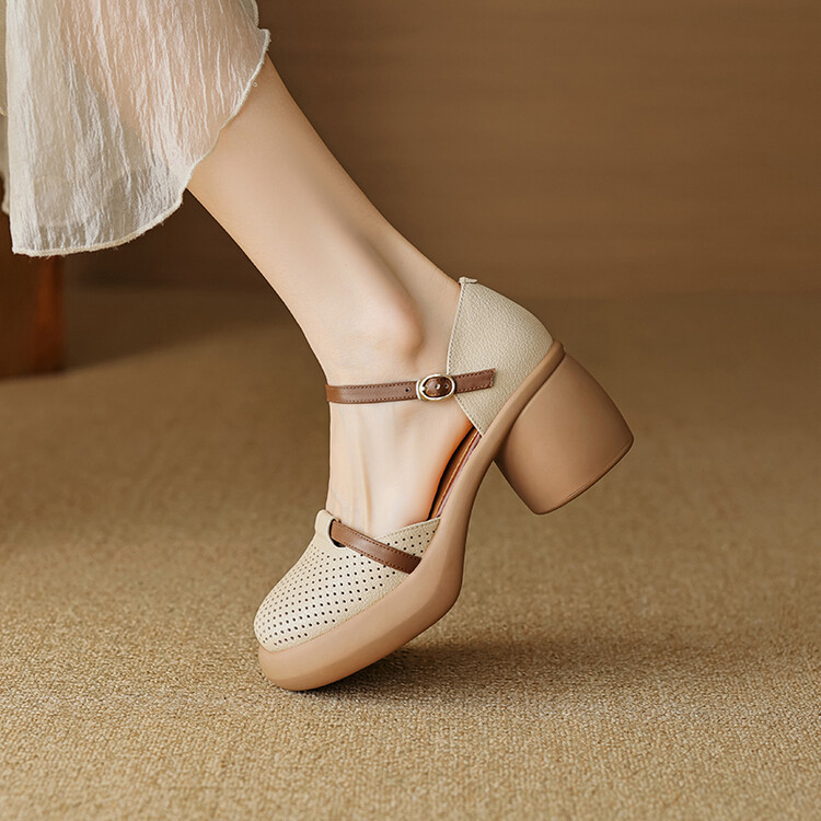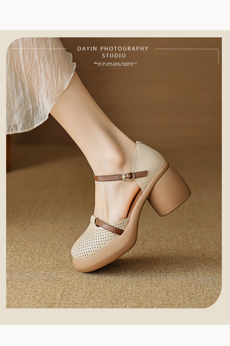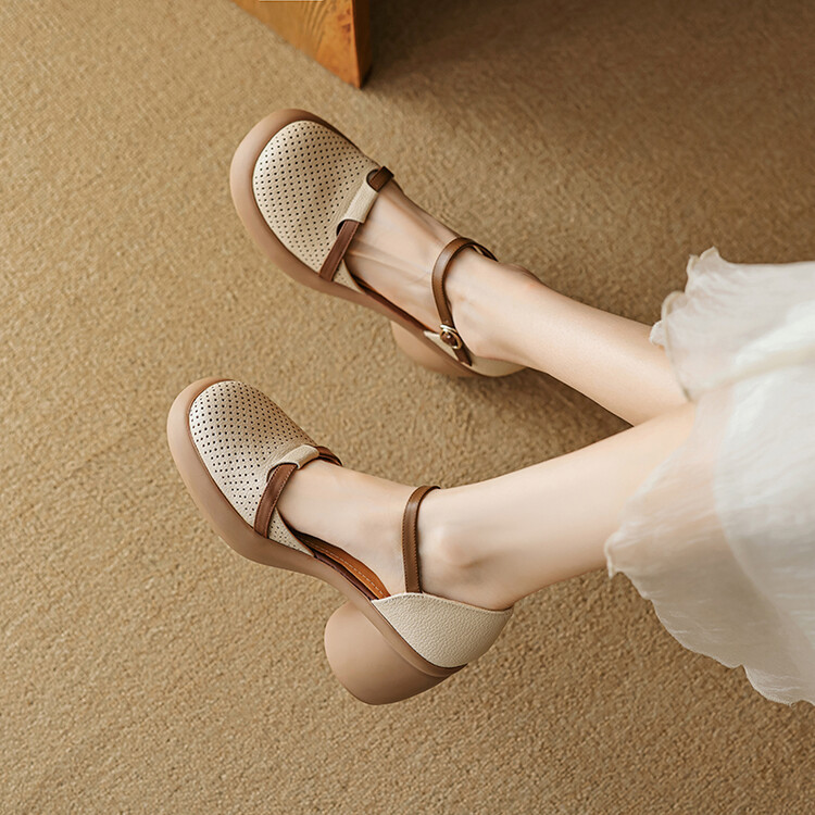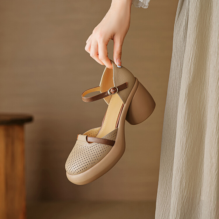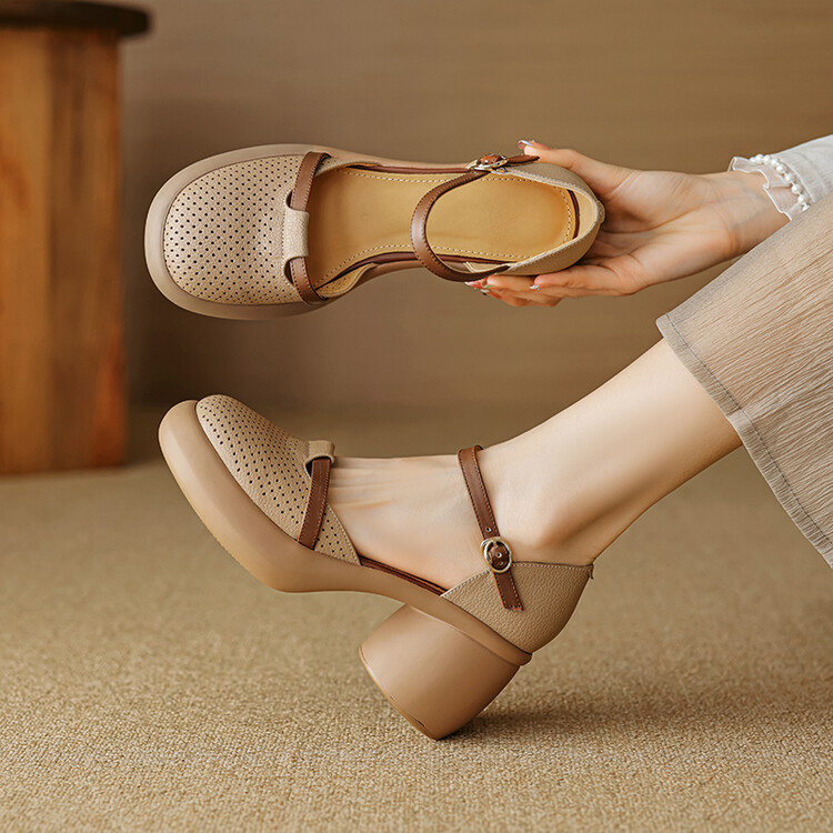 정품 가죽 발가락 두꺼운 단독 스트랩 로마 샌들 여성의 새로운 여름 중공 구멍 신발 프렌치 블록 힐 하이힐