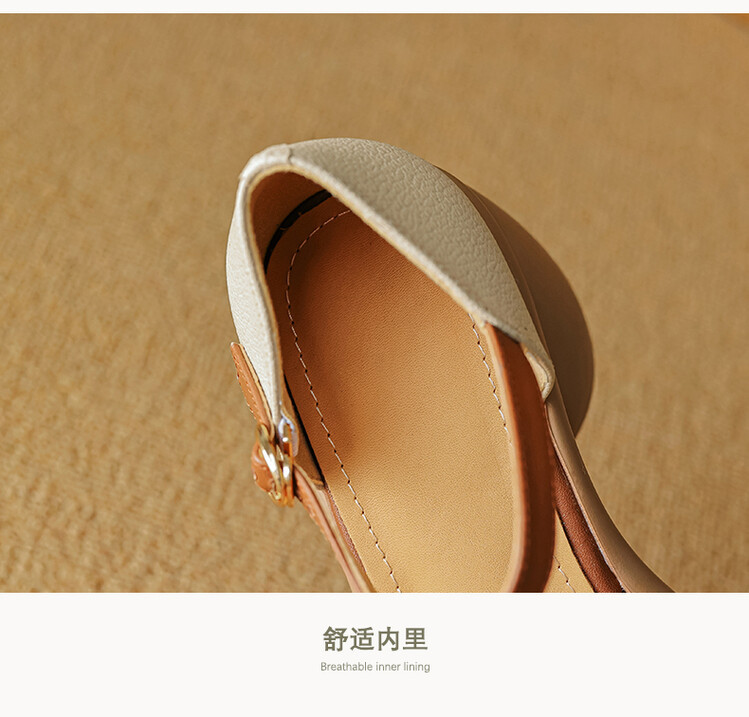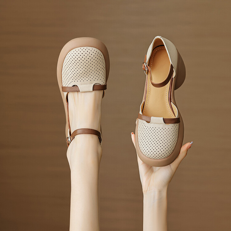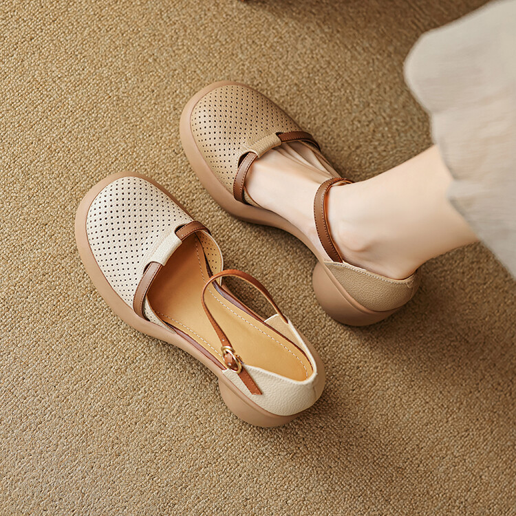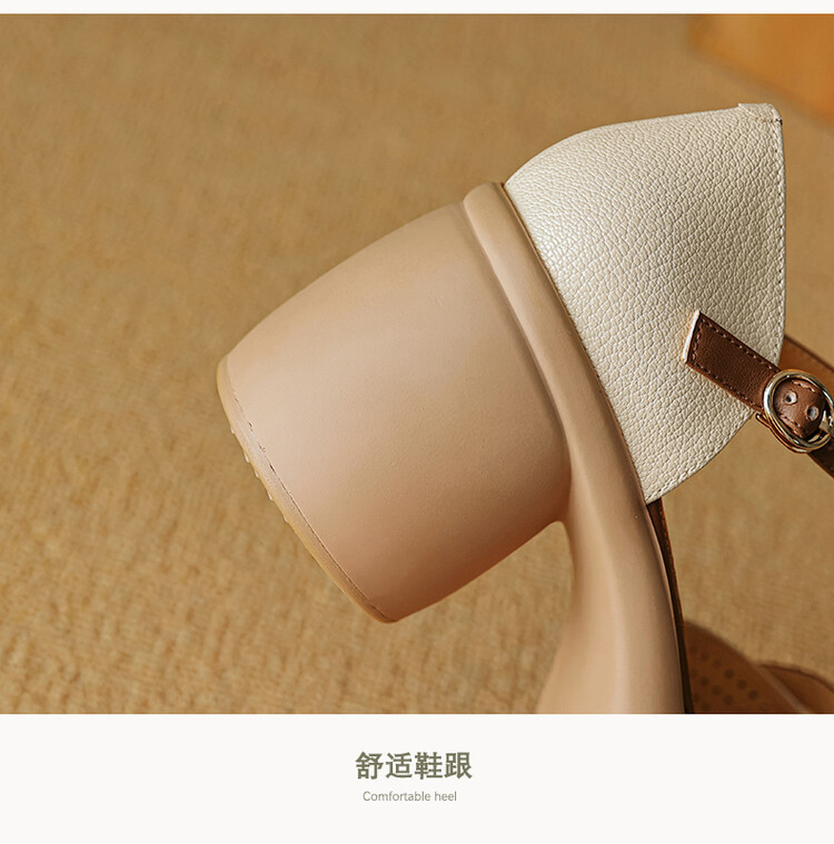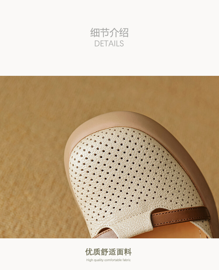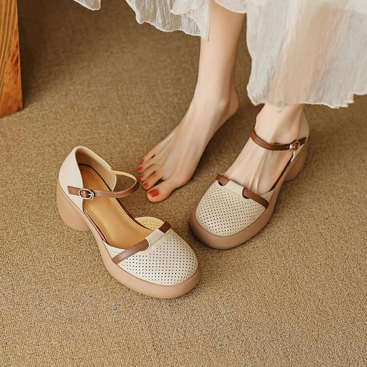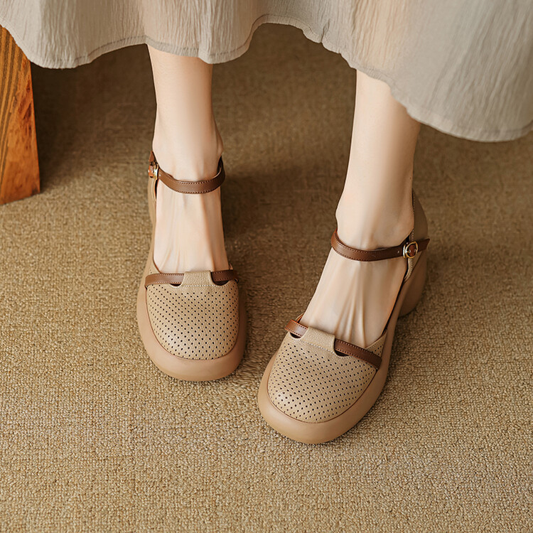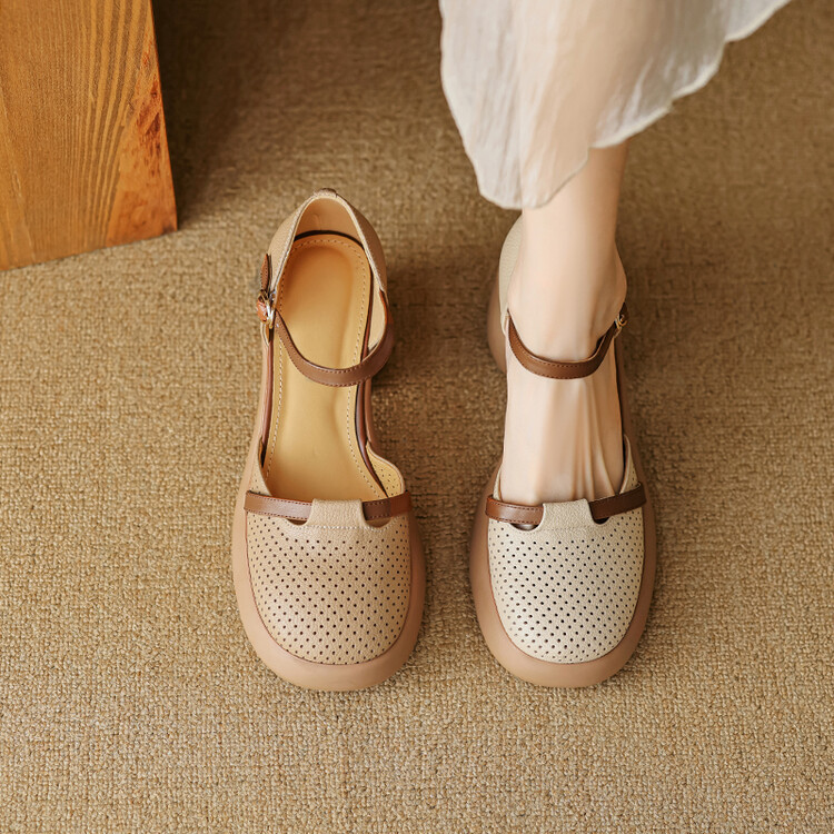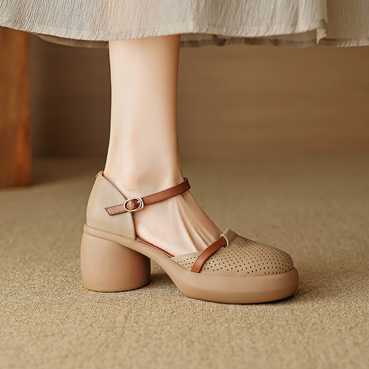 정품 가죽 발가락 두꺼운 단독 스트랩 로마 샌들 여성의 새로운 여름 중공 구멍 신발 프렌치 블록 힐 하이힐