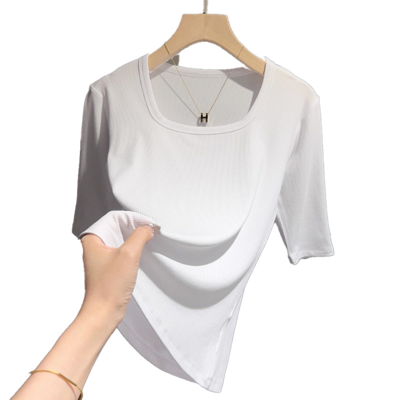 다크 그레이 스퀘어넥 5부소매 티셔츠 여성용 2026 여름 신상 슬림핏 중간소매 슬리밍 베이스 반팔탑