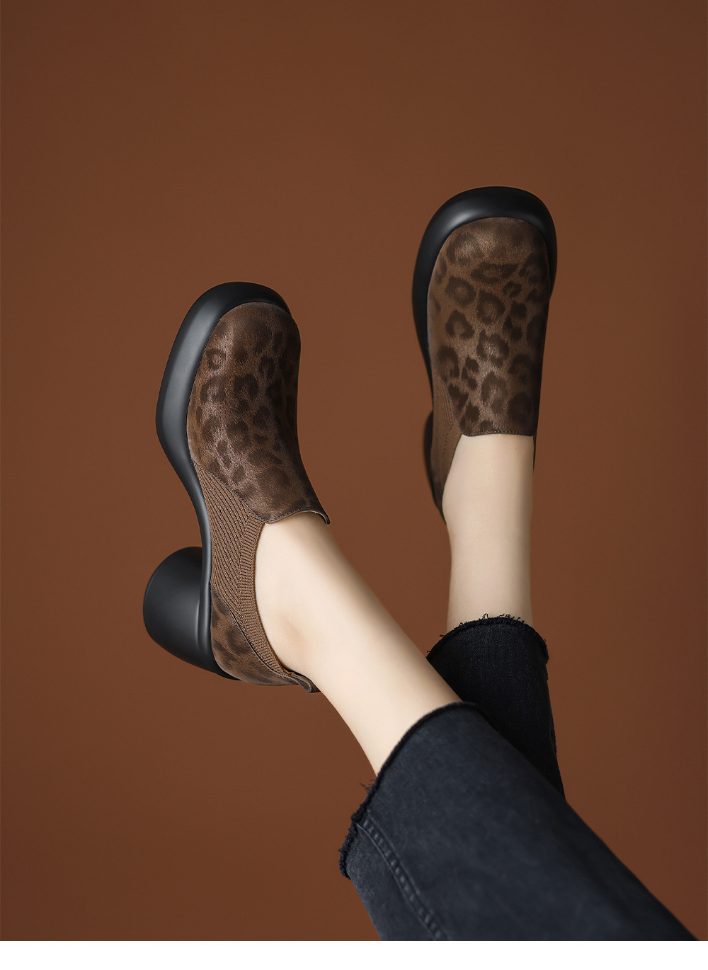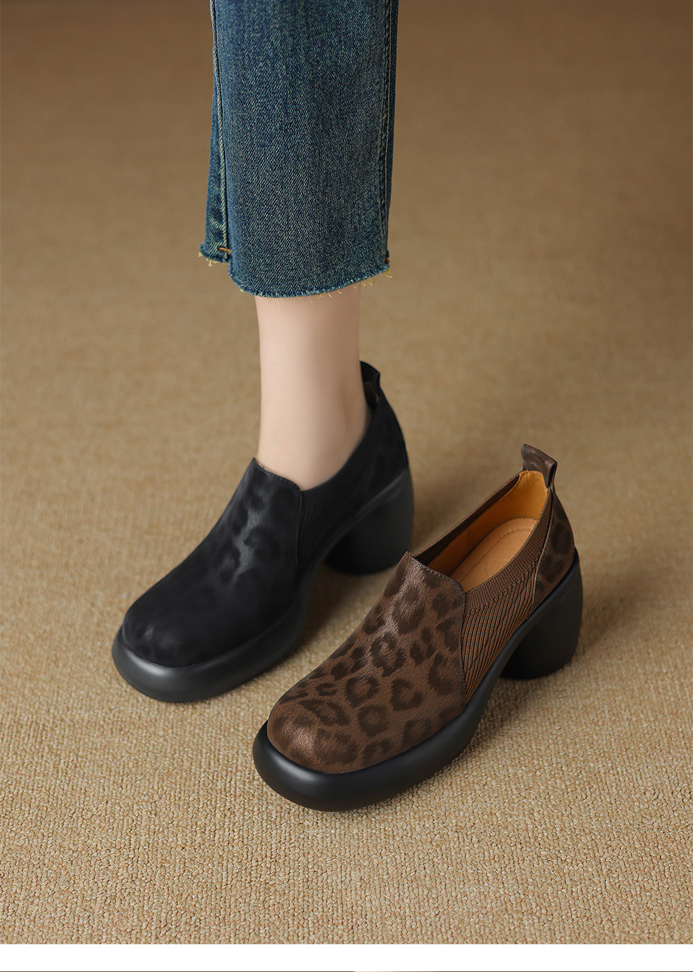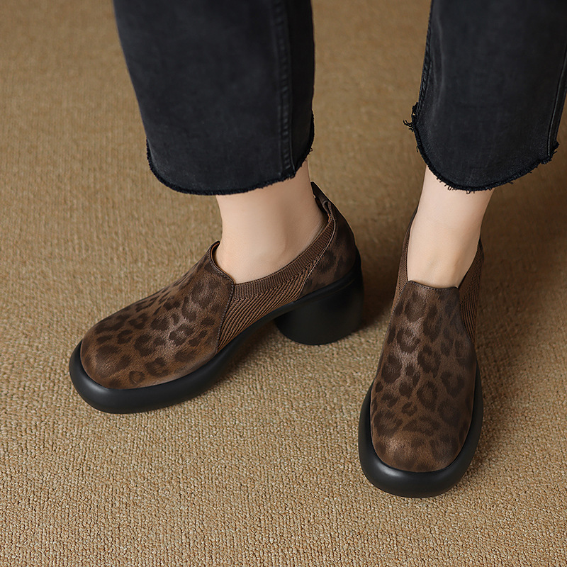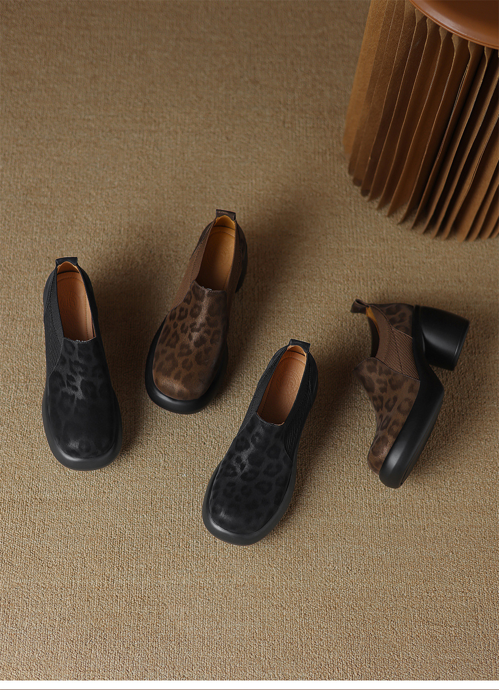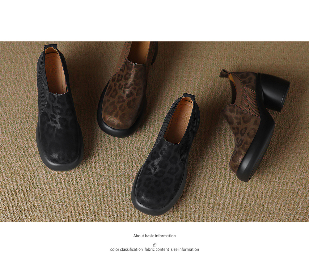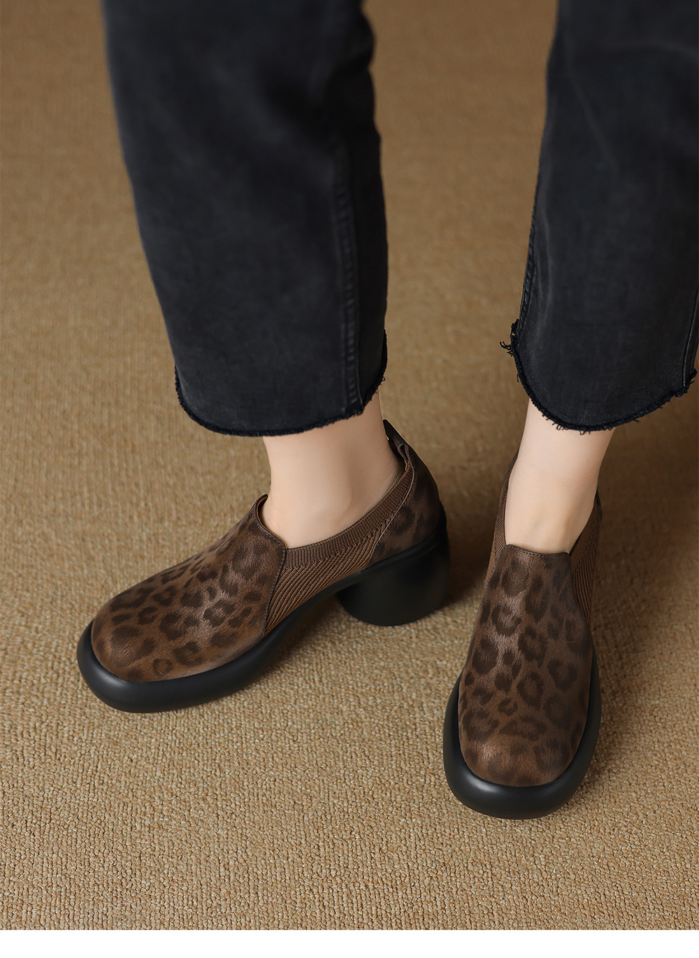 여성을위한 복고풍 스퀘어 토 레오파드 프린트 소가죽 두꺼운 굽 두꺼운 밑창 신발 2025 봄 새로운 딥 로퍼 슈즈는 매치하기 쉽습니다.