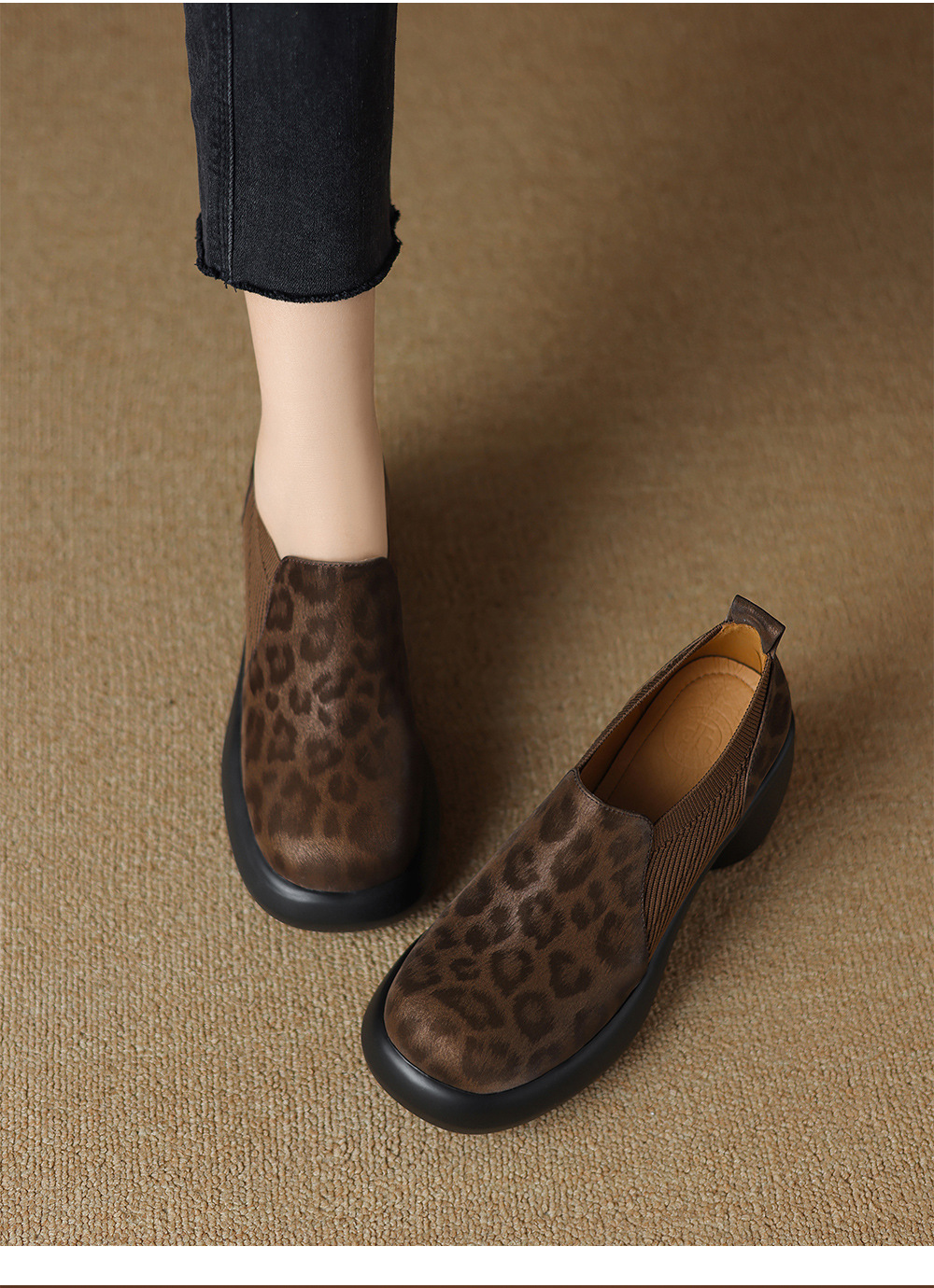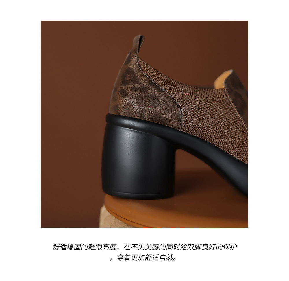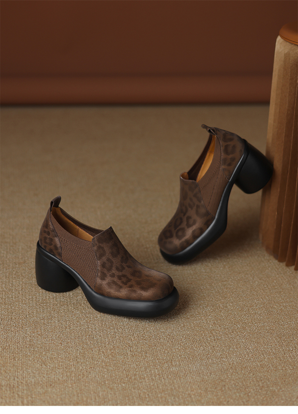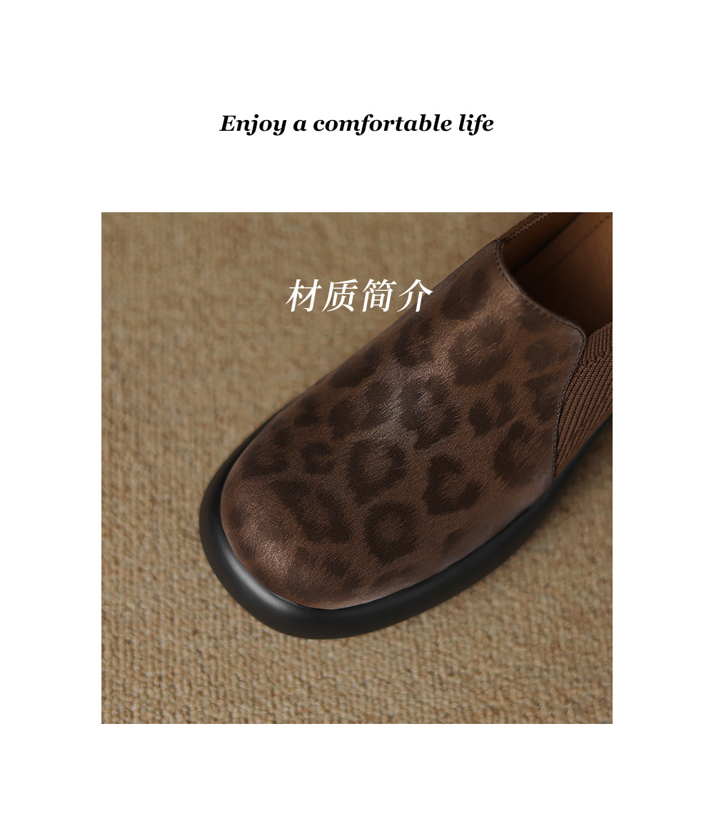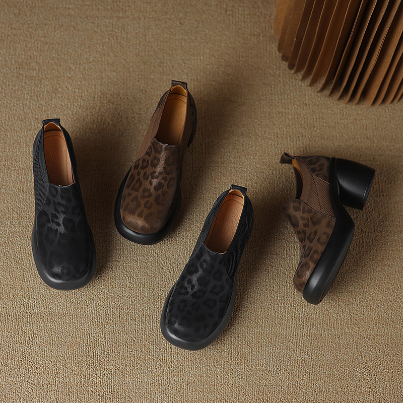 여성을위한 복고풍 스퀘어 토 레오파드 프린트 소가죽 두꺼운 굽 두꺼운 밑창 신발 2025 봄 새로운 딥 로퍼 슈즈는 매치하기 쉽습니다.