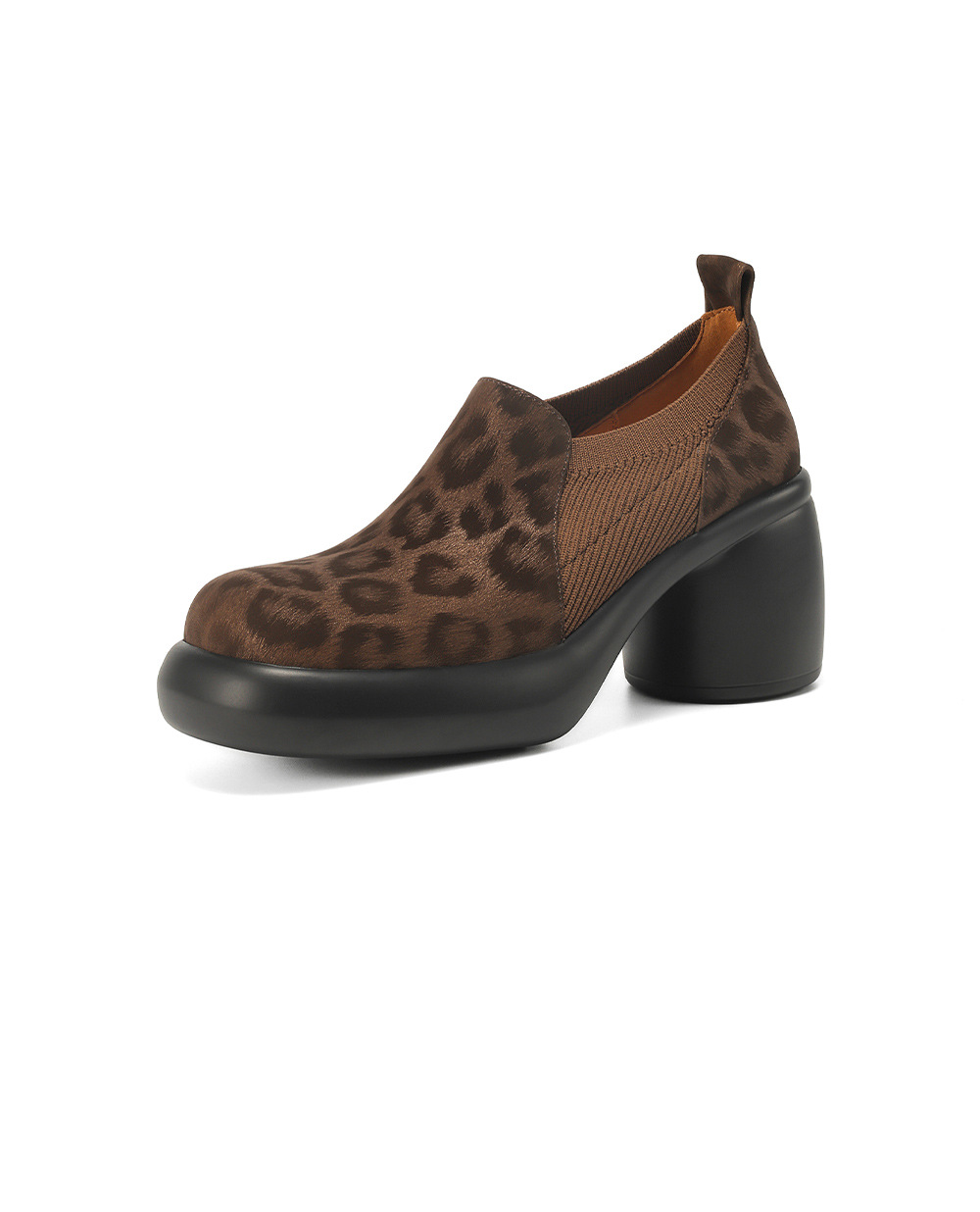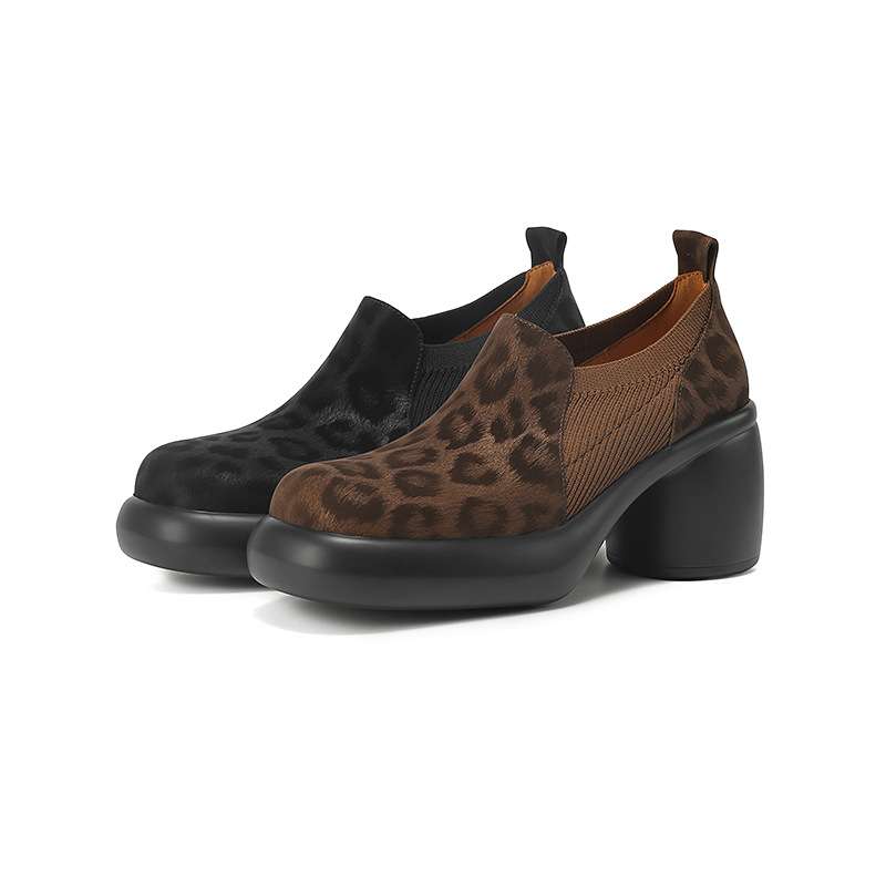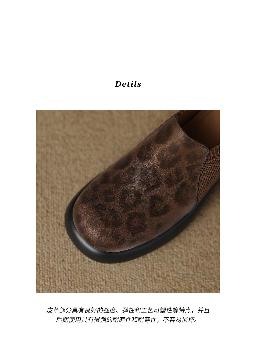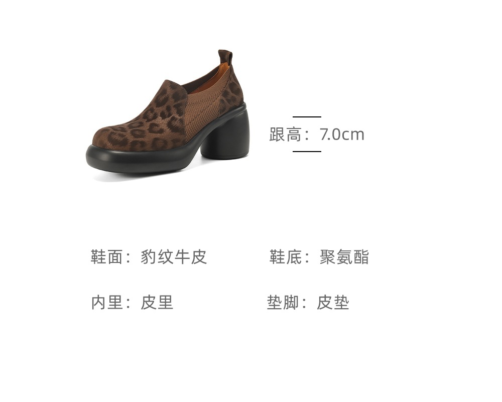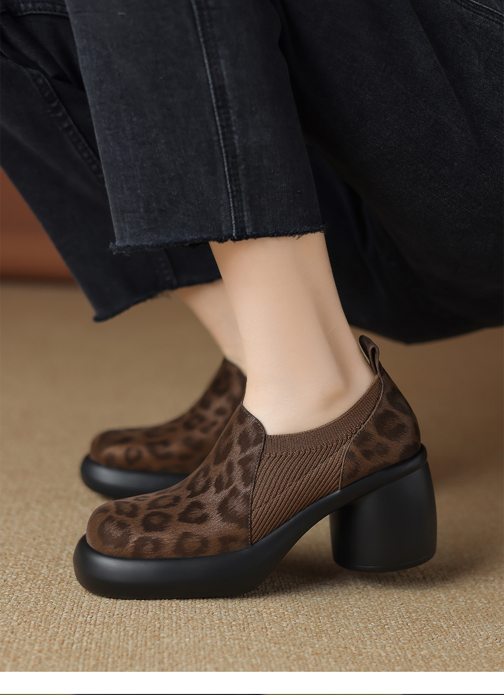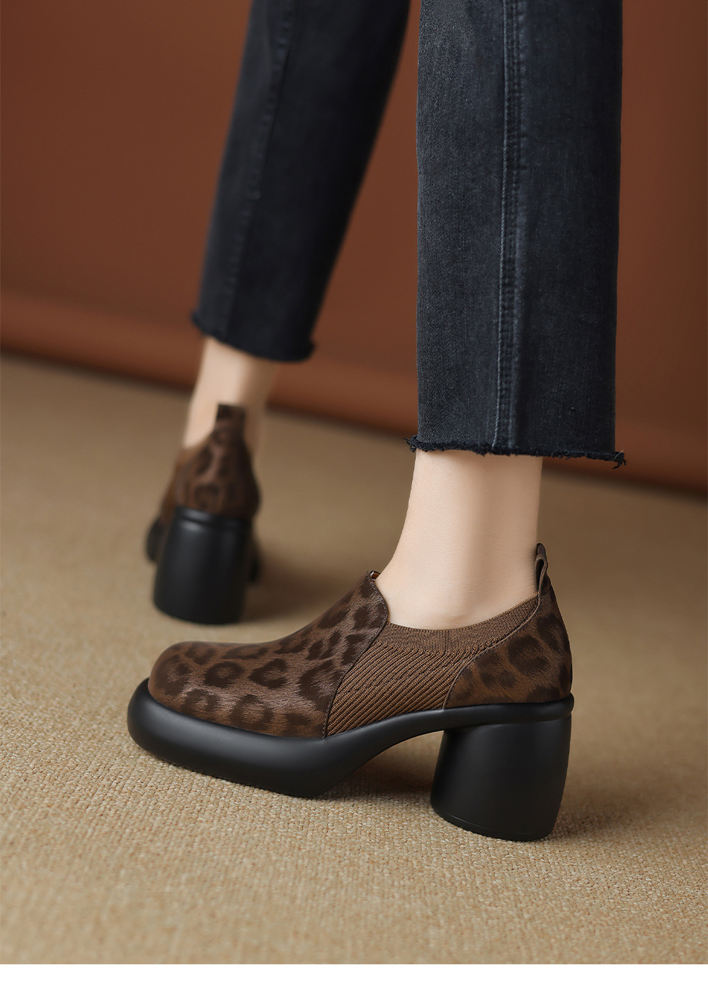 여성을위한 복고풍 스퀘어 토 레오파드 프린트 소가죽 두꺼운 굽 두꺼운 밑창 신발 2025 봄 새로운 딥 로퍼 슈즈는 매치하기 쉽습니다.