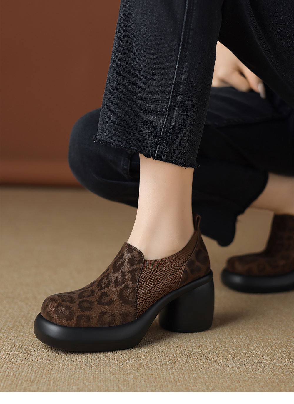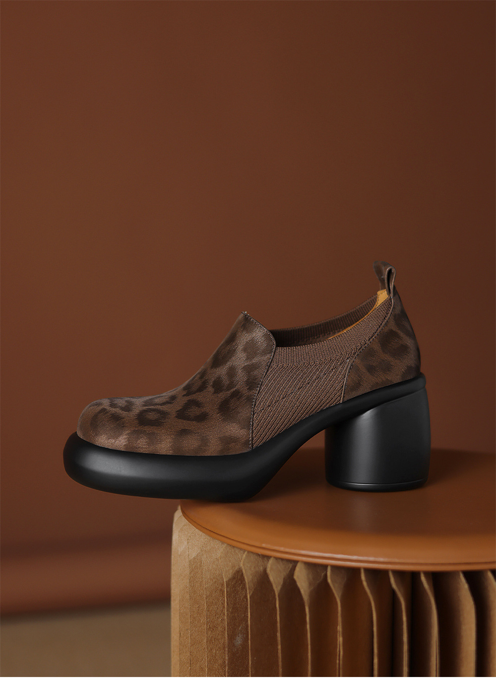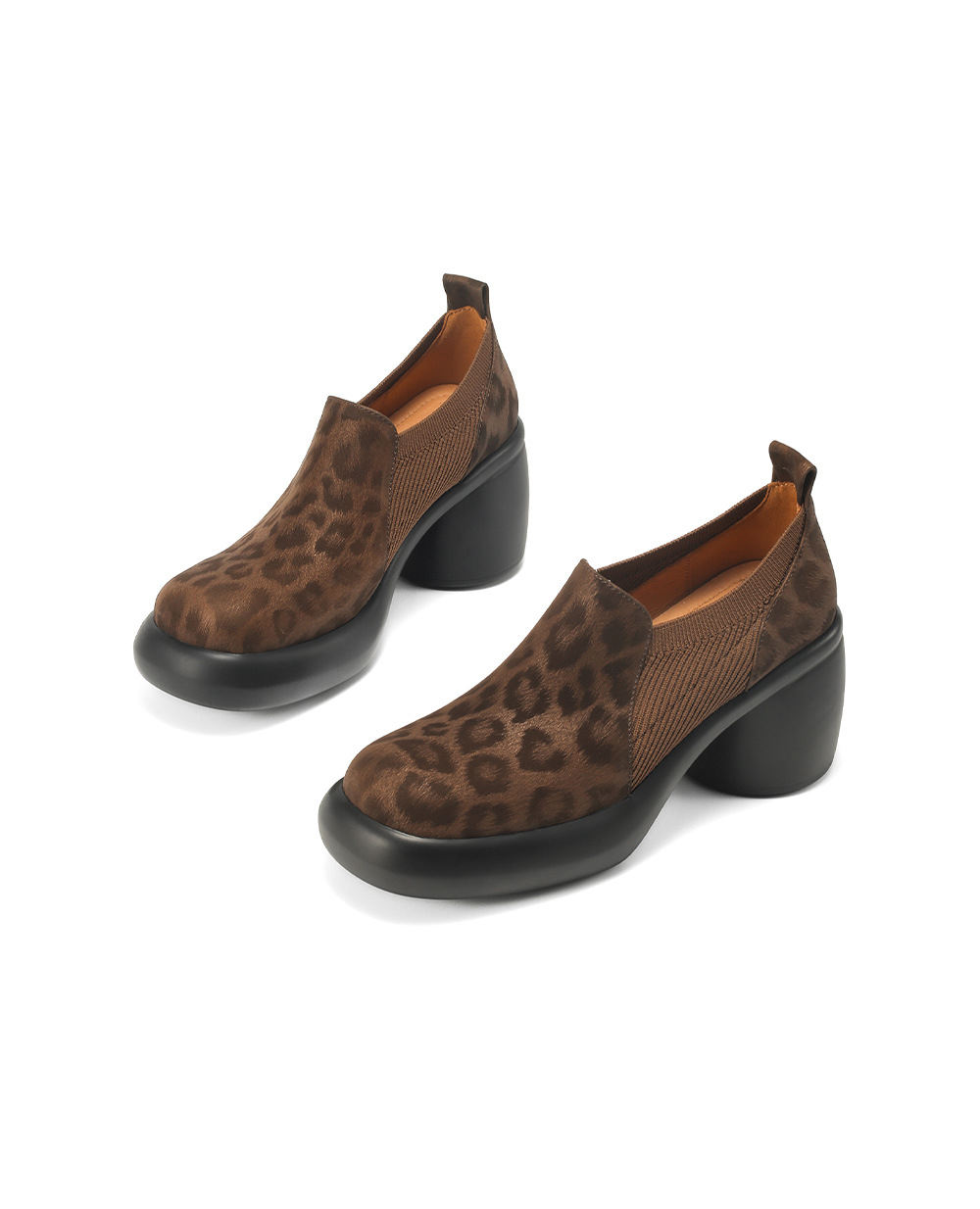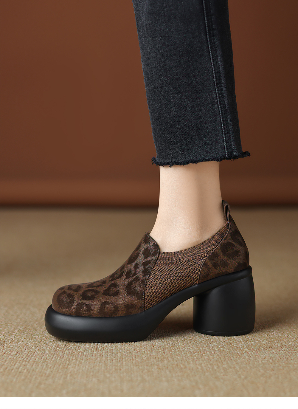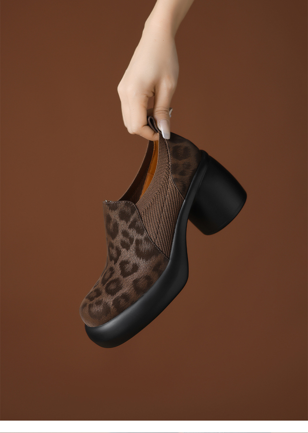 여성을위한 복고풍 스퀘어 토 레오파드 프린트 소가죽 두꺼운 굽 두꺼운 밑창 신발 2025 봄 새로운 딥 로퍼 슈즈는 매치하기 쉽습니다.