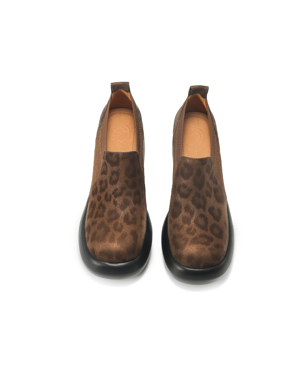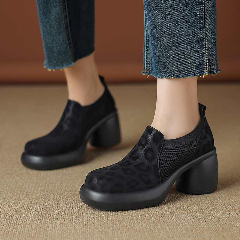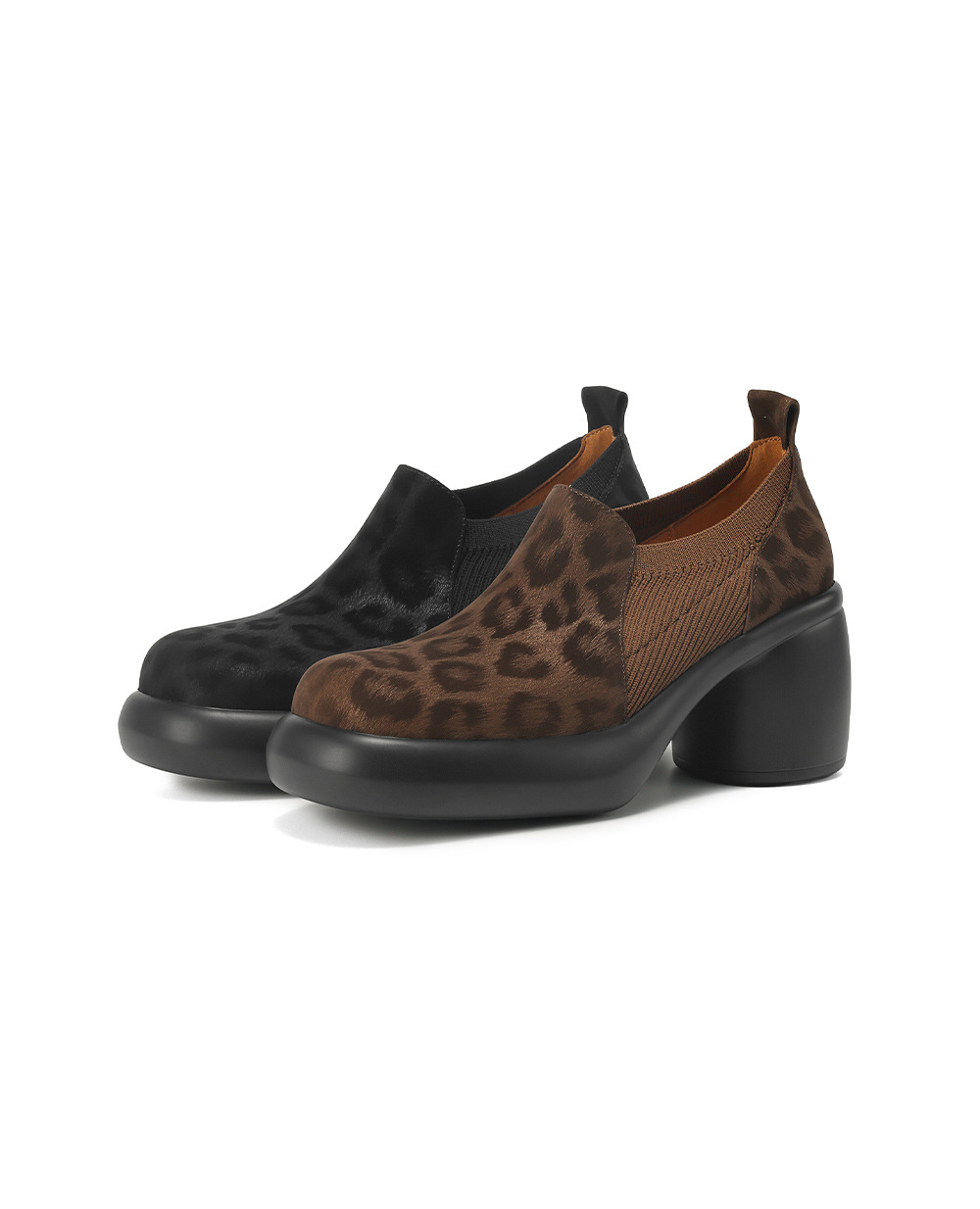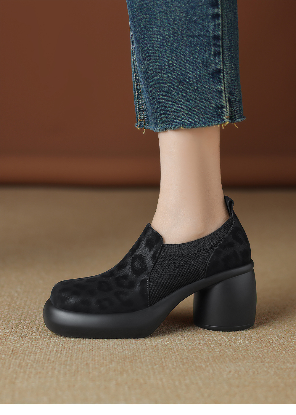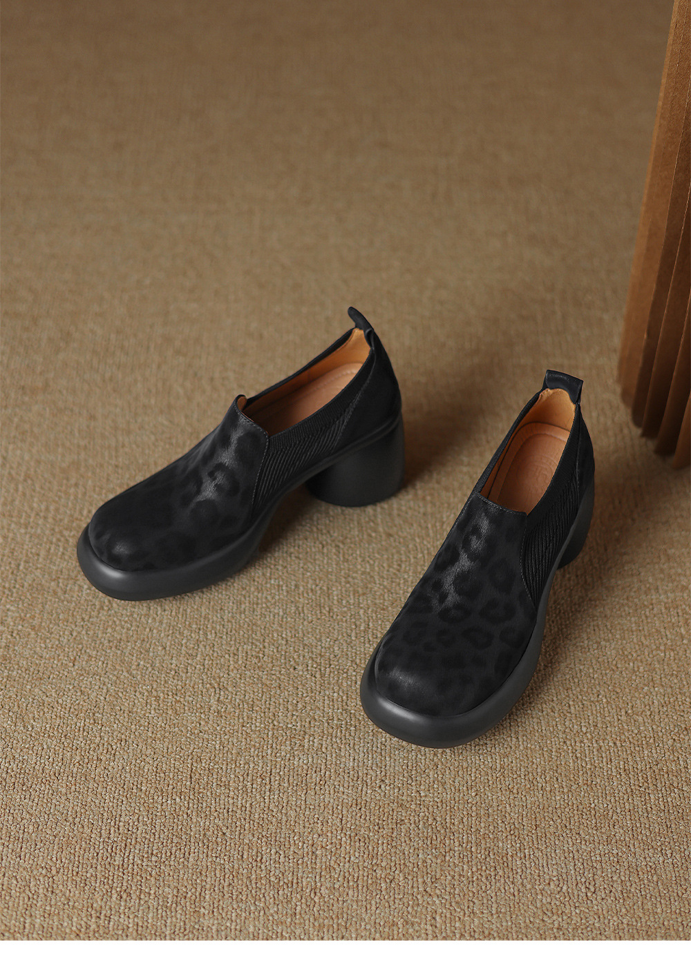 여성을위한 복고풍 스퀘어 토 레오파드 프린트 소가죽 두꺼운 굽 두꺼운 밑창 신발 2025 봄 새로운 딥 로퍼 슈즈는 매치하기 쉽습니다.