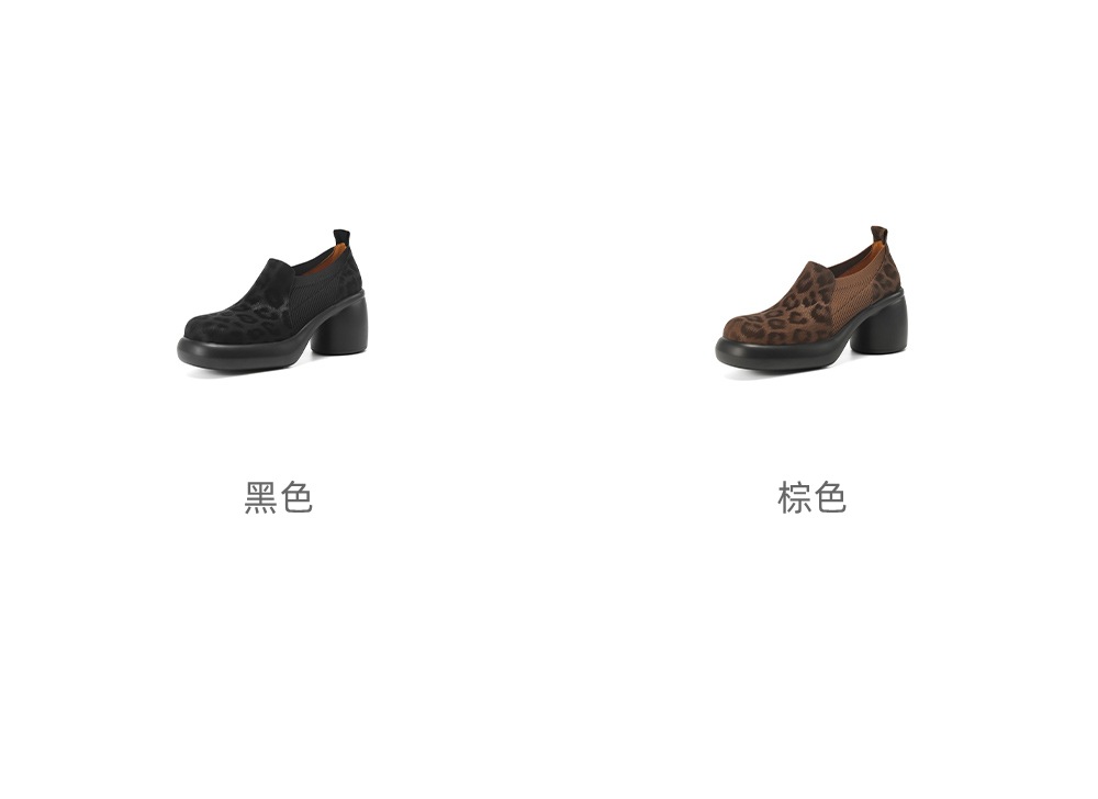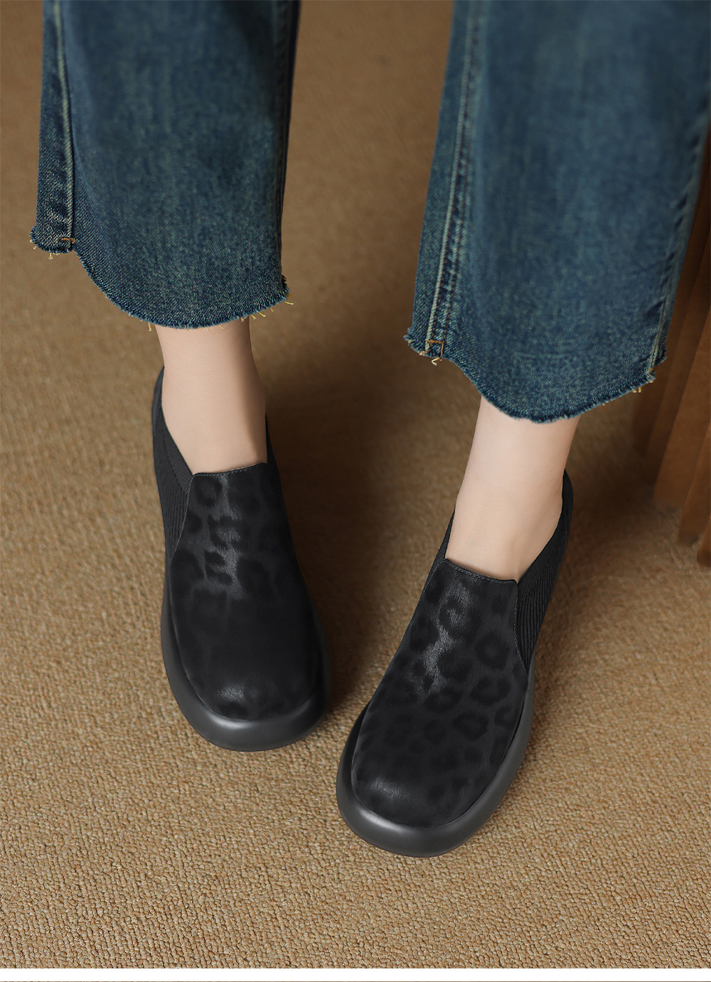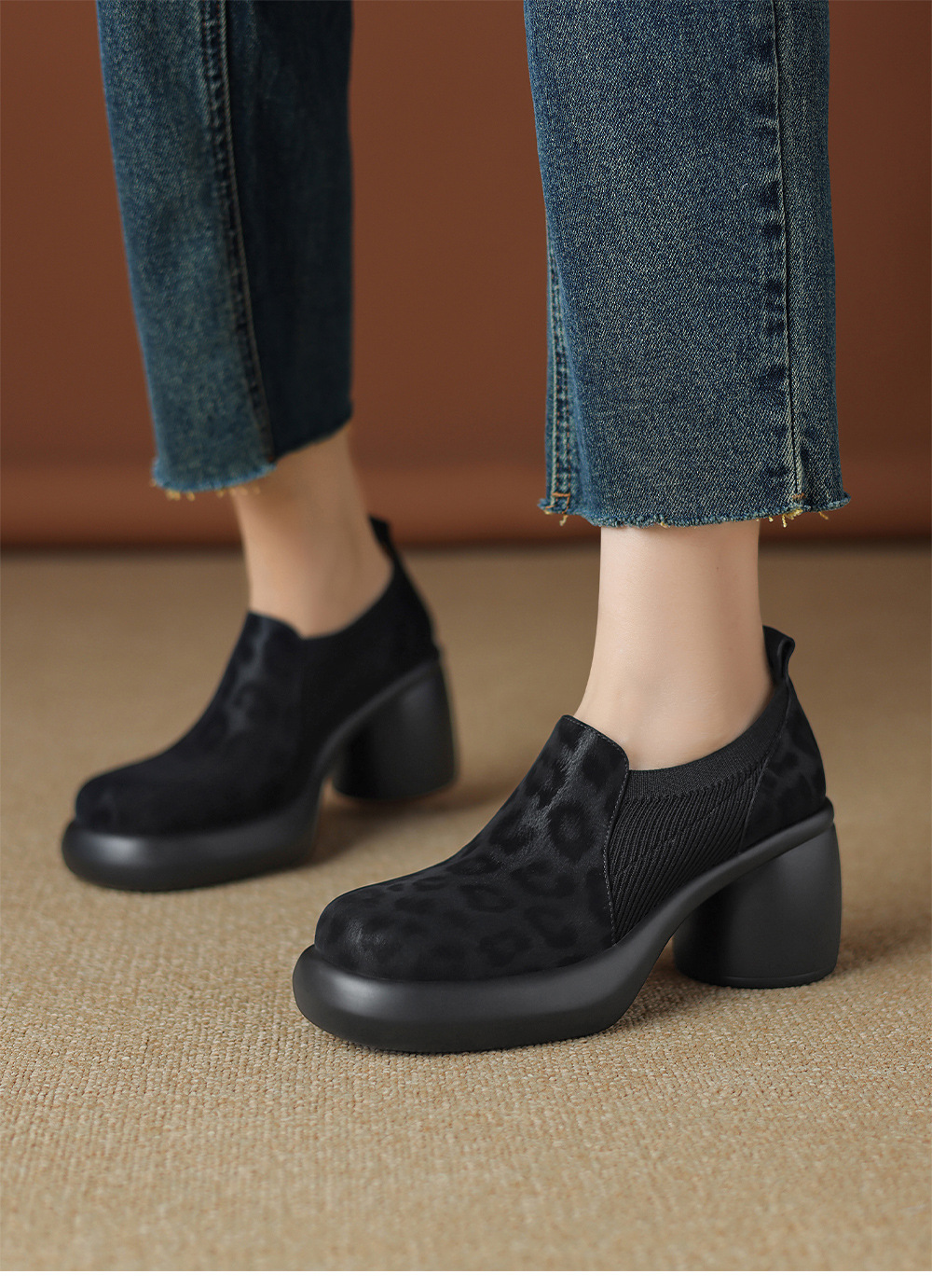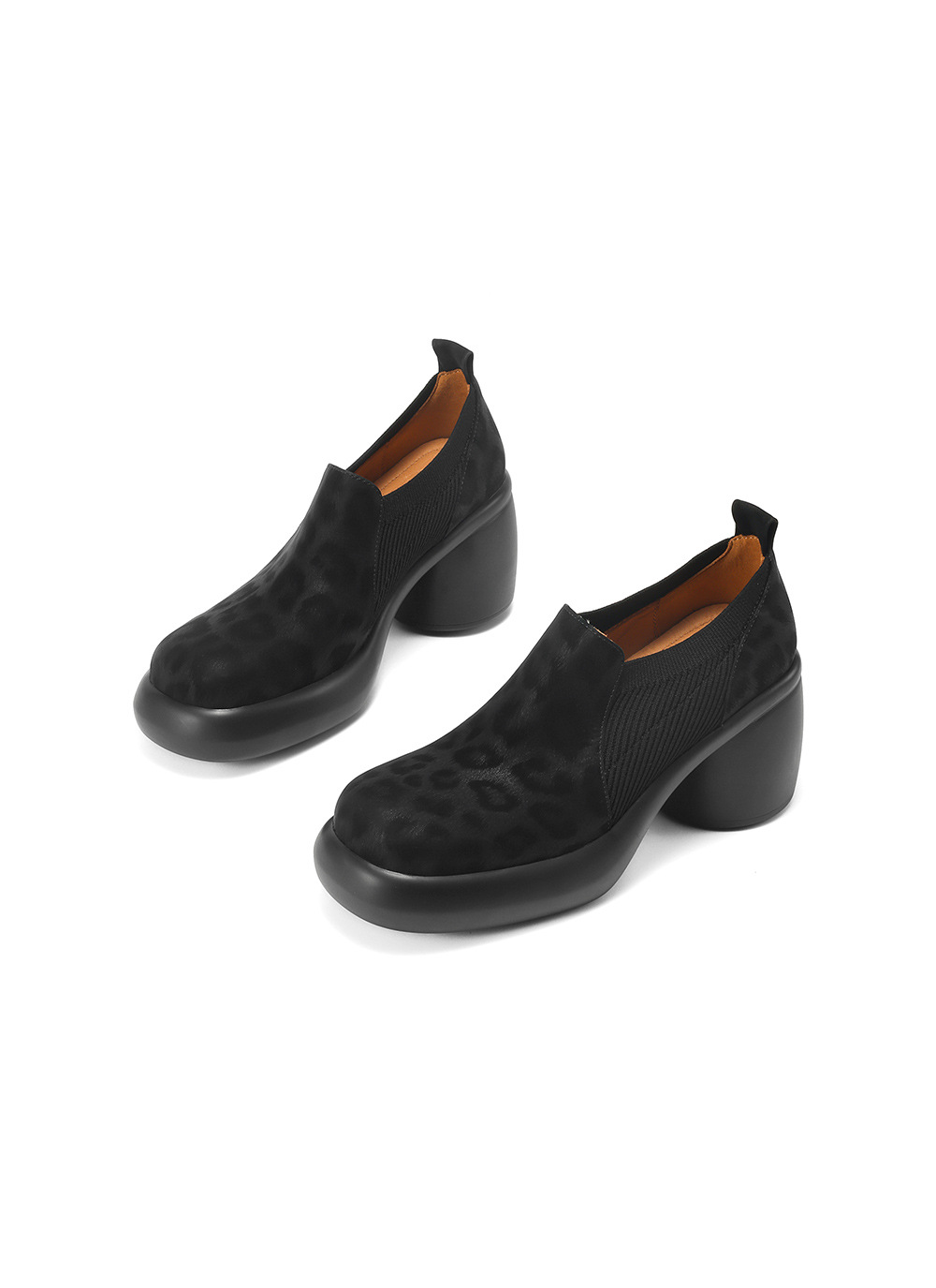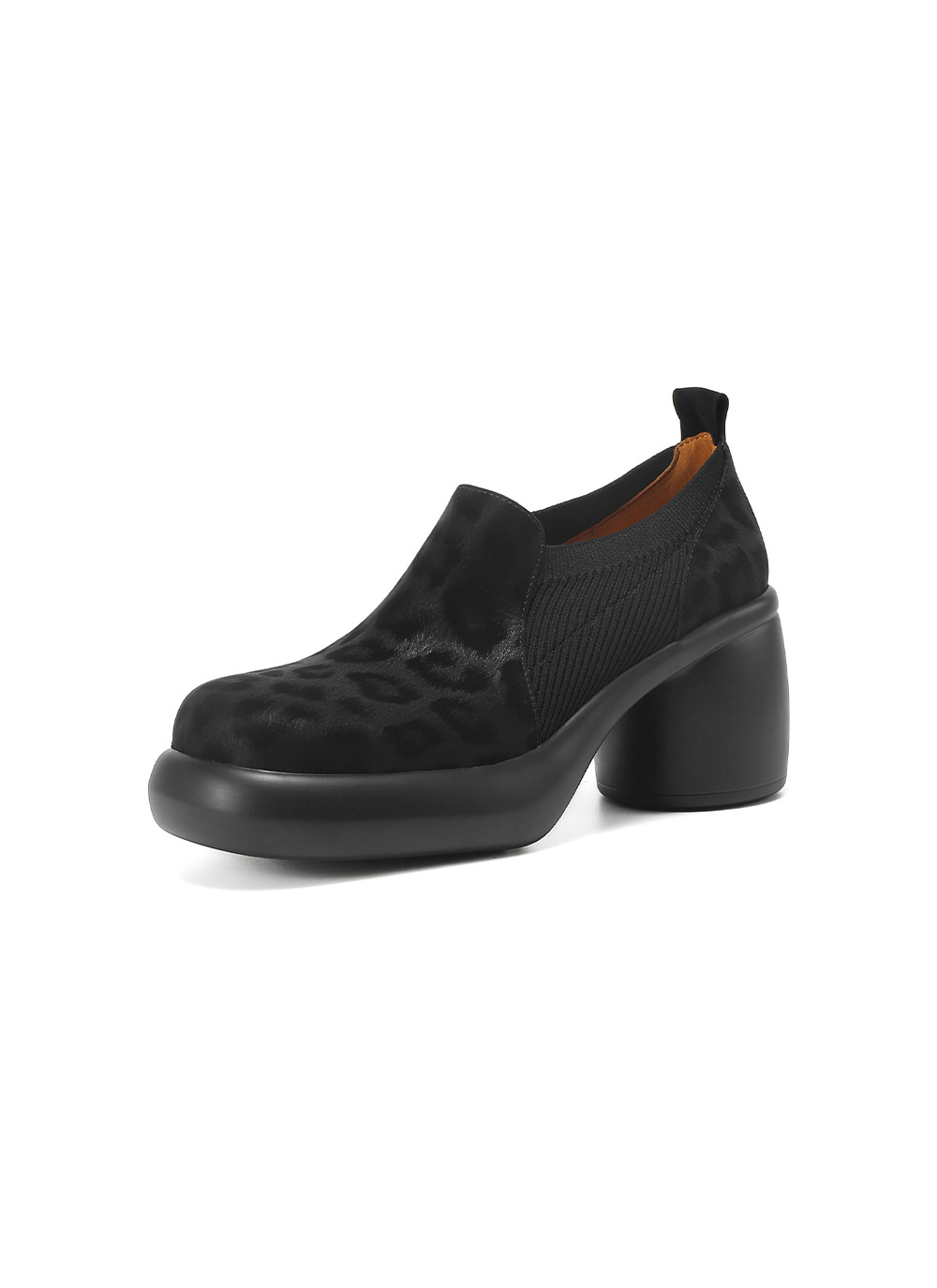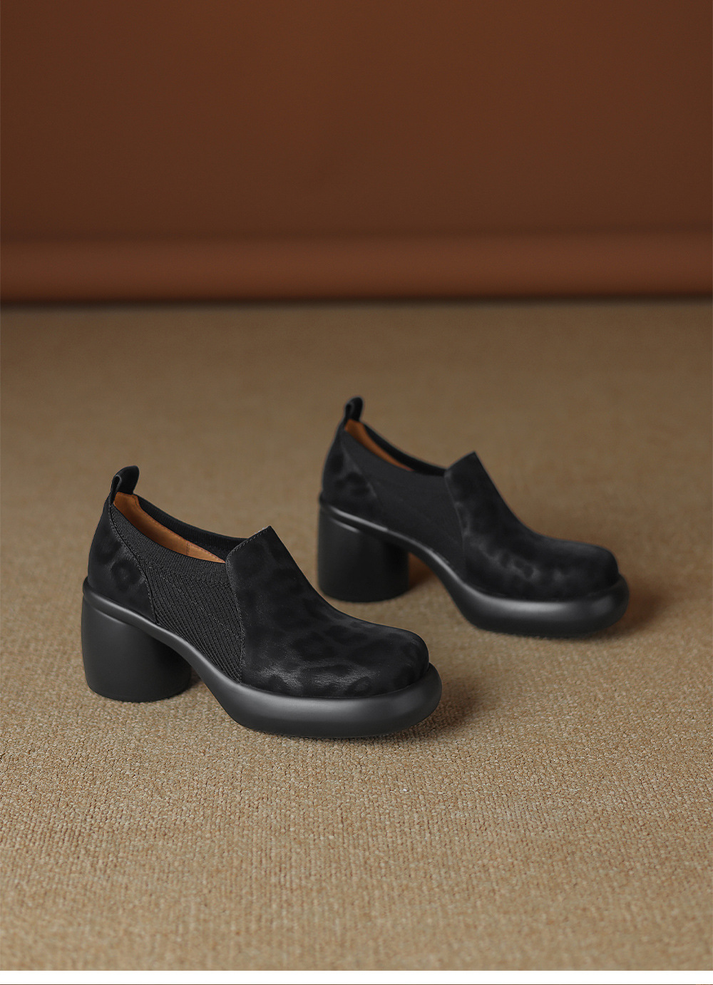 여성을위한 복고풍 스퀘어 토 레오파드 프린트 소가죽 두꺼운 굽 두꺼운 밑창 신발 2025 봄 새로운 딥 로퍼 슈즈는 매치하기 쉽습니다.