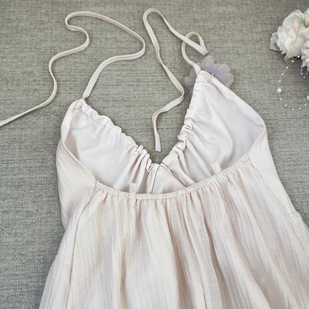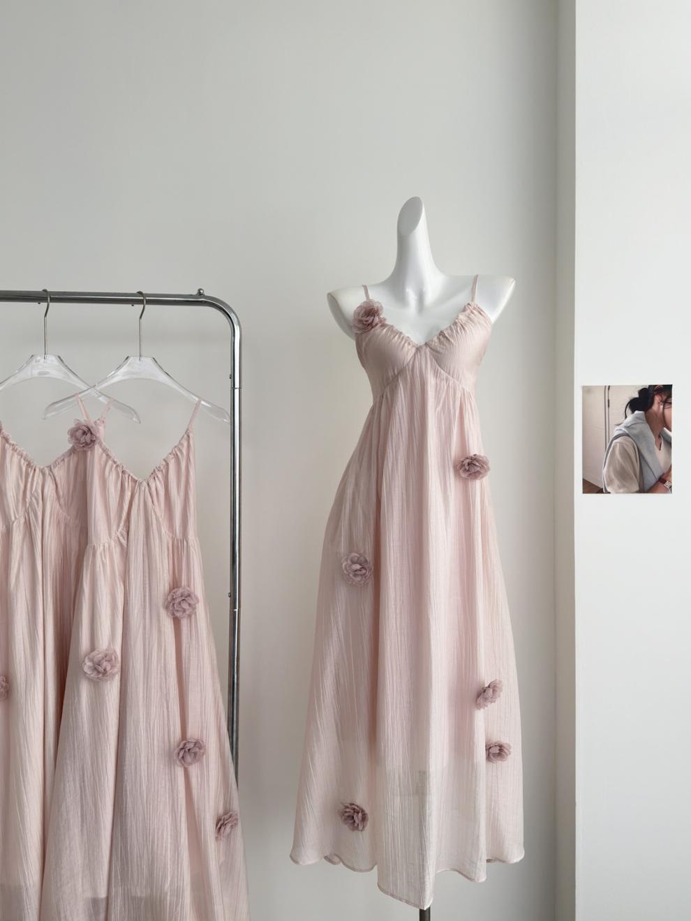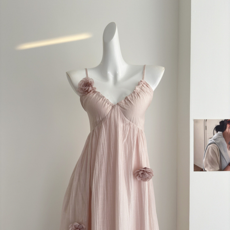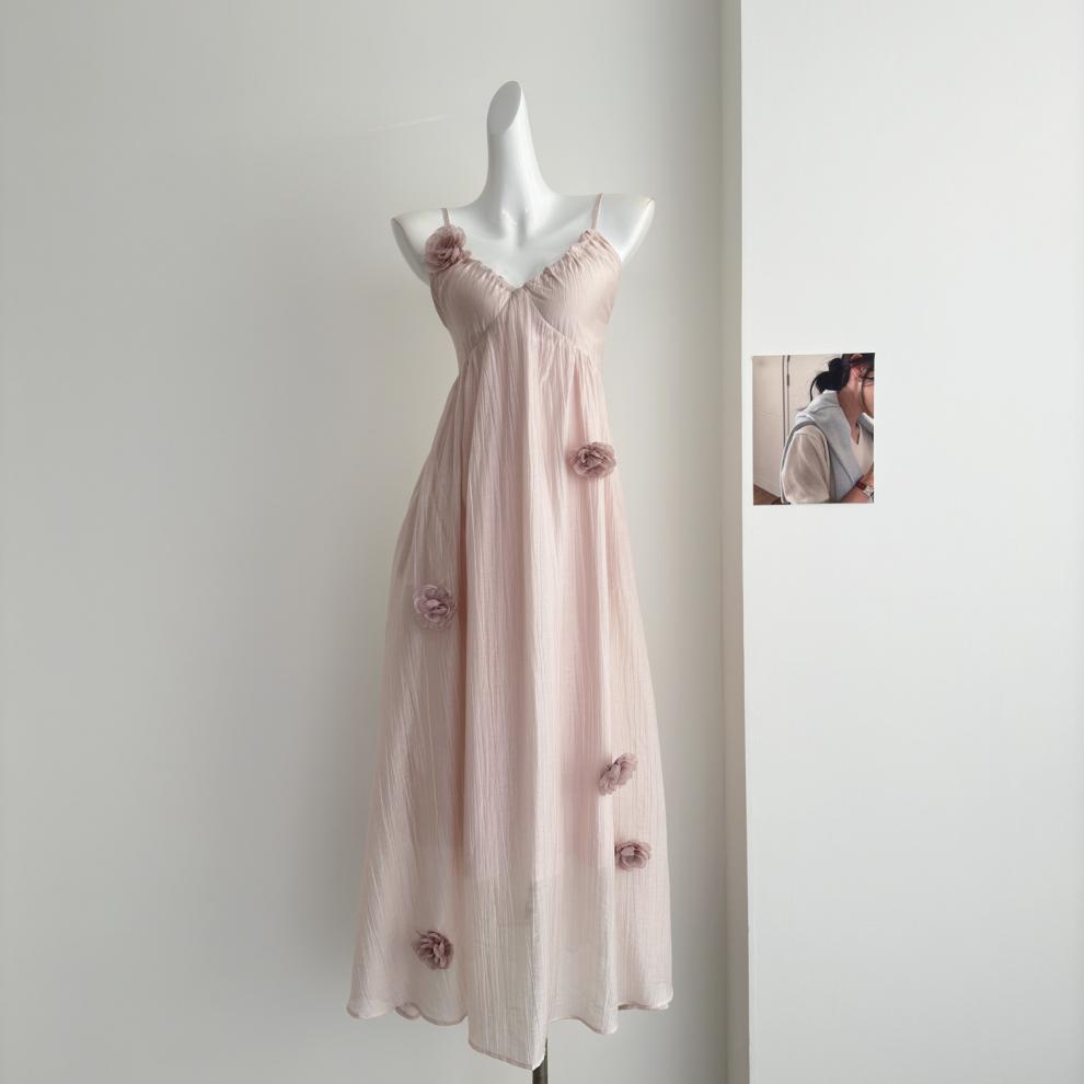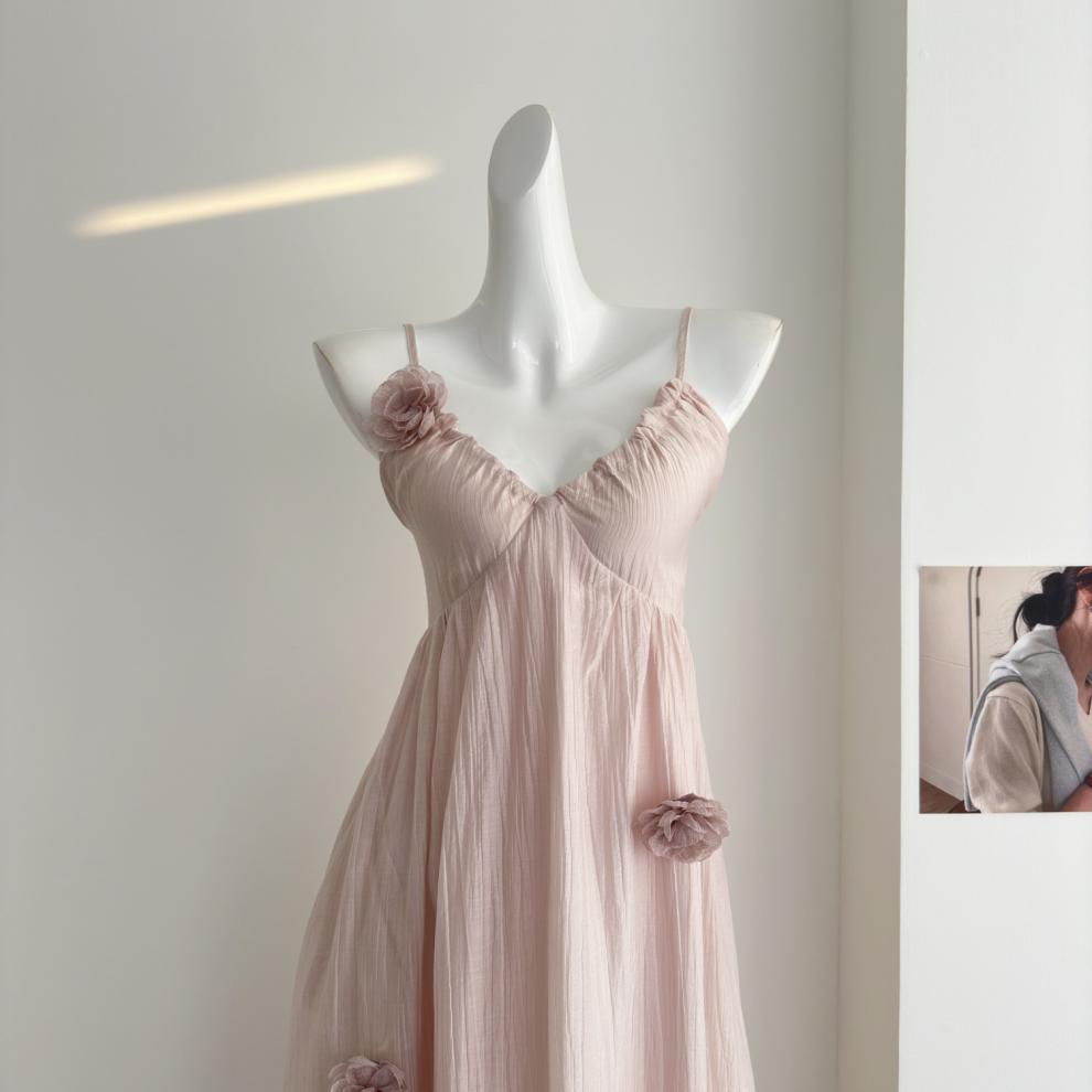 핑크 꽃 휴가 스타일 홀터넥 드레스 부드럽고 달콤한 요정 하이 엔드 비치 드레스