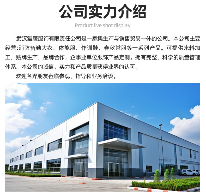 武汉猎鹰服饰有限责任公司是一家有着多年经验的贸易公司,其注册商标品牌际华三五三五,迷彩特工等公司专业经营火焰蓝系列备勤服,作训服,圆领衫,短袖体能服,长袖体能服,常服,大衣,冲锋衣,抢险救援服等服装类产品以及作训鞋,体能鞋,皮鞋,棉鞋,布鞋,抢险救援靴,作战靴等鞋类产品另有棉被棉褥等床上用品水杯脸盆腰带等日化用品类。