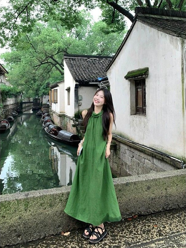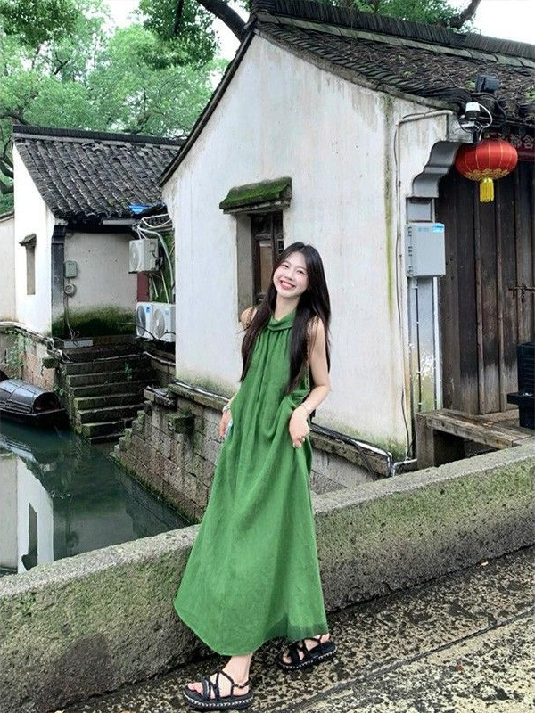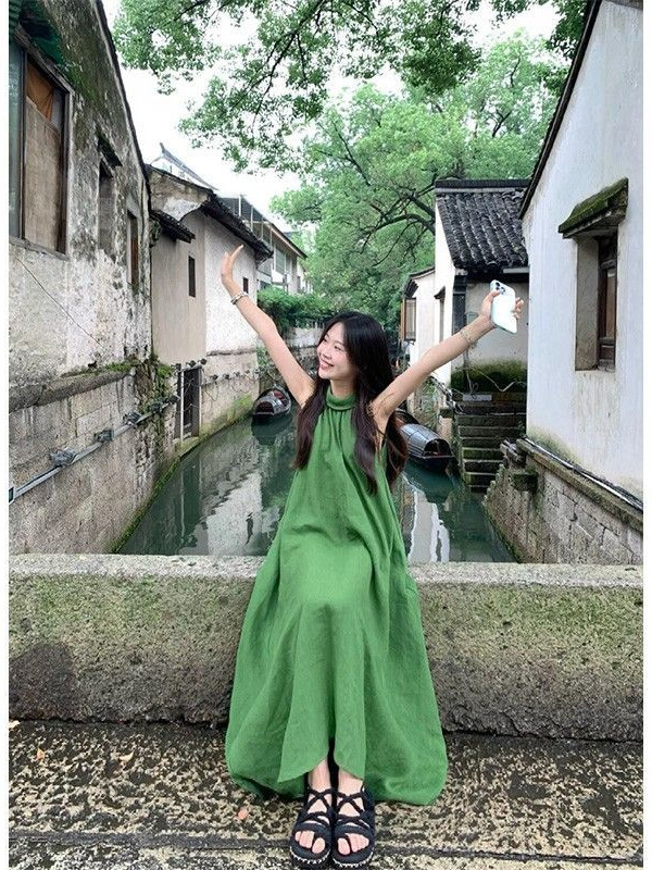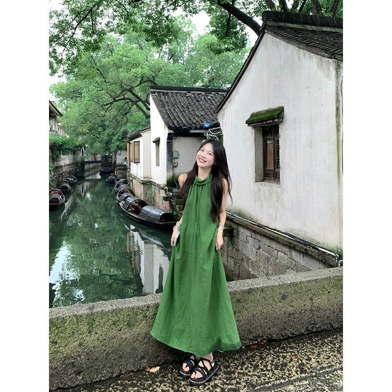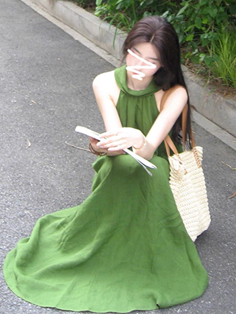프랑스 스타일 게으른 스타일 녹색 목 어깨 원피스 어린이 여름 2025 새로운 하이 엔드 홀리데이 비치 롱 원피스