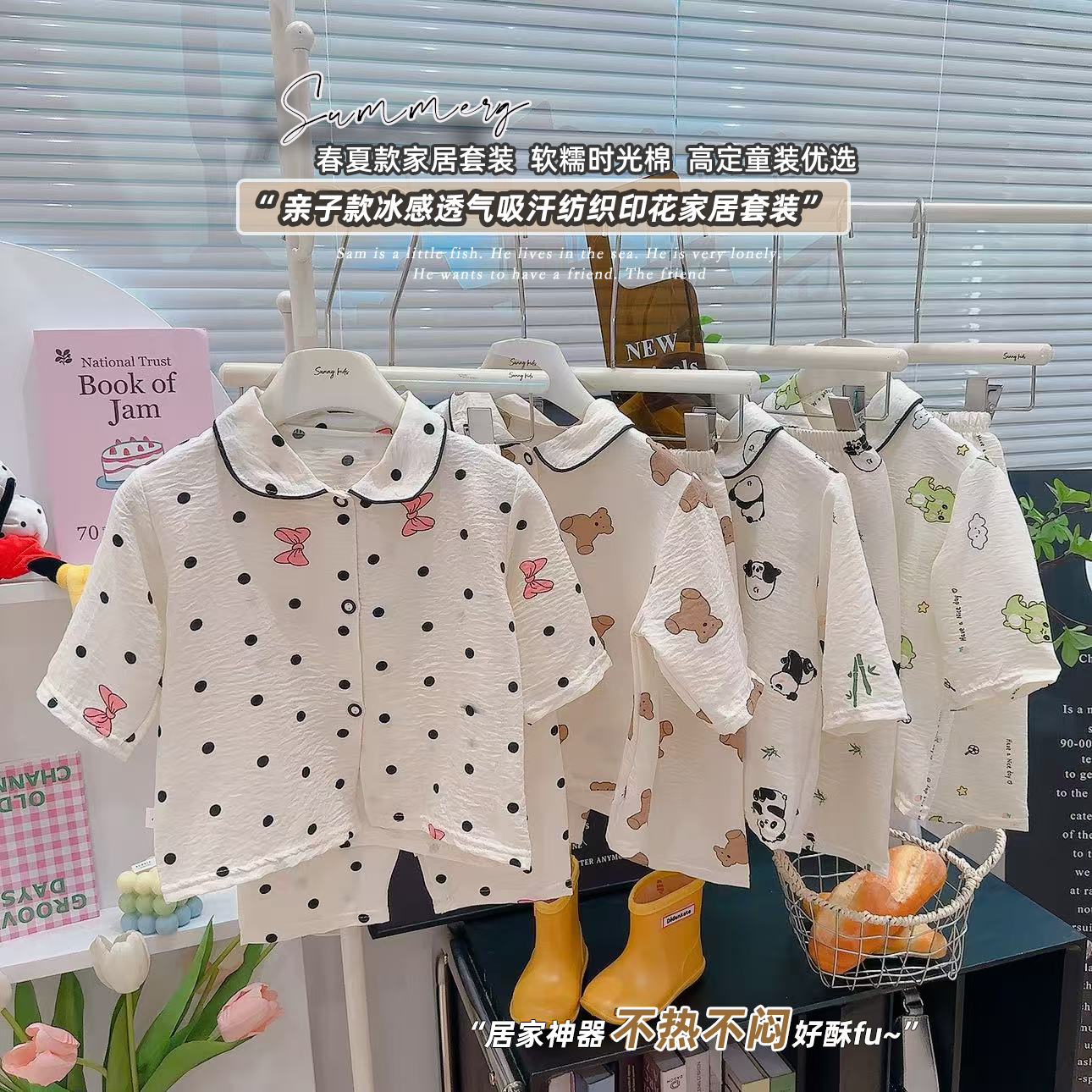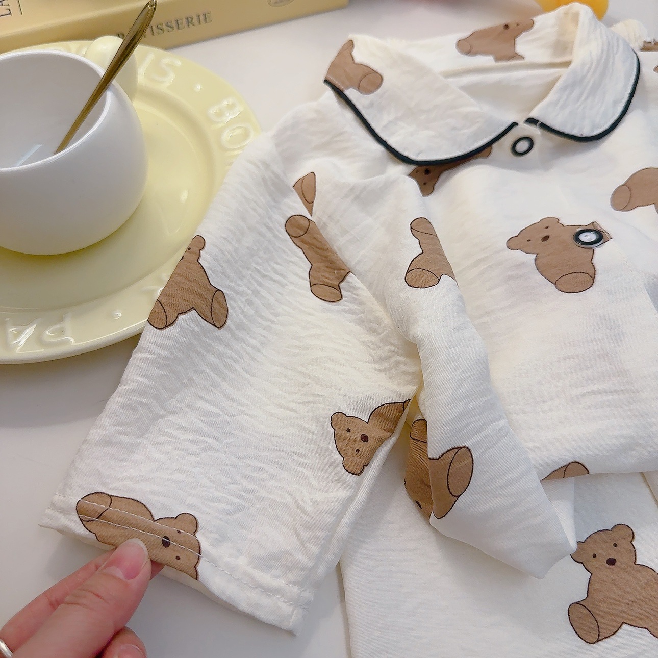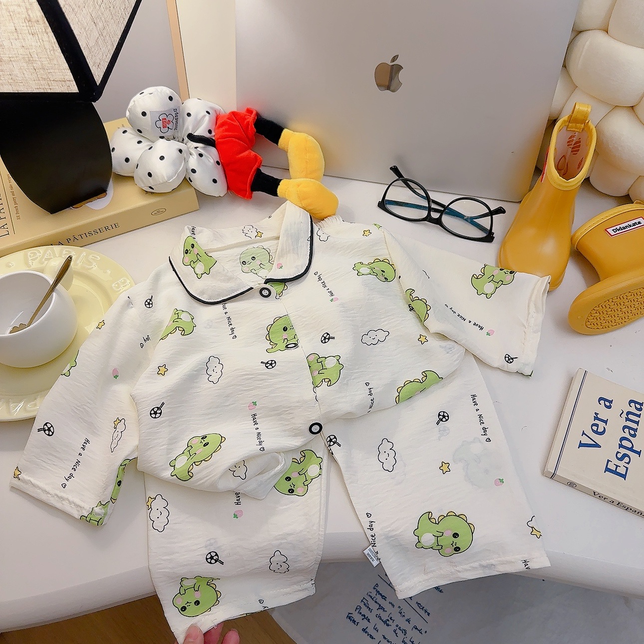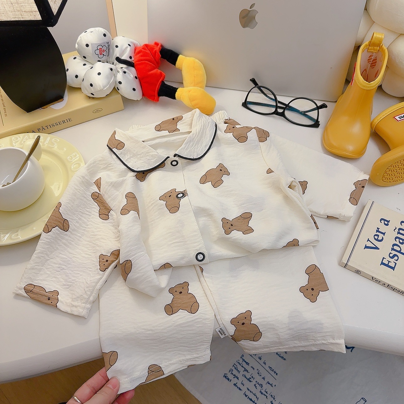 소년과 소녀를위한 여름 어린이 잠옷 2025 새로운 만화 옷깃 가정 의류 세트 얇은 구름 면화 가정 의류