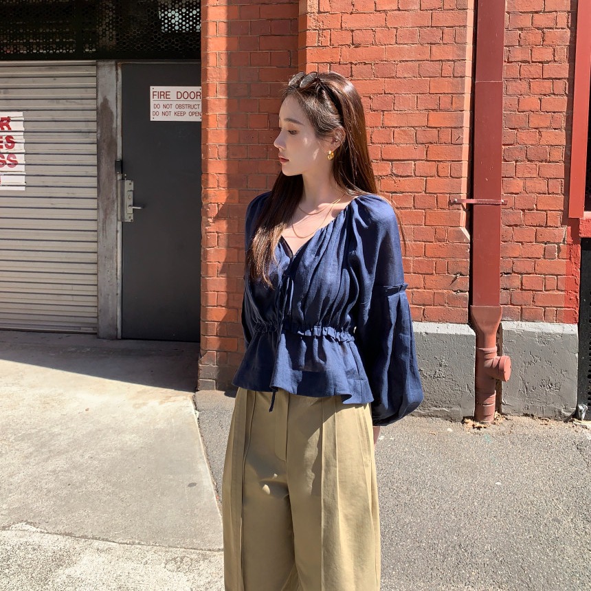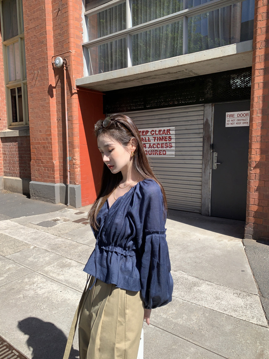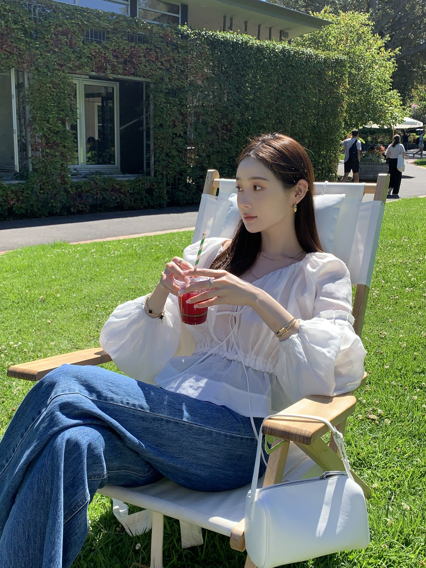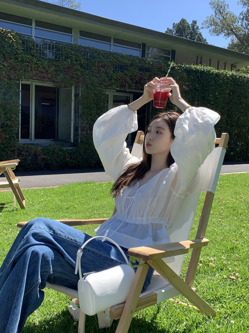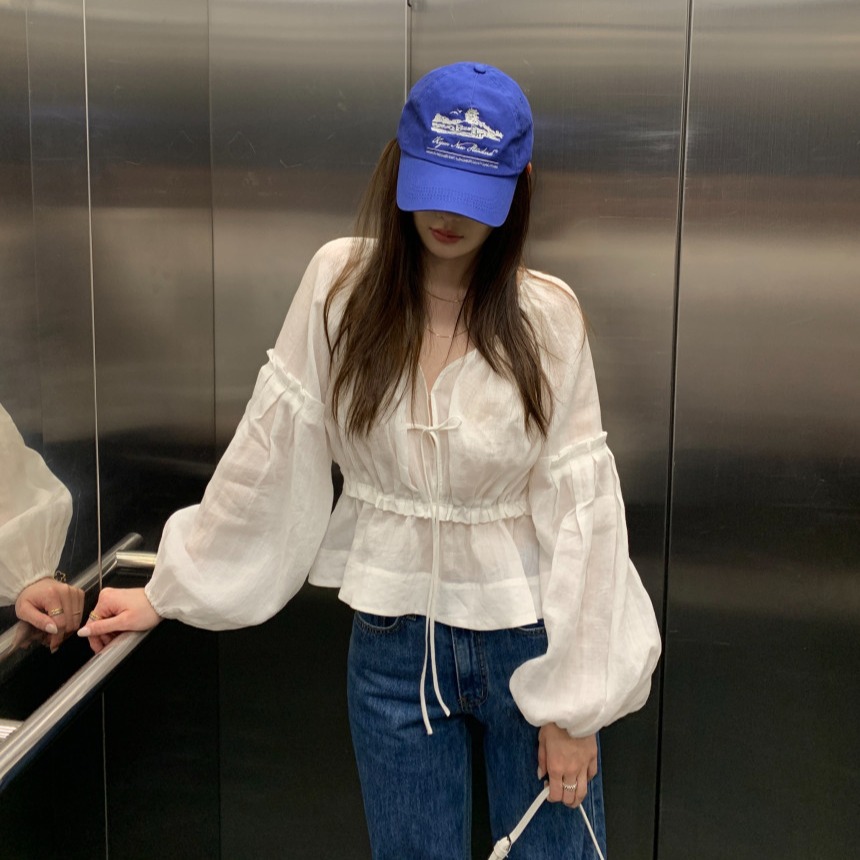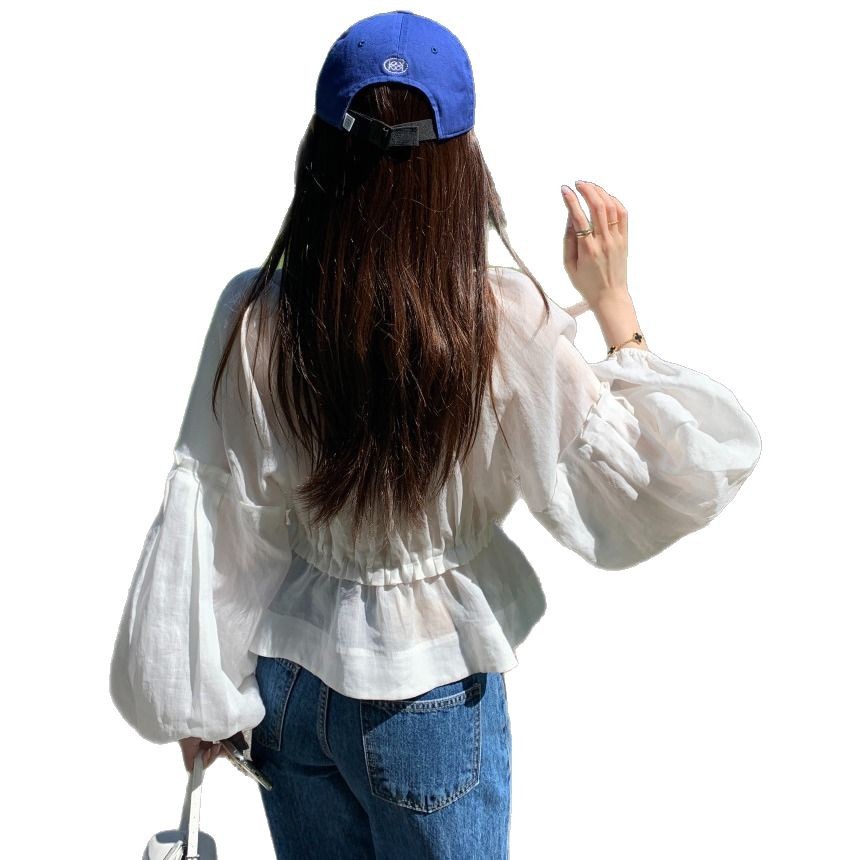 한국 인 프랑스 스타일 V 넥 드로스트링 타이트 허리 버블 슬리브 쉬폰 셔츠 여성의 봄과 여름 새로운 우아한 화이트 셔츠 탑