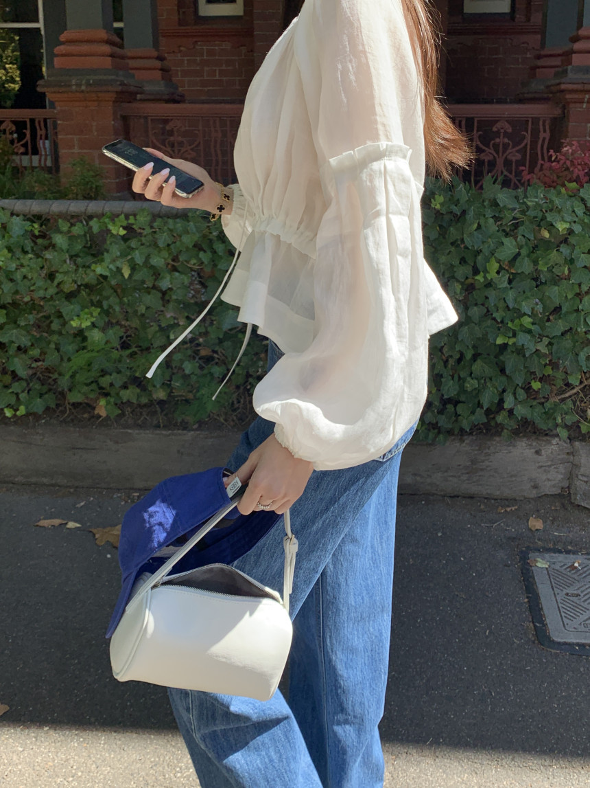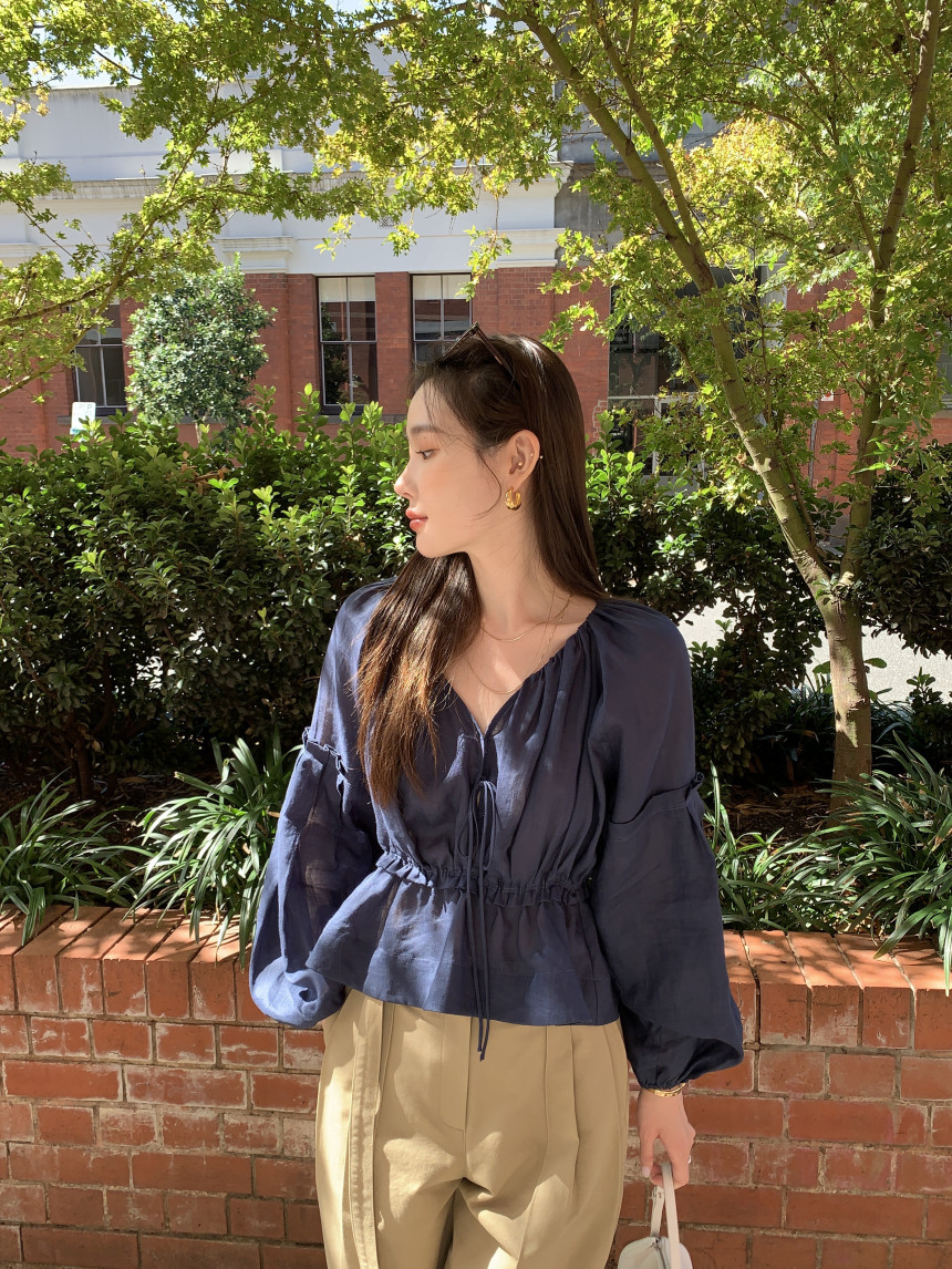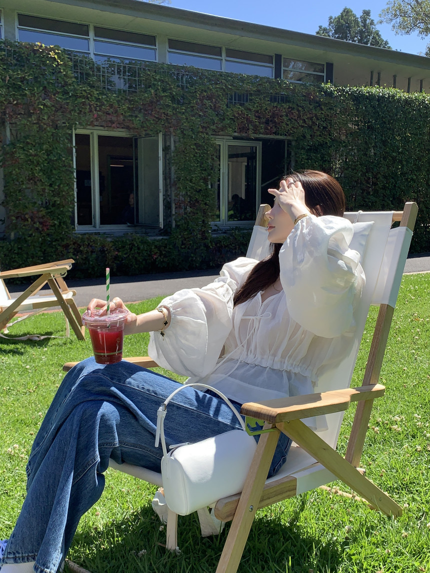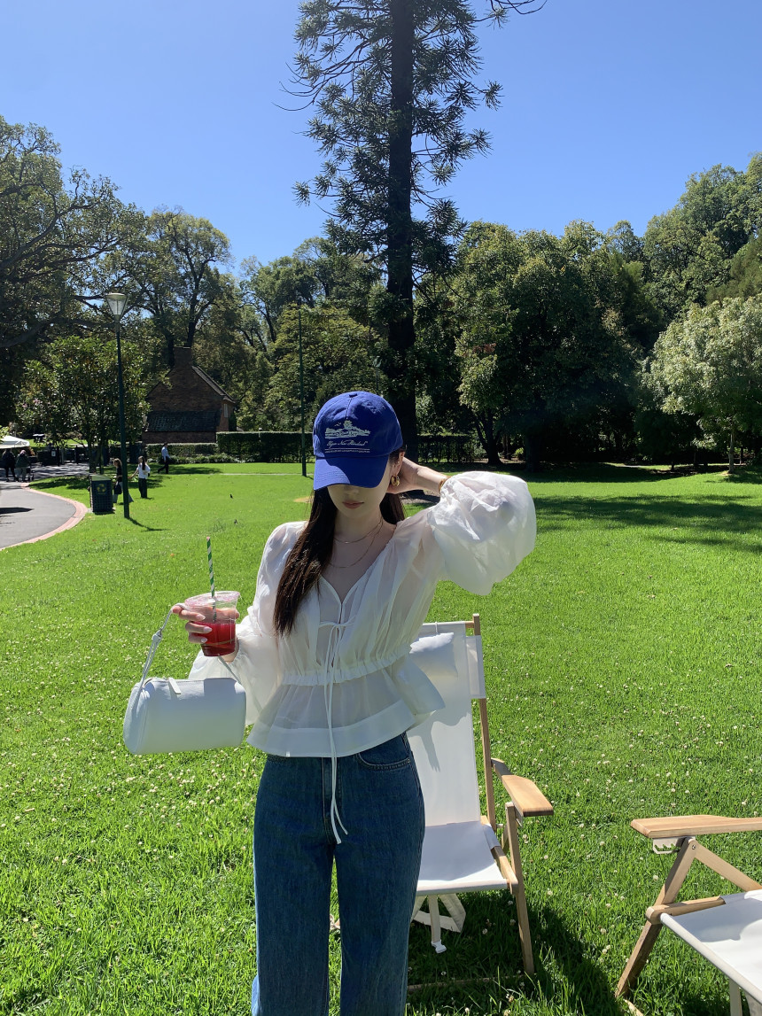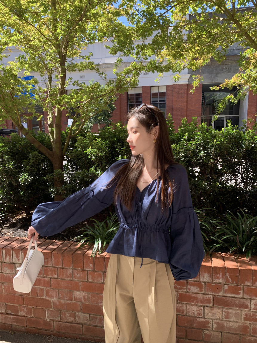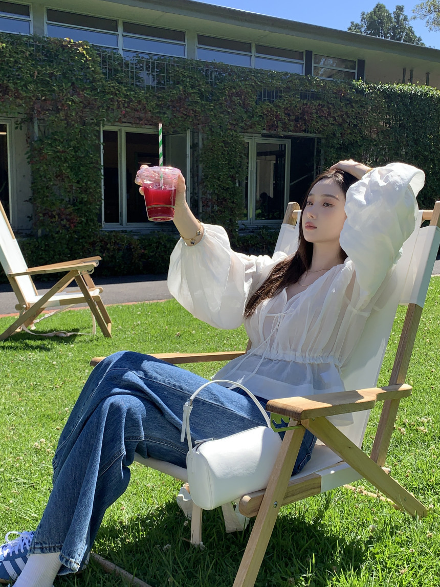 한국 인 프랑스 스타일 V 넥 드로스트링 타이트 허리 버블 슬리브 쉬폰 셔츠 여성의 봄과 여름 새로운 우아한 화이트 셔츠 탑