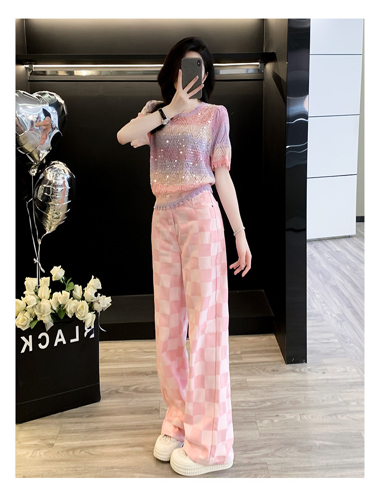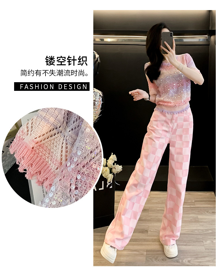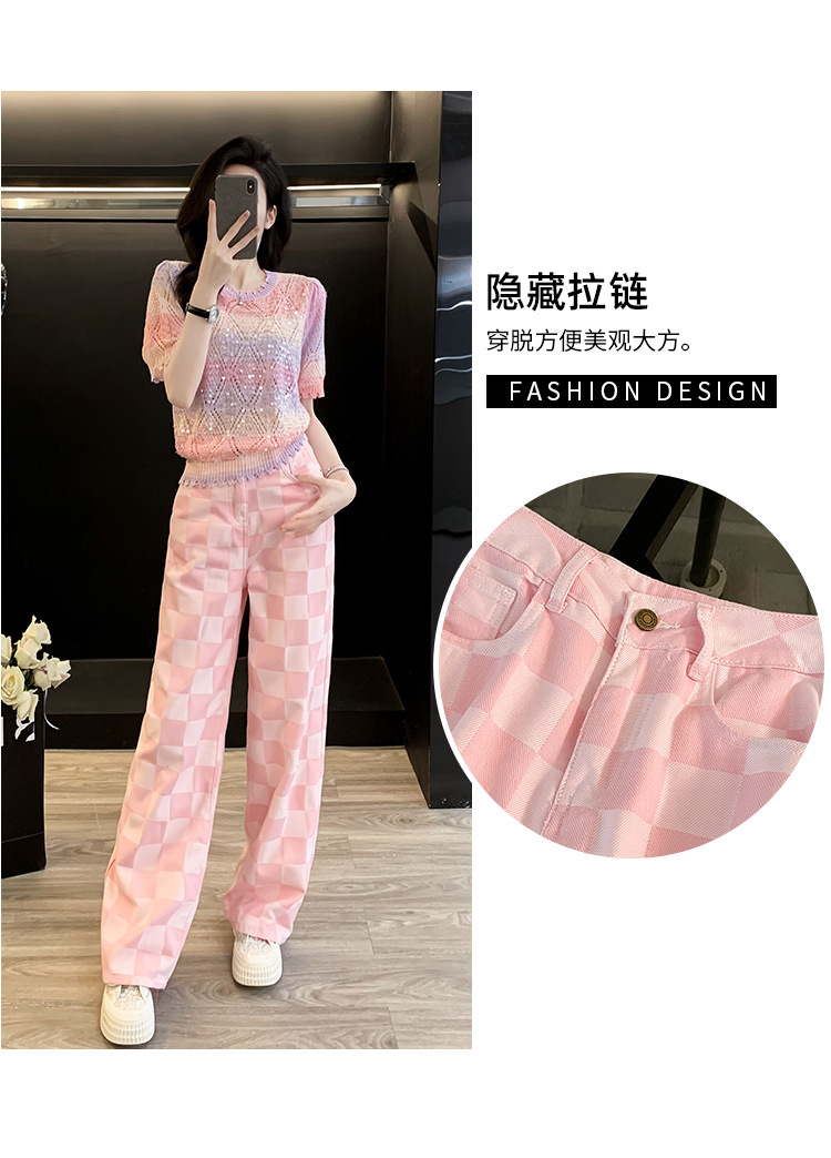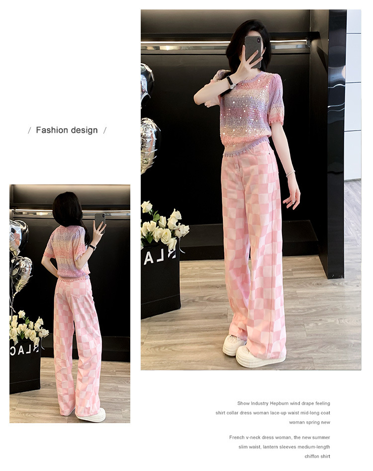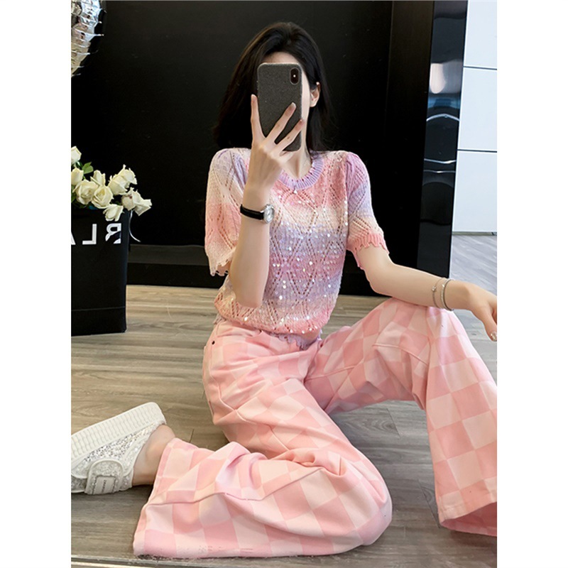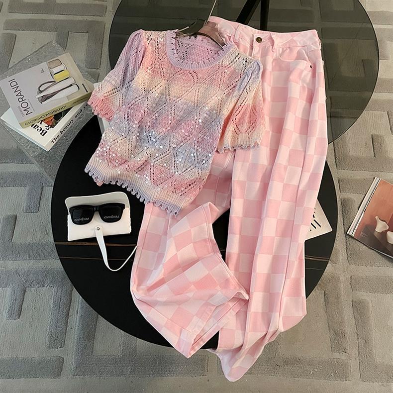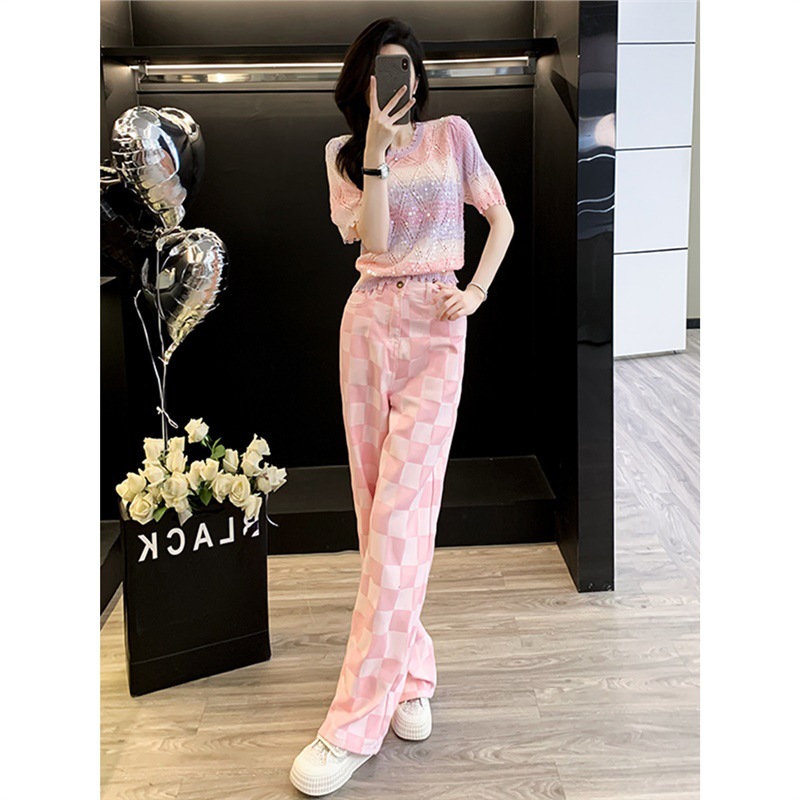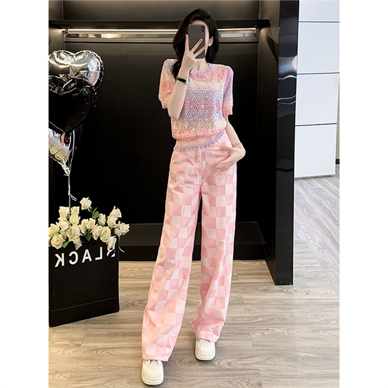 핑크 캐주얼 스포츠 세트 여자 여름 2025 뉴 에이지 감소 반팔 체크 데님 와이드 레그 바지 투피스 세트