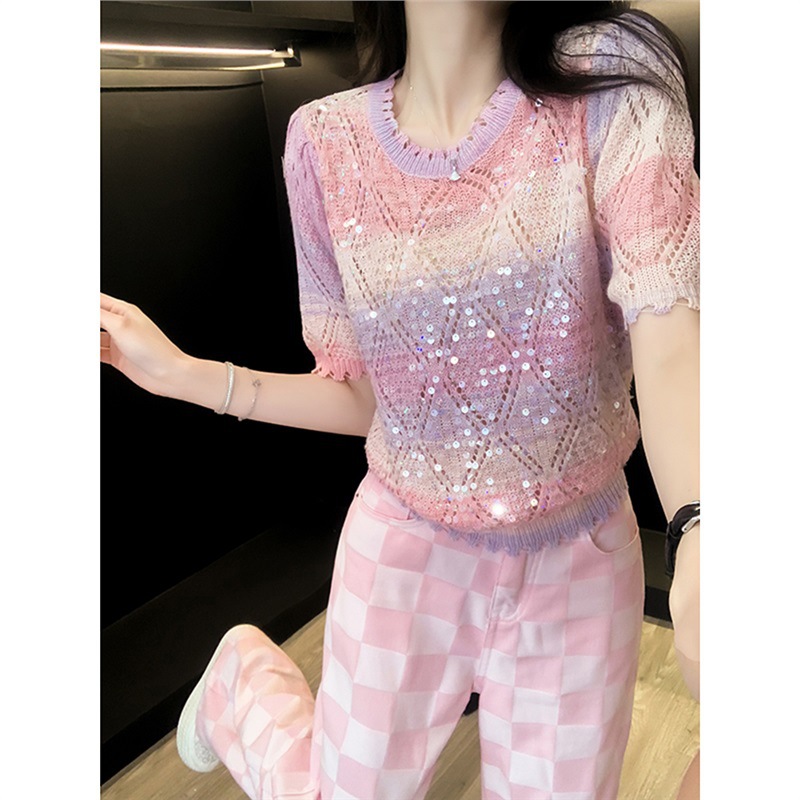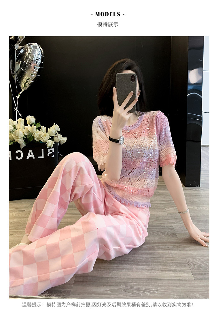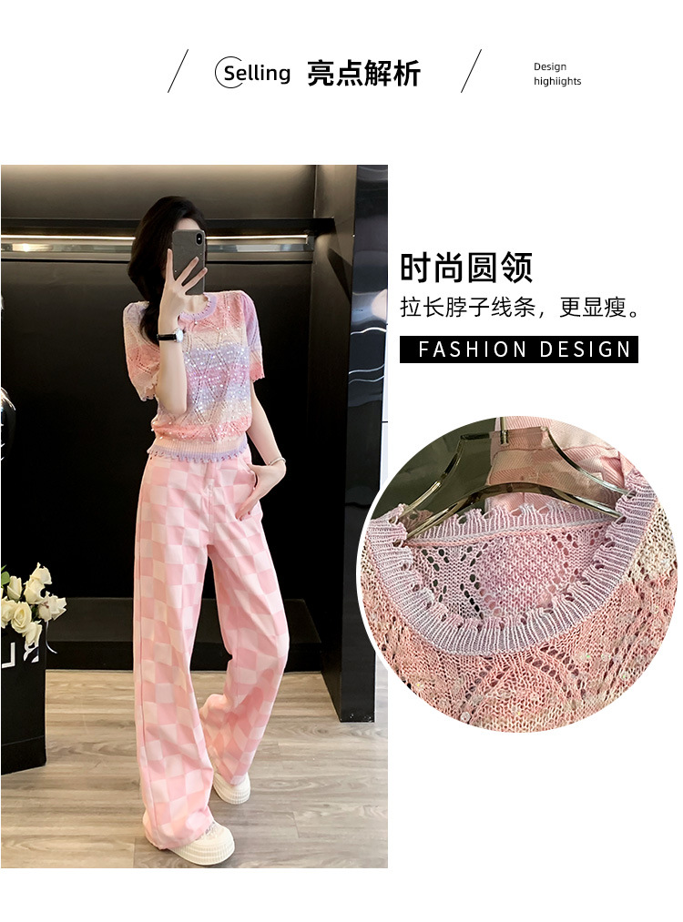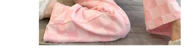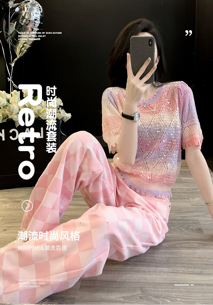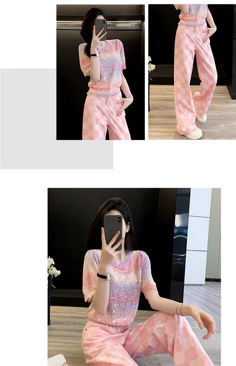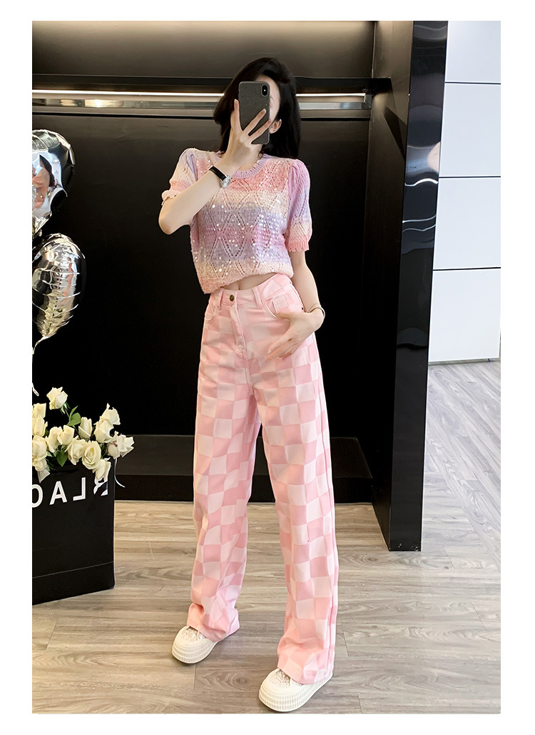 핑크 캐주얼 스포츠 세트 여자 여름 2025 뉴 에이지 감소 반팔 체크 데님 와이드 레그 바지 투피스 세트