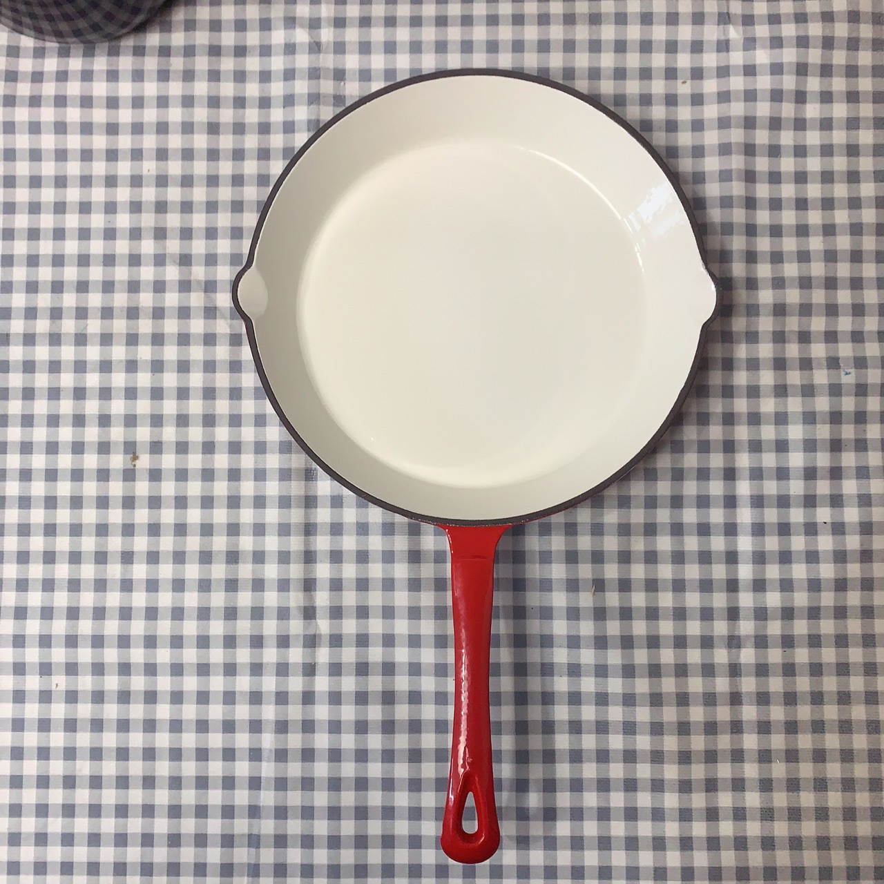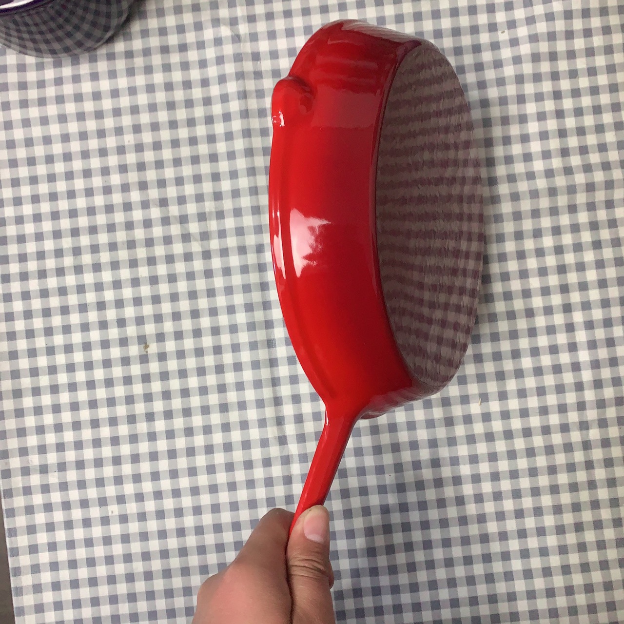 외부는 빨간색, 내부는 흰색, 긴 손잡이