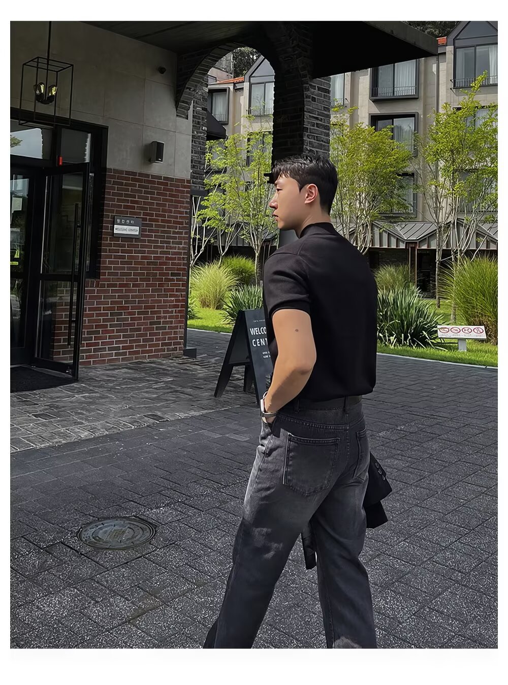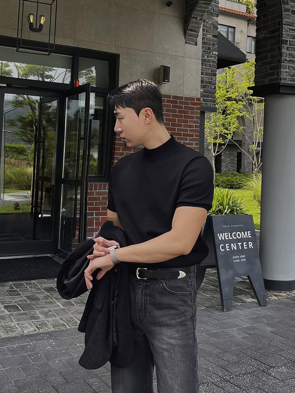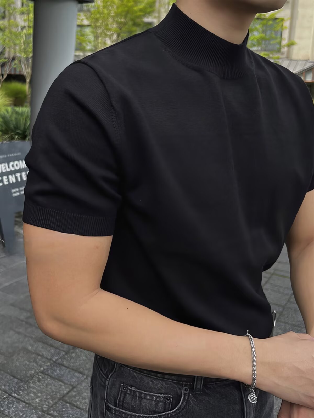 블랙 하프 터틀넥 풀오버 니트 티셔츠 남성용 아메리칸 스타일 남성용 반팔 트렌디 슬림핏 하프 슬리브 셔츠