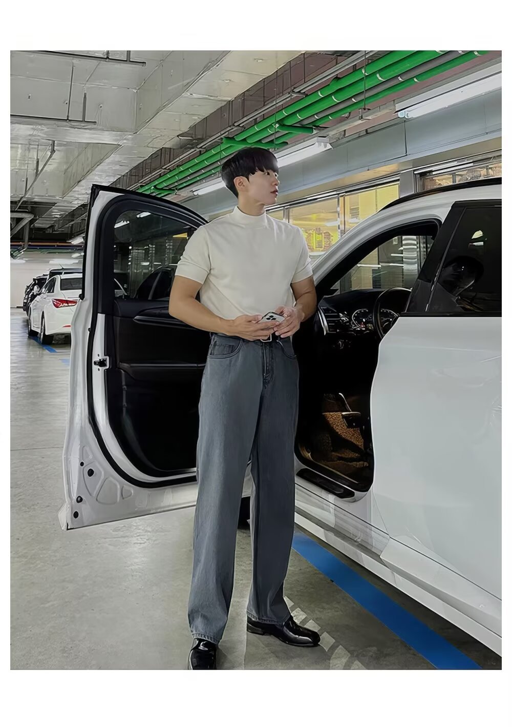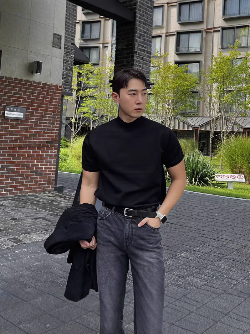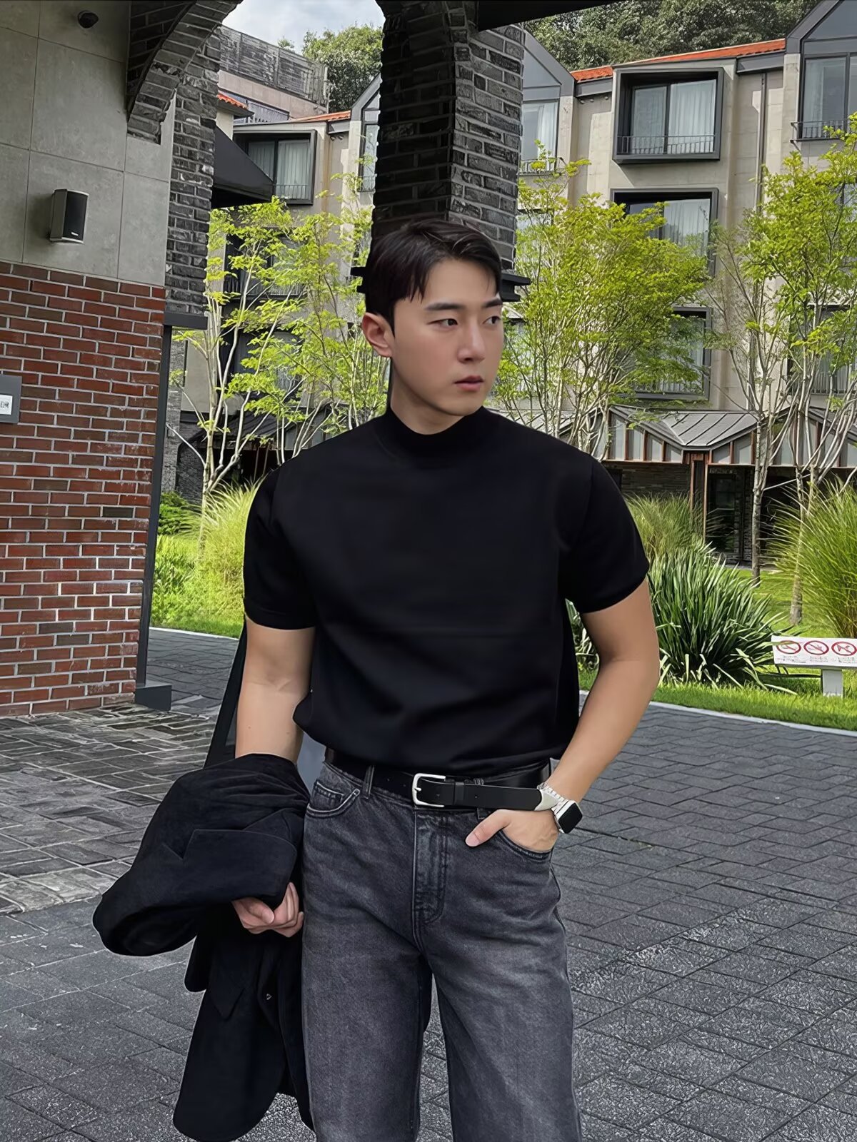 블랙 하프 터틀넥 풀오버 니트 티셔츠 남성용 아메리칸 스타일 남성용 반팔 트렌디 슬림핏 하프 슬리브 셔츠