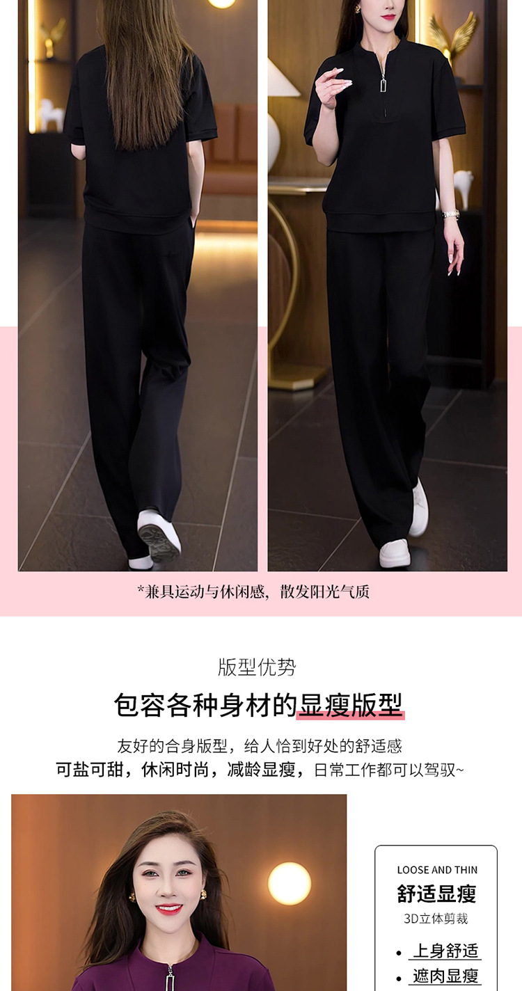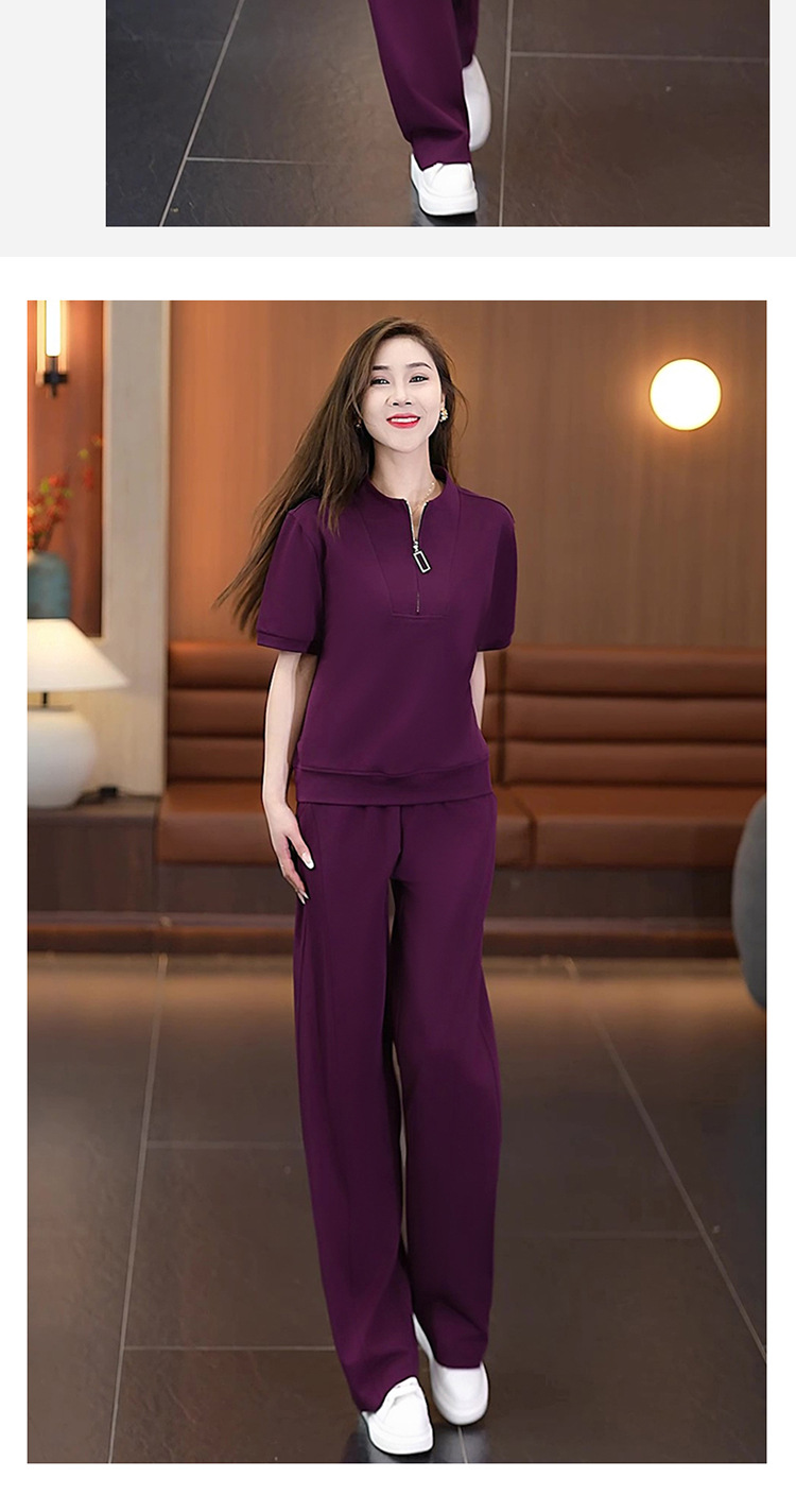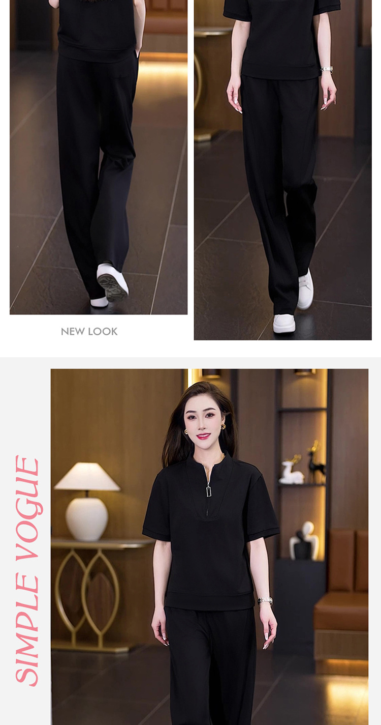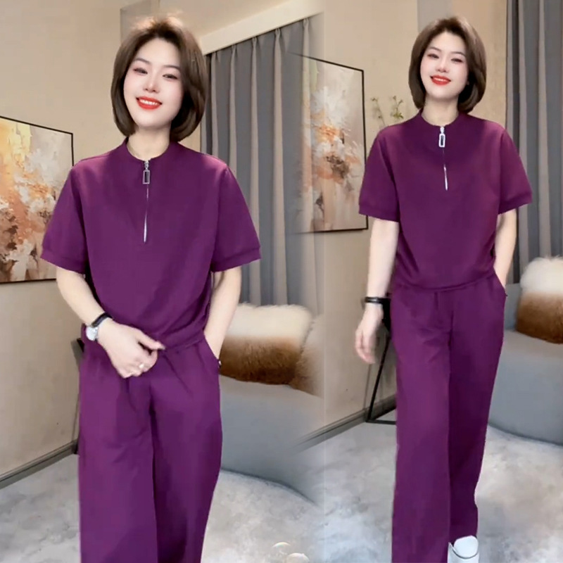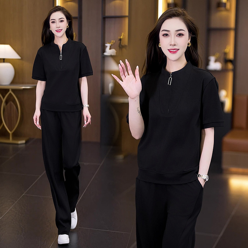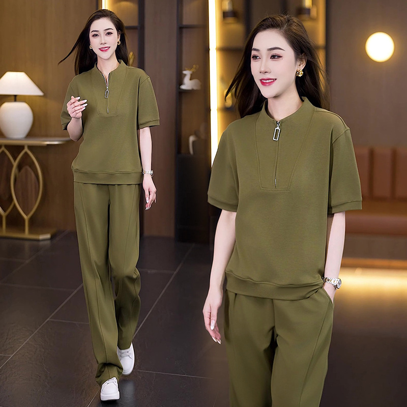아이스 실크 캐주얼 스포츠웨어 세트 여성 2025 년 여름 새로운 서양식 슬리밍 반팔 탑 와이드 레그 바지 투피스 세트