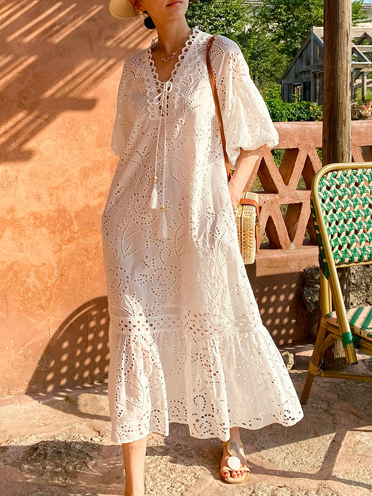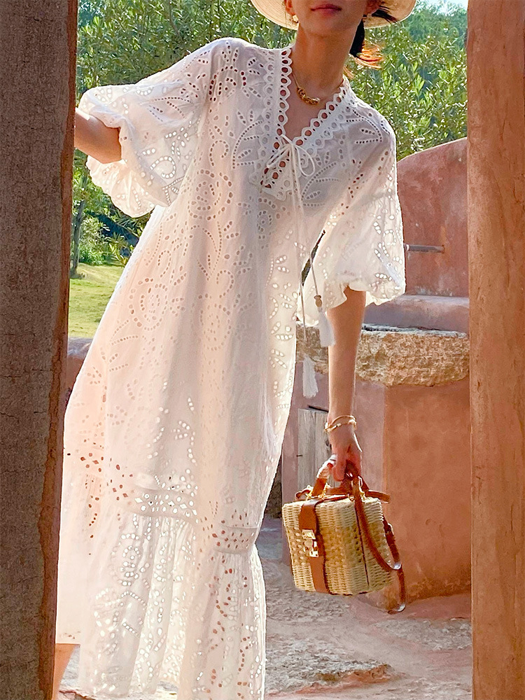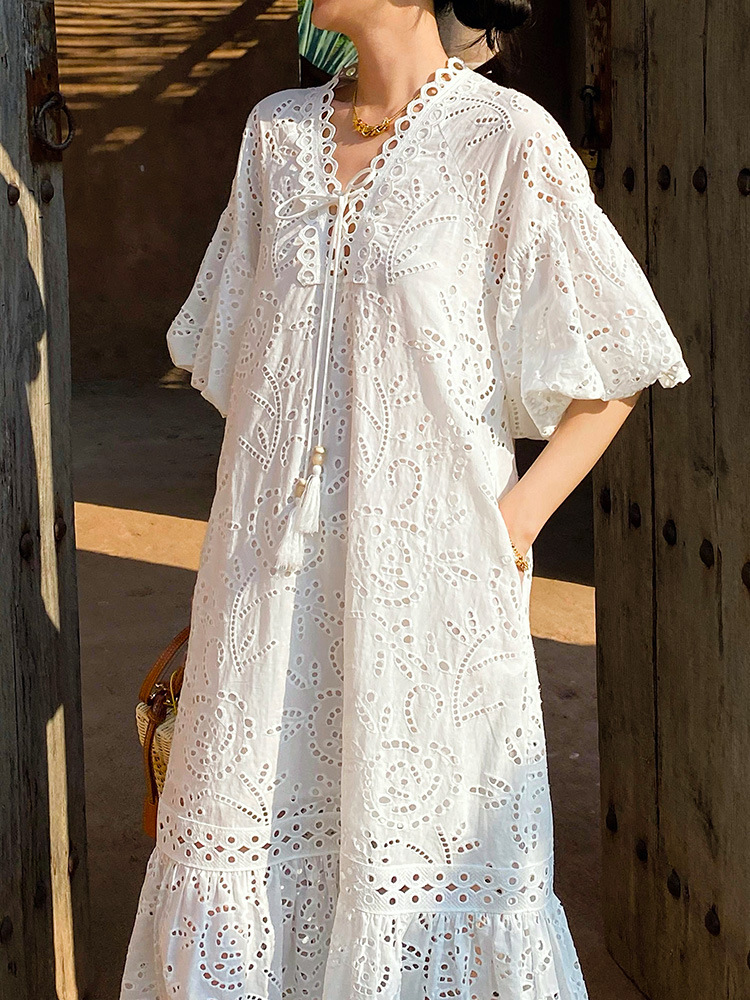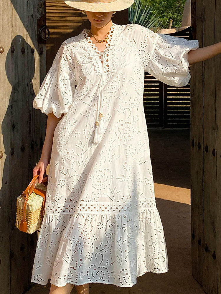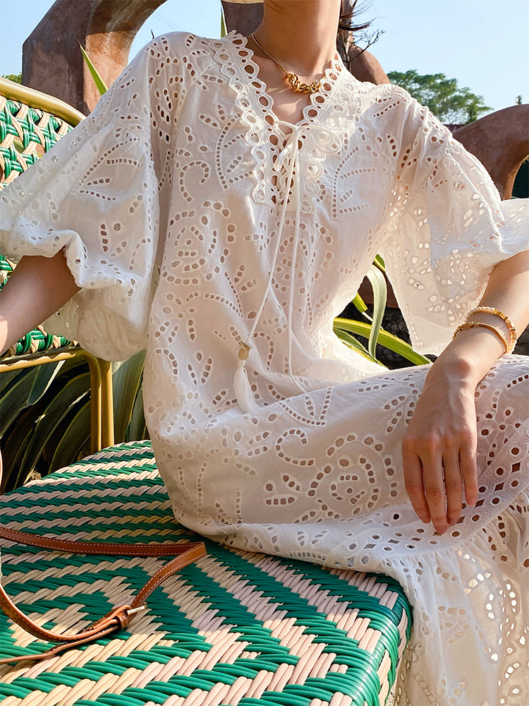 봄과 여름 여성의 새로운 프랑스 자수 휴일 원피스 여성 퍼프 슬리브 화이트 미디 원피스 유럽과 미국의 국경 여성 의류