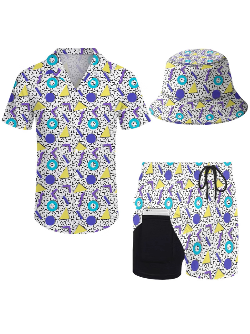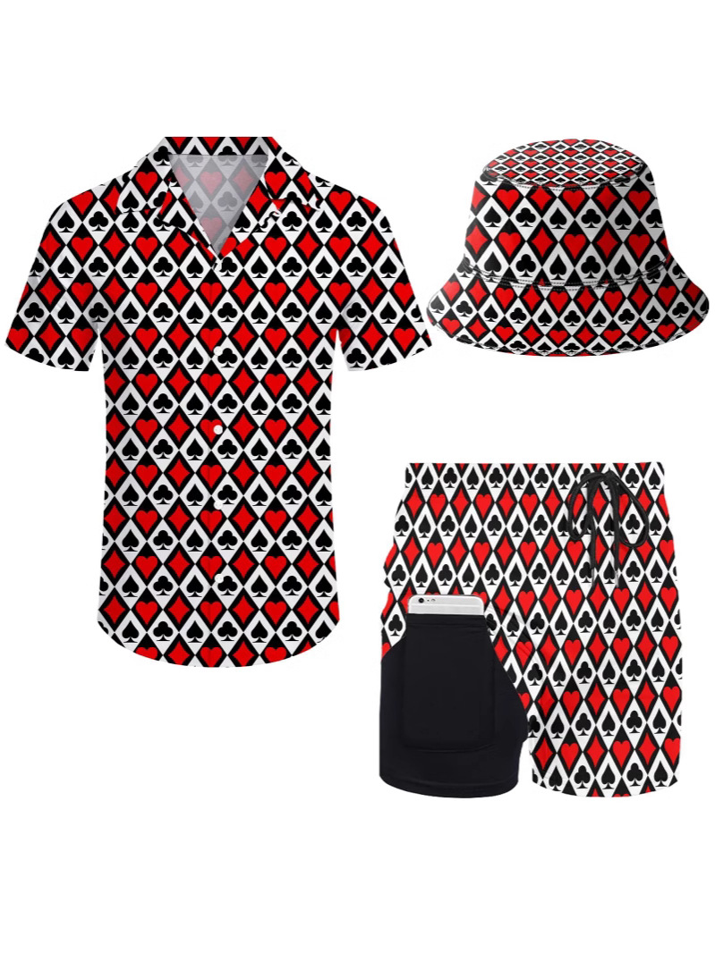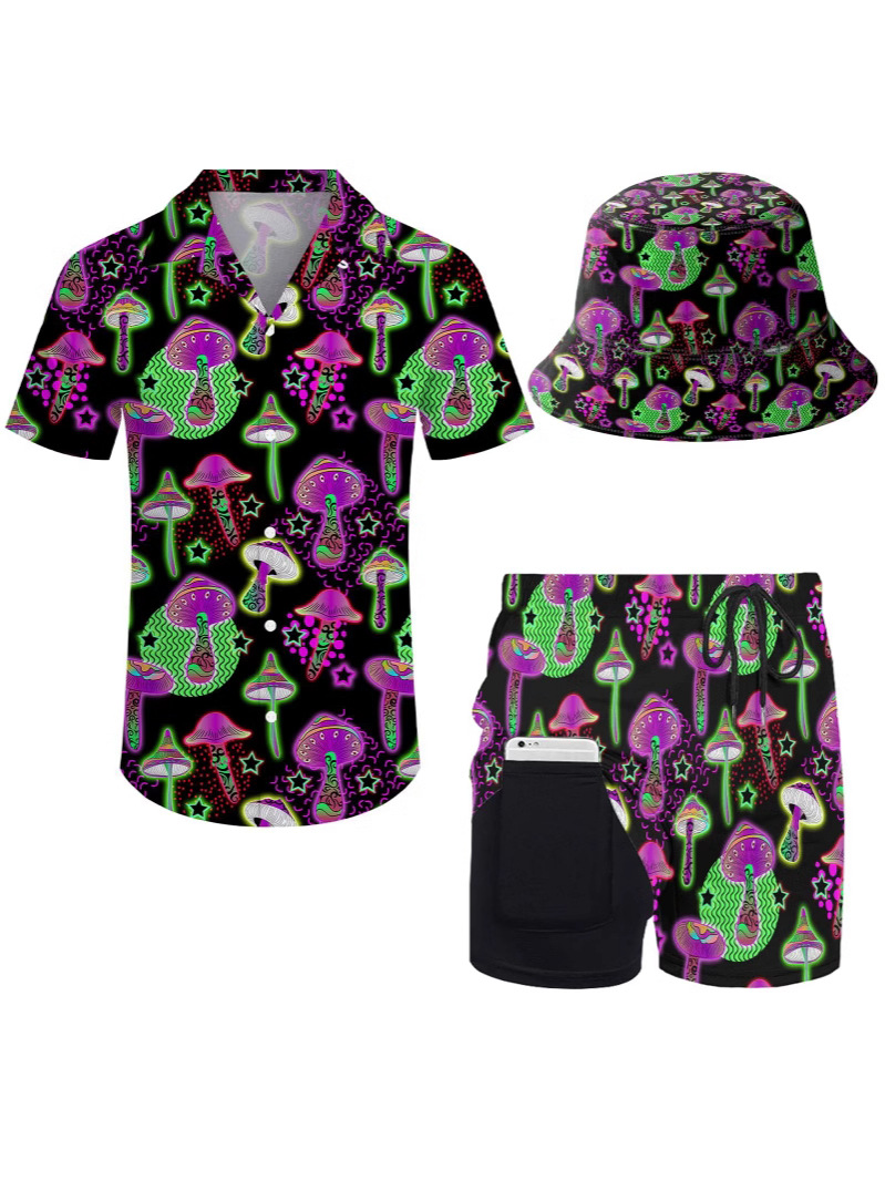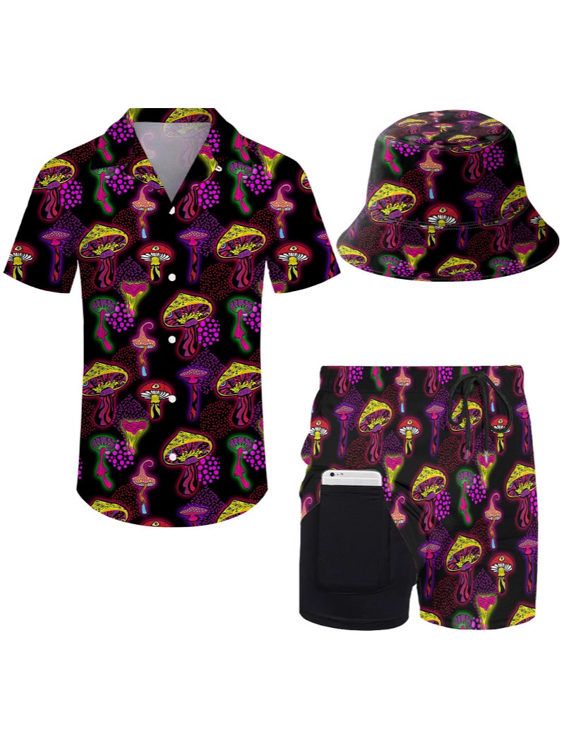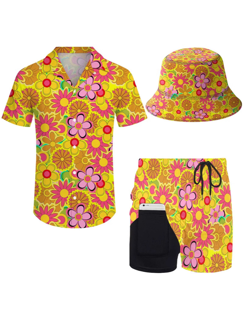 맞춤형 유럽과 미국 하와이 3피스 3D 프린트 패션 남성 라펠 반팔 셔츠 비치 바지 모자 세트