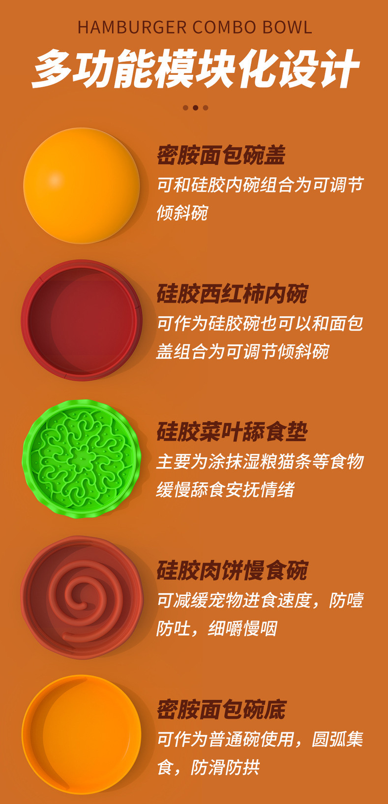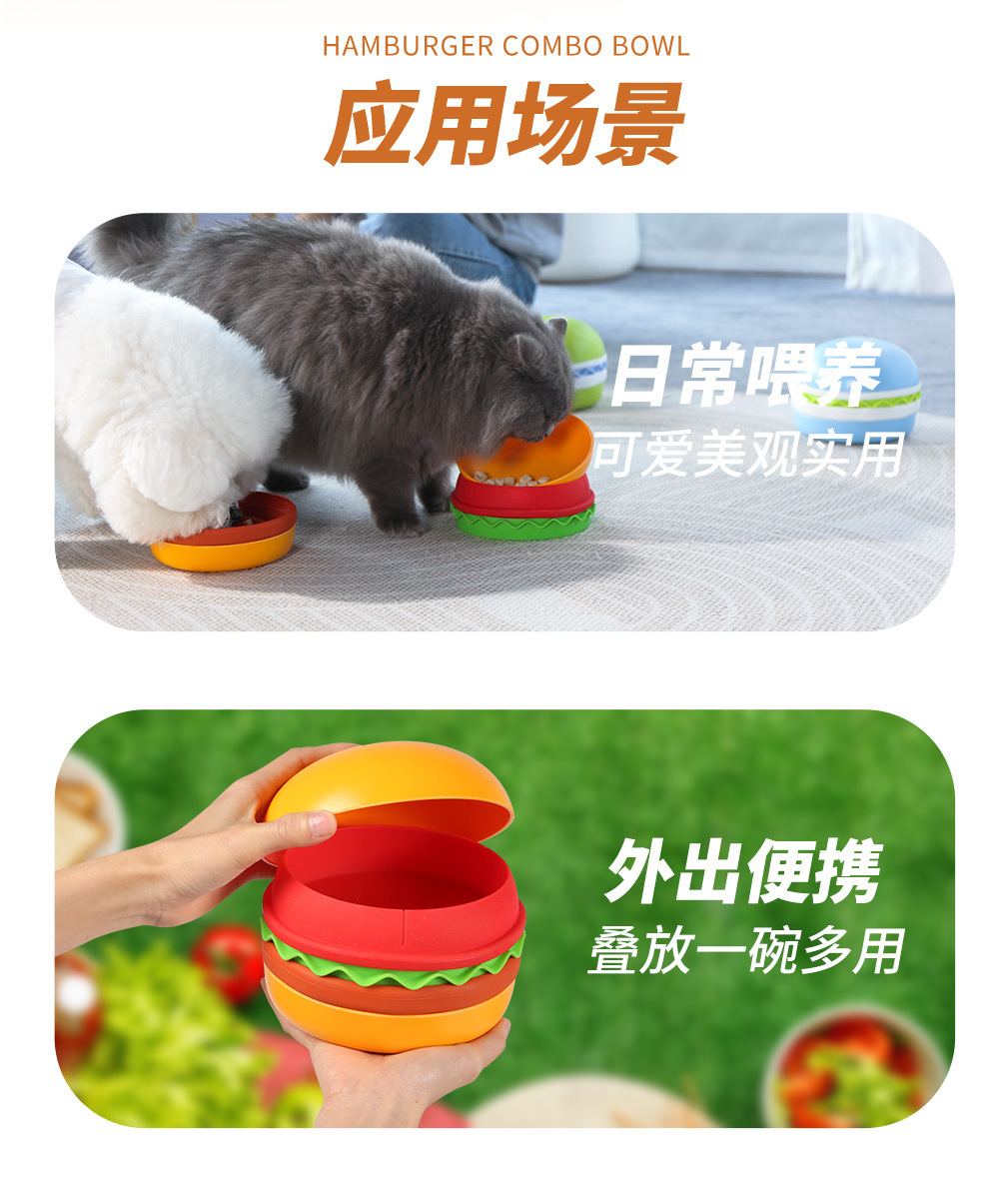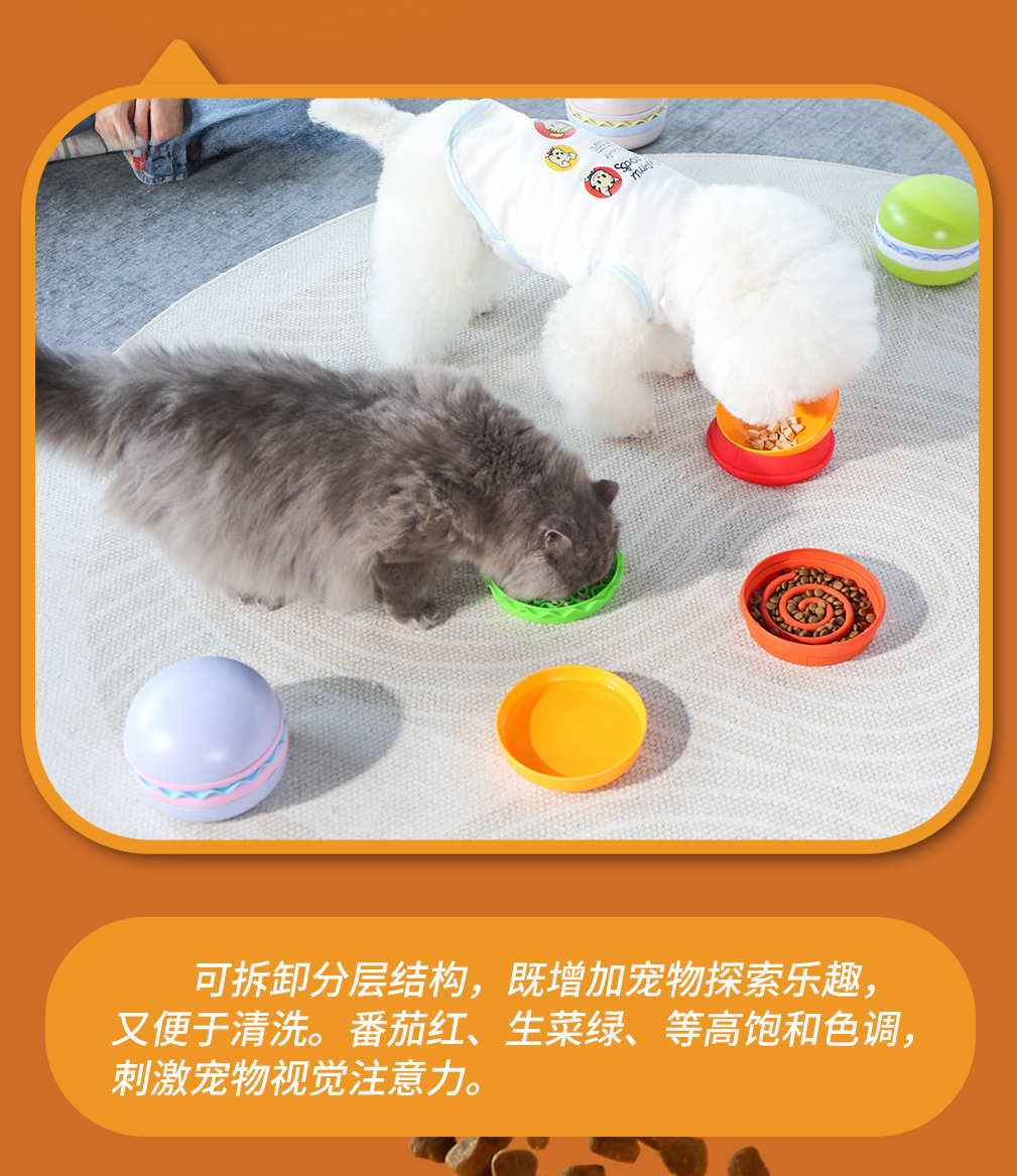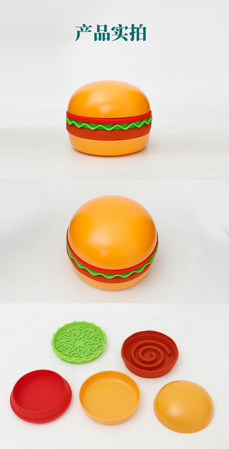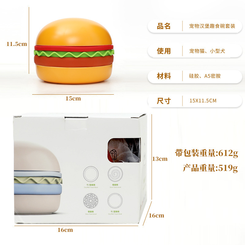 卖点:可爱汉堡造型,由碗底,慢食碗,舔食垫,底垫和上倾斜碗组成,上下碗密胺材质,中层夹心是硅胶材质