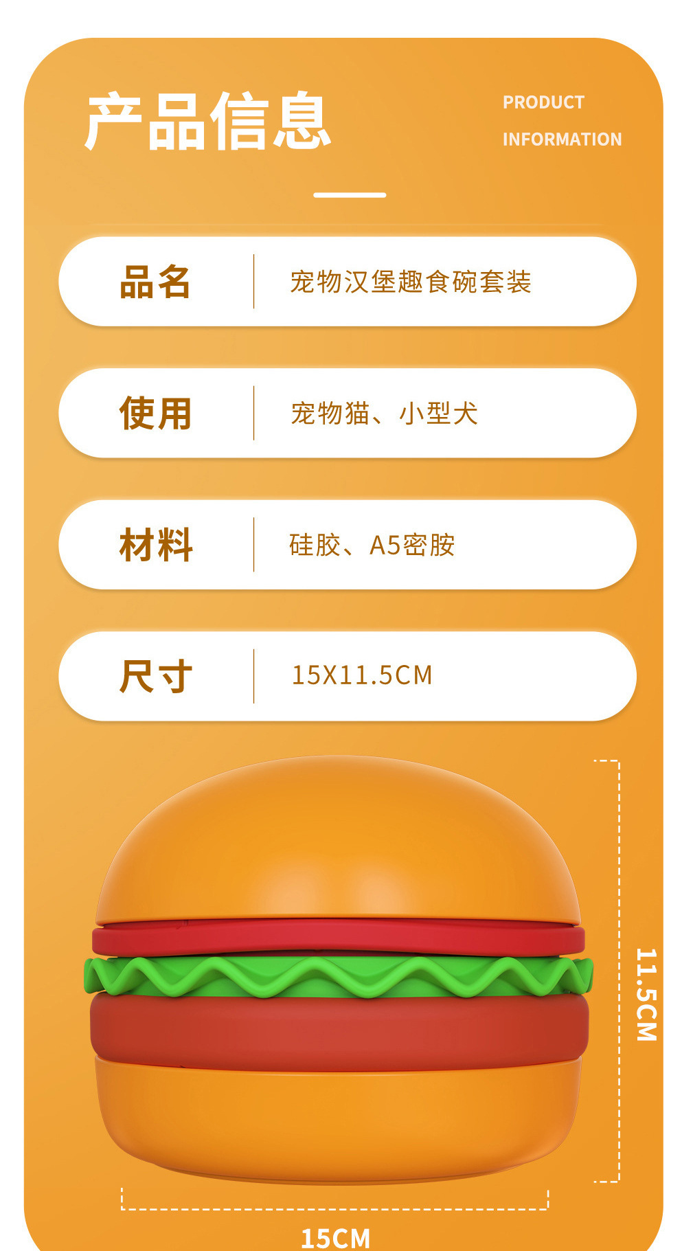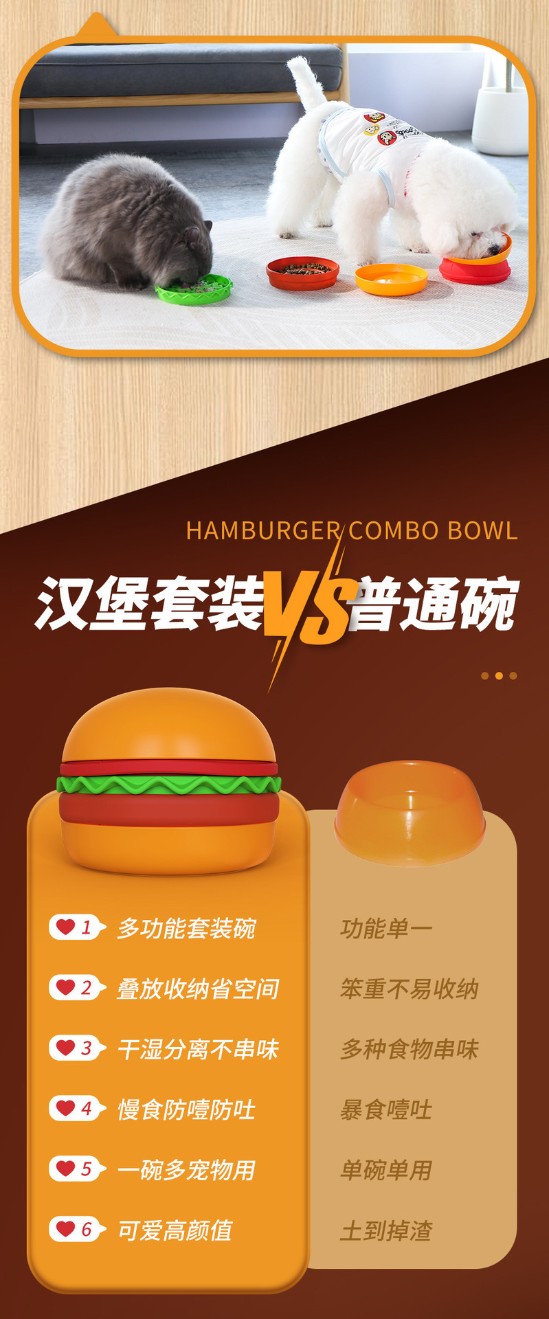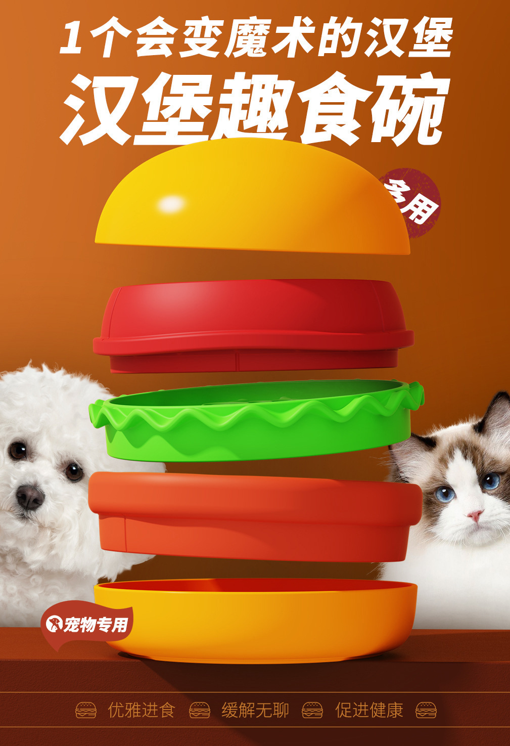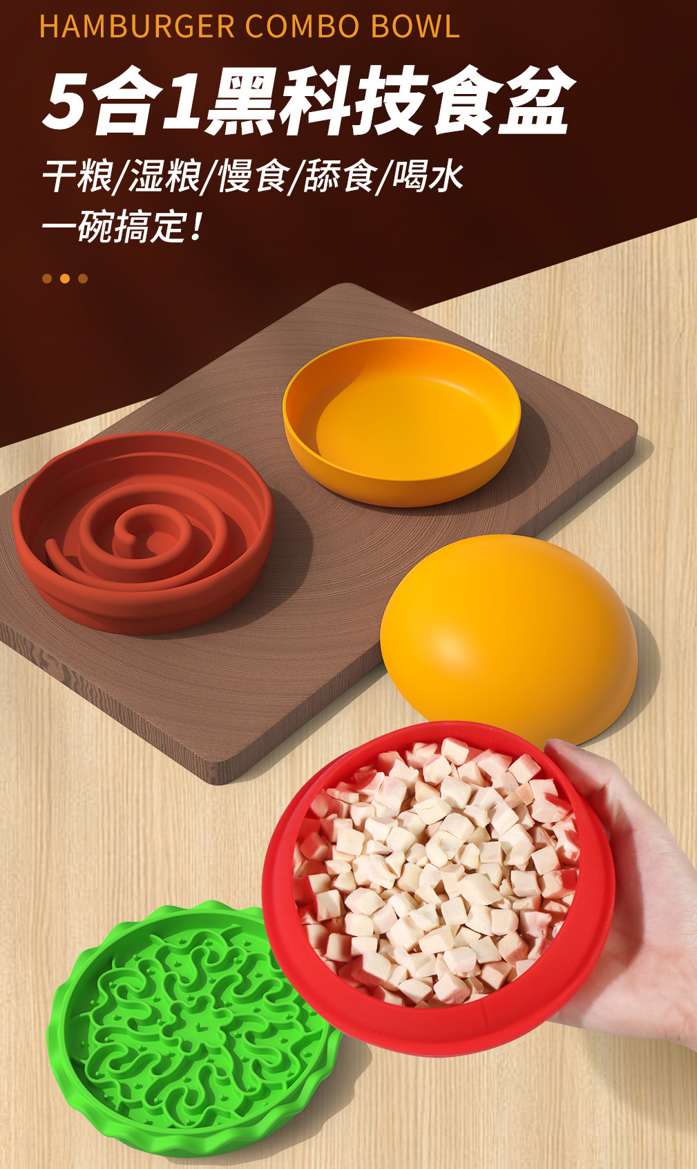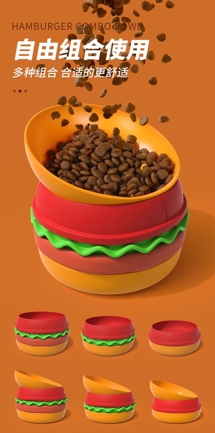 卖点:可爱汉堡造型,由碗底,慢食碗,舔食垫,底垫和上倾斜碗组成,上下碗密胺材质,中层夹心是硅胶材质