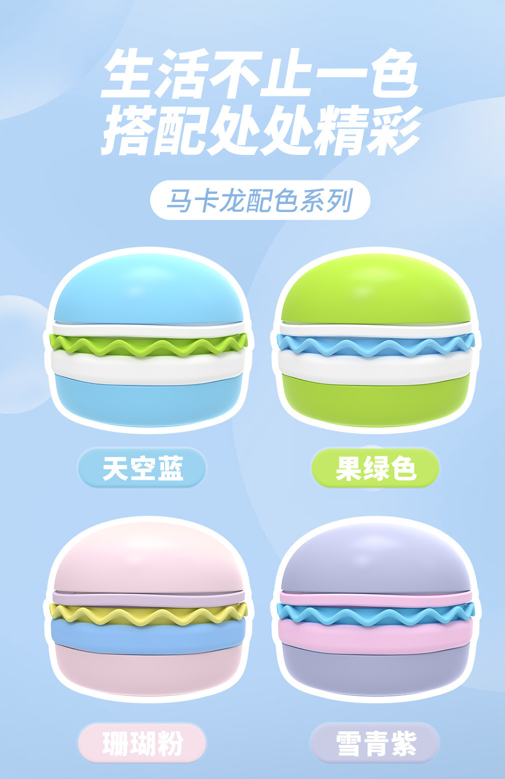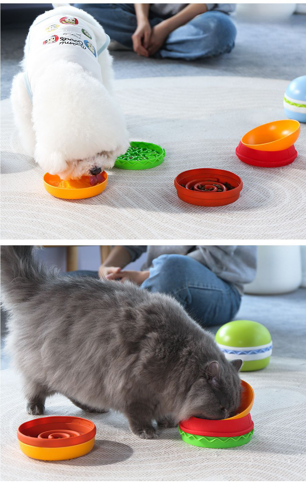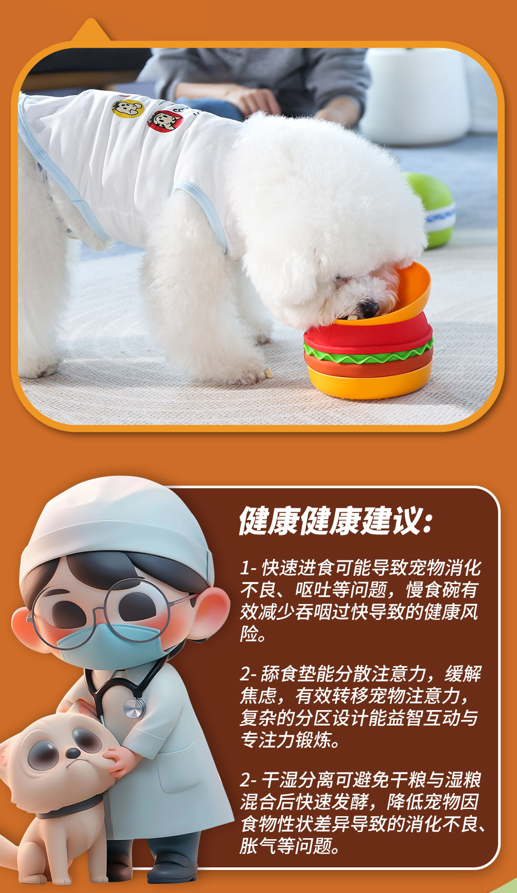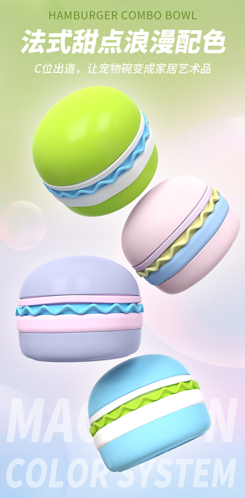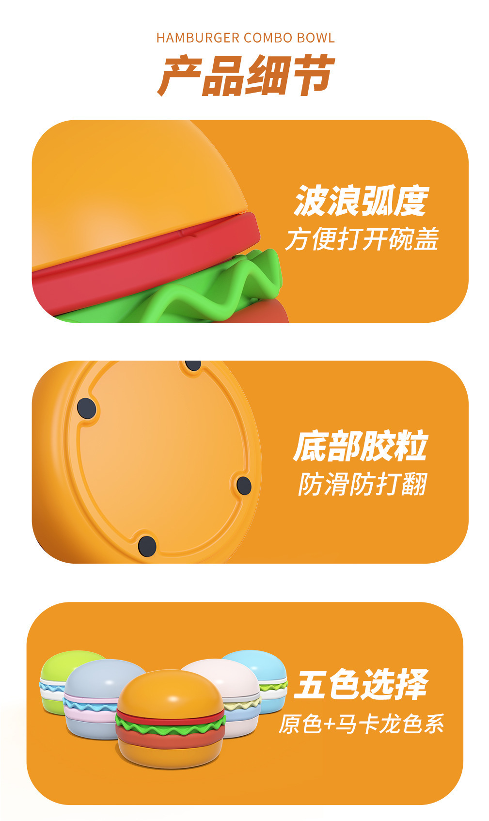 卖点:可爱汉堡造型,由碗底,慢食碗,舔食垫,底垫和上倾斜碗组成,上下碗密胺材质,中层夹心是硅胶材质